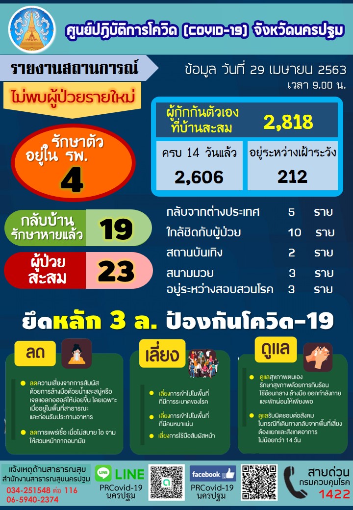 ซึ่งสถานการณ์โควิด-19 จังหวัดนครปฐม ประจำวันที่ 29 เมษายน 2563 ไม่พบผู้ป่วยรายใหม่เพิ่มต่อเนื่อง 4 วัน ตั้งแต่วันที่ 26 เม.ย.63 ผู้ป่วยกำลังรักษาอยู่ในโรงพยาบาล 4 รายเท่านั้น ผู้ป่วยที่รักษาหายและกลับบ้านได้แล้ว 19 ราย รวมสะสมผู้ยืนยันสะสมทั้งหมด 23 ราย และผู้ที่เฝ้าระวังสังเกตอาการตัวเองที่บ้าน 14 วัน 212 ราย