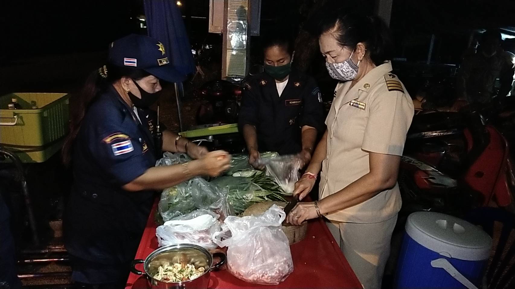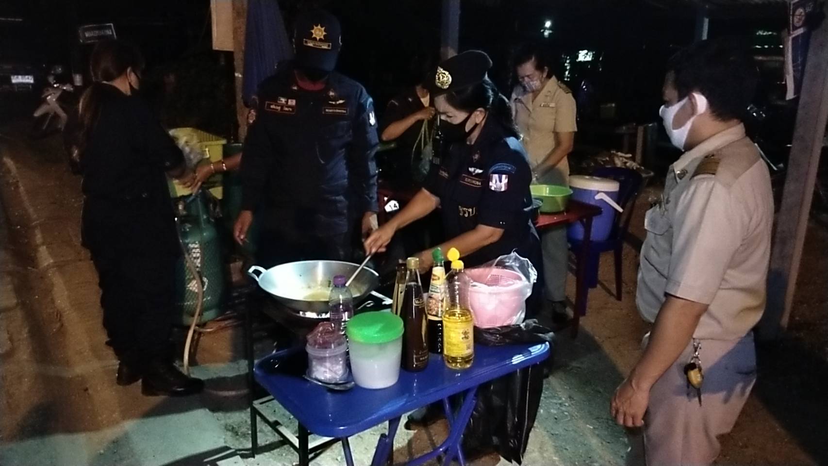 อีกทั้งทีมงานฝ่ายปกครองมีเจ้าหน้าที่เป็นจำนวนมาก ซึ่งหลังเลิกด่านทำให้เจ้าหน้าที่หิว ไม่สามารถที่จะหาอาหารได้หลังเลิกด่านเคอร์ฟิว ซึ่งทางทีมงานนั้นมีกลุ่มสตรี และจิตอาสา ได้นำเครื่องครัวรวมทั้งวัตถุดิบต่างๆในการประกอบอาหารมาร่วมด้วยช่วยกันทำอาหารกัน โดยจะมีเจ้าภาพในตำบลสลับกันทำอาหาร เลี้ยงให้ทีมงานฝ่ายปกครอง เพราะมีการตั้งจุดตรวจทุกวัน ทำให้เราต้องมีความคิดที่จะนำอาหารมาปรุงสดๆใหม่ๆ โดยทีมงานจะได้กินร้อน ช้อนกลาง ช้อนใครช้อนมัน ทำให้ถูกสุขลักษณะอีกทั้งยังเป็นการลดความเสี่ยงในการติดเชื้อโควิด-19 อีกด้วย../