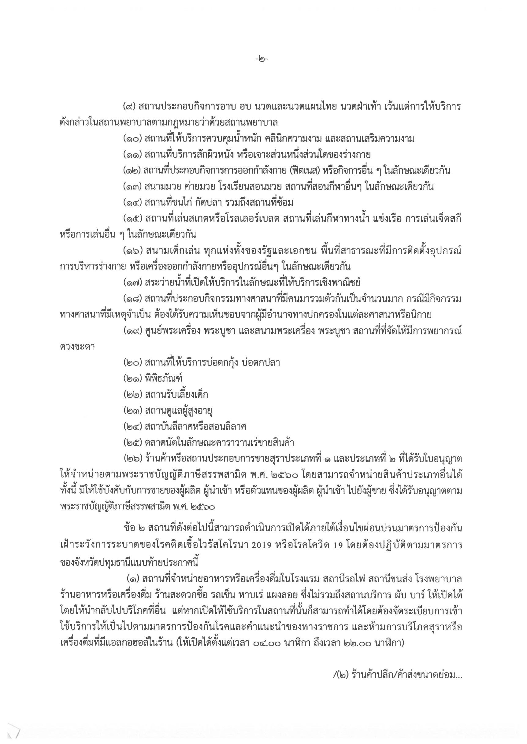 1. ห้างสรรพสินค้า ศูนย์การค้า ร้านค้าปลีกขนาดใหญ่ คอมมูนิตี้มอลล์ ห้างร้านที่มีร้านค้าย่อยในอาคารหรือบริเวณเดียวกัน เว้นแต่ ซุปเปอร์มาร์เก็ต ร้านขายยาหรือสินค้าเบ็ดเตล็ดที่จำเป็นต่อการดำรงชีพร้านอาหาร ให้เปิดเฉพาะการจำหน่ายอาหารเพื่อนำกลับไปบริโภคที่อื่น ธนาคาร ธุรกิจหลักทรัพย์ ธุรกรรมการเงิน ตู้เอทีเอ็ม ร้านจำหน่ายหรือเช่าหนังสือ ที่ทำการหน่วยงานของรัฐและรัฐวิสาหกิจ และร้านขายปลีกธุรกิจสื่อสารโทรคมนาคม 2. สถานที่จำหน่ายวัสดุอุปกรณ์ก่อสร้างขนาดใหญ่ บริเวณพื้นที่แสดงสินค้าในอาคาร(ไม่รวมถึงพื้นที่สำหรับการขนถ่ายสินด้) โดยมิให้นำสินค้หรือบริการที่จัดแสดงหรือจำหน่ายตามปกติภายในอาคารออกมาจำหน่ายหรือบริการภายนอกอาคาร 3.สถานศึกษาทุกระดับ และสถาบันกวดวิชา 4. สถานบันเทิง โรงภาพยนตร์ โรงละคร โรงมหรสพ 5.สถานบริการตามกฎหมายว่าด้วยสถานบริการ และสถานประกอบการที่เปิดให้บริการในลักษณะที่คล้ายกับสถานบริการ 6.สวนสนุก สถานที่เล่นโบว์ลิ่ง โต๊ะสนักเกอร์ บิลเลียด สนามแข่งรถ 7.ร้านเกมหรือตู้เกม ร้านอินเทอร์เน็ต และร้านคาราโอเกะ 8.สถานประกอบการเพื่อสุขภาพ (ร้านสปา ร้านนวดเพื่อสุขภาพ ร้านนวดเพื่อเสริมความงามสถานประกอบกิจการอาบน้ำ อบไอน้ำ อบสมุนไพร เว้นแต่การให้บริการดังกล่าวในสถานพยาบาลตามกฎหมายว่าด้วยสถานพยาบาล 9. สถานประกอบกิจการอาบ อบ นวดและนวดแผนไทย นวดฝ่าเท้า เว้นแต่การให้บริการดังกล่าวในสถานพยาบาลตามกฎหมายว่าด้วยสถานพยาบาล 10. สถานที่ให้บริการควบคุมน้ำหนัก คลินิกความงาม และสถานเสริมความงาม 11.สถานที่บริการสักผิวหนัง หรือเจาะส่วนหนึ่งส่วนใดของร่างกาย 12. สถานที่ประกอบกิจการการออกกำลังกาย (ฟิตเนส) หรือกิจการอื่น ๆ ในลักษณะเดียวกัน13. สนามมวย ค่ายมวย โรงเรียนสอนมวย สถานที่สอนกีฬาอื่นๆ ในลักษณะเดียวกัน14. สถานที่ชนไก่ กัดปลา รวมถึงสถานที่ซ้อม15. สถานที่เล่นสเกตหรือโรลเลอร์เบลต สถานที่เล่นกีฬาทางน้ำ แข่งเรือ การเล่นเจ็ตสกีหรือการเล่นอื่น ๆ ในลักษณะเดียวกัน 16. สนามเด็กเล่น ทุกแห่งทั้งของรัฐและเอกชน พื้นที่สาธารณะที่มีการติดตั้งอุปกรณ์การบริหารร่างกาย หรือเครื่องออกกำลังกายหรืออุปกรณ์อื่นๆ ในลักษณะเดียวกัน17. สระว่ายน้ำที่เปิดให้บริการในลักษณะที่ให้บริการเชิงพาณิชย์ 18. สถานที่ประกอบกิจกรรมทางศาสนาที่มีคนมารวมตัวกันเป็นจำนวนมาก กรณีมีกิจกรรมทางศาสนาที่มีเหตุจำเป็น ต้องได้รับความเห็นชอบจากผู้มีอำนาจทางปกครองในแต่ละศาสนาหรือนิกาย19. ศูนย์พระเครื่อง พระบูชา และสนามพระเครื่อง พระบูชา สถาน