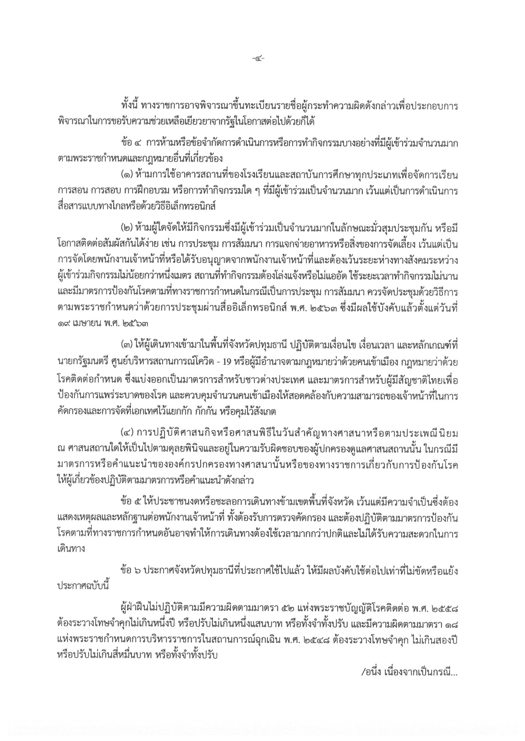 ดร.พินิจ บุญเลิศ ผู้ว่าราชการจังหวัดปทุมธานี ได้ออกคำสั่ง เรื่องปิดสถานที่ซึ่งมีโอกาสเสี่ยงต่อการแพร่ของโรคติดเชื้อไวรัสโคโรนา 2019 (COVID-19) ให้ปิดสถานที่ซึ่งมีโอกาสเสี่ยงต่อการแพร่โรคติดเชื้อไวรัสโคโรนา 2019 ในพื้นที่จังหวัดปทุมธานีมีผลตั้งแต่วันที่ 3 พฤษภาคม 2563 เป็นต้นไป ดังนี้ ตามที่ ได้มีประกาศสถานการณ์ฉุกเฉินในทุกเขตท้องที่ทั่วราชอาณาจักร ตั้งแต่วันที่ 26 มีนาคม พ.ศ. 2563 และได้ขยายระยะเวลาการบังคับใช้ประกาศสถานการณ์ฉุกเฉินออกไป จนถึงวันที่31 พฤษภาคม พ.ศ. 2563 นั้น เพื่อให้การบังคับใช้มาตรการต่าง ๆ ยังคงดำรงอยู่ต่อไปเพื่อยับยั้งการแพร่ระบาดของโรคโควิด- 19ไปสู่พื้นที่อื่นและป้องกันมิให้โรคกลับมาแพร่ระบาดใหม่ในพื้นที่ซึ่งเคยควบคุมได้ อาศัยอำนาจตามพระราชบัญญัติระเบียบการบริหารราชการแผ่นดิน ผศ. 2534 และที่แก้ไขเพิ่มเติม ข้อกำหนดออกตามความในมาตรา 9 แห่งพระราชกำหนดการบริหารราชการในสถานการณ์ฉุกเฉิน พ.ศ. 2548 ฉบับที่ 5 ข้อ 2 (6)และ (7) และมาตรา347) มาตรา 35 (1) แห่งพระราชบัญญัติโรคติดต่อ พ.ศ. 2558 ผู้ว่าราชการจังหวัดปทุมธานี โดยความเห็นชอบของคณะกรรมการโรคติดต่อจังหวัดปทุมธานี จึงให้มีประกาศ ดังนี้