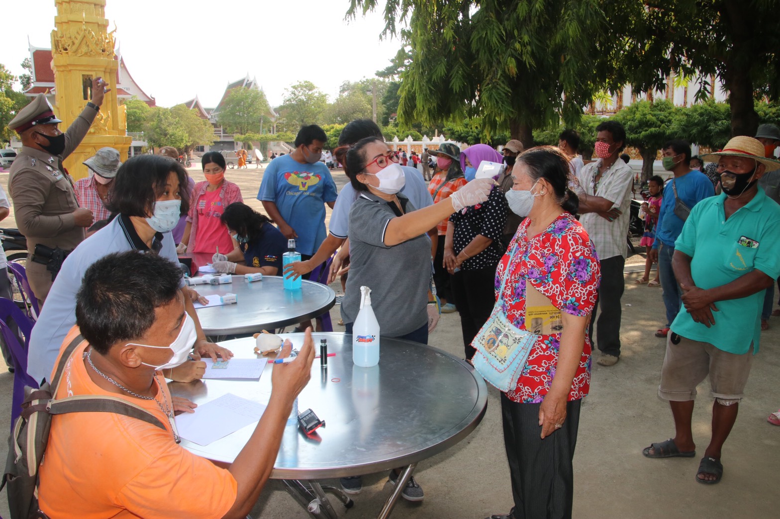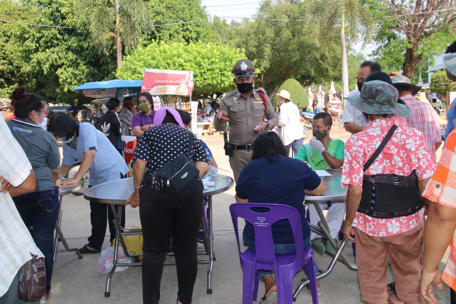 พร้อมด้วยเจ้าหน้าที่ตำรวจสายตรวจตำบลท่าผา ,เจ้าหน้าที่เทศบาลเมือง, อสม ร่วมด้วยช่วยกันคัดกรอง วัดไข้ จัดระยะห่างให้แก้ผู้ที่มาลงทะเบียนรับคูปองในการรับบริจาค