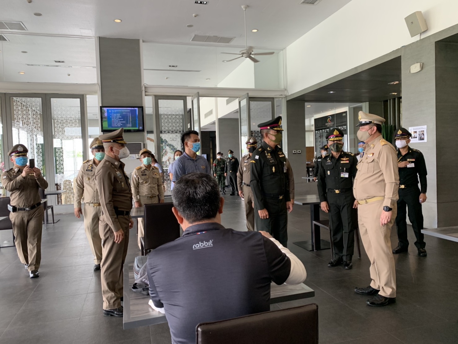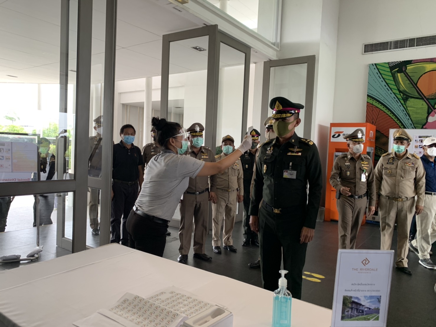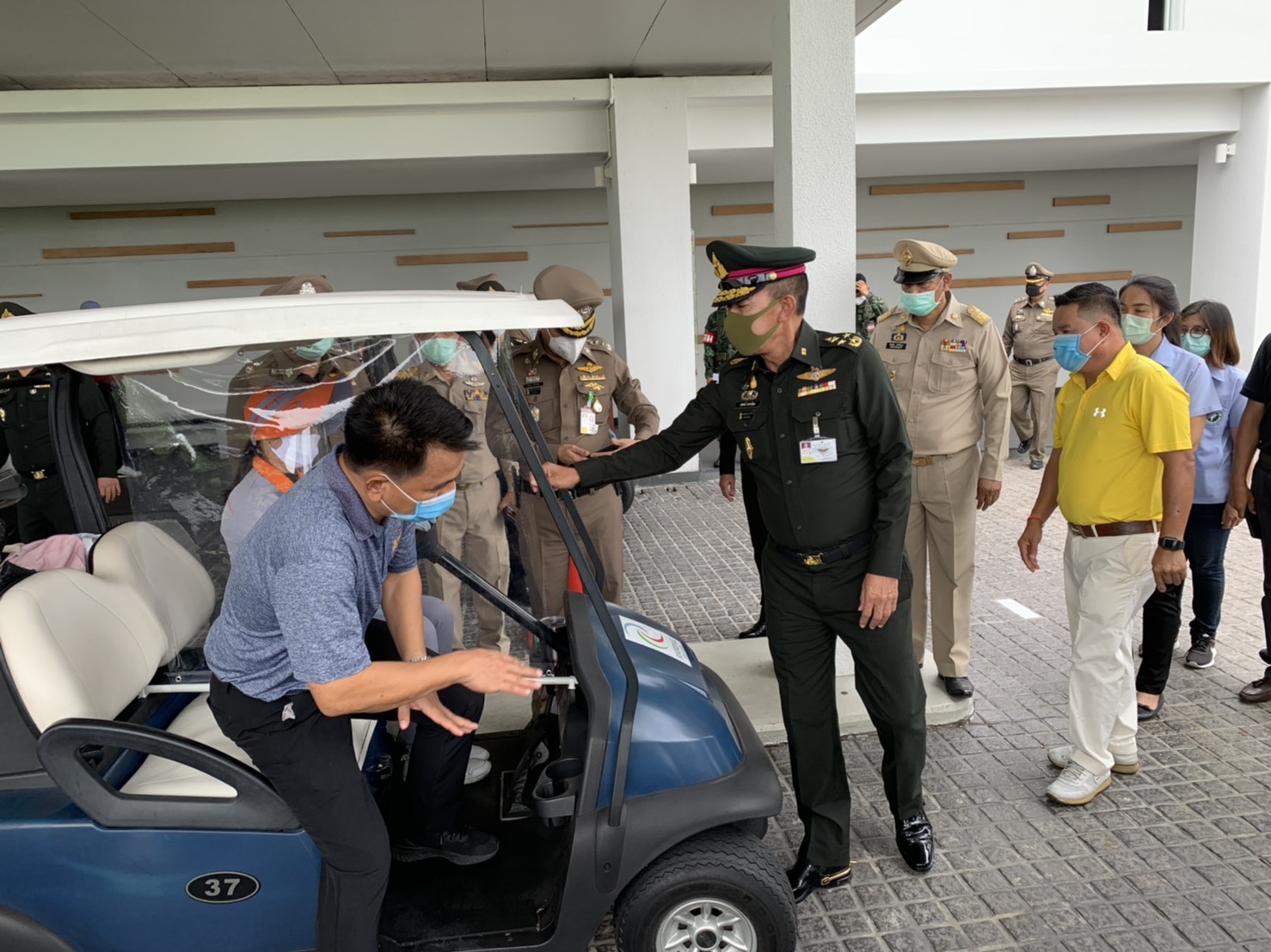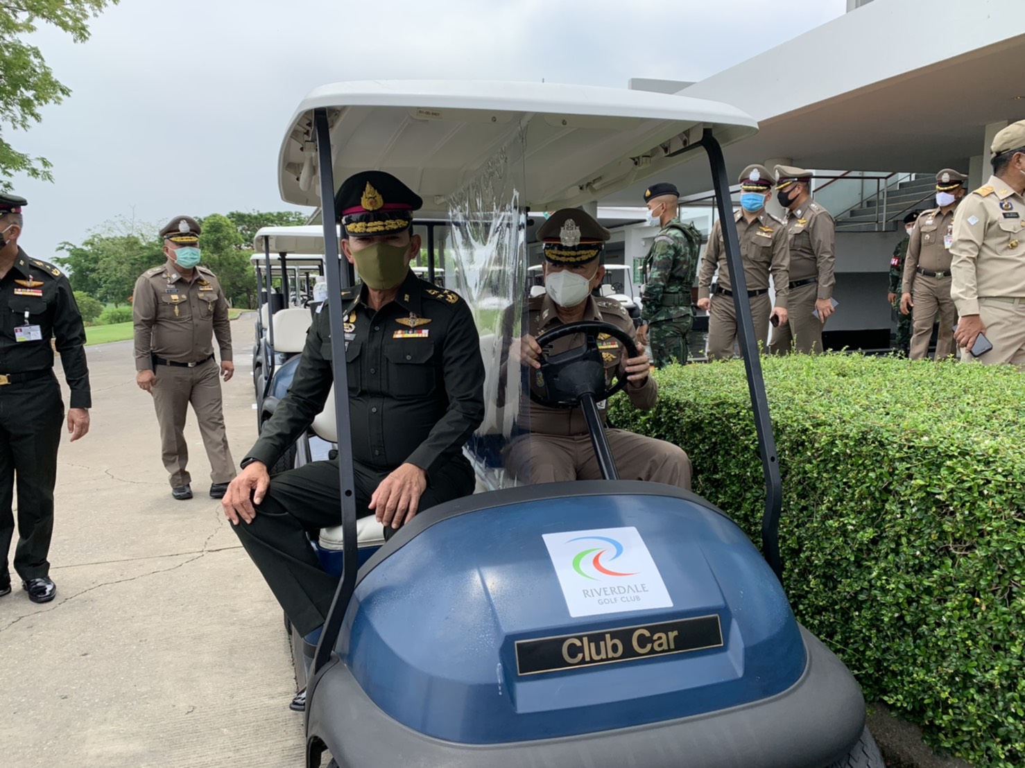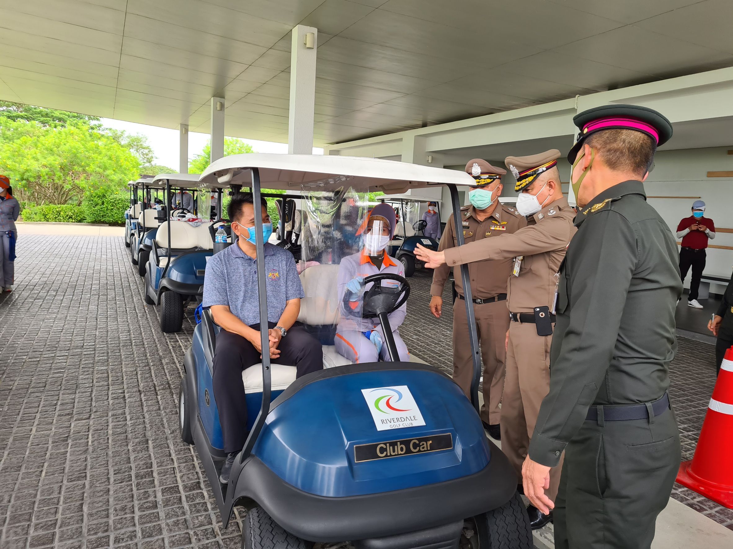 เมื่อช่วงบ่าย วันที่ 4 พ.ค. 63 พล.อ.สุพจน์ มาลานิยม รองเสนาธิการทหาร ( ผู้แทน ศปม. ) พร้อมด้วย พล.ต.ท.อำพล บัวรับพร ผบช.ภ.1 พล.ต.ต.ชยุต มารยาทตร์ ผบก.ภ.จว.ปทุมธานี นายชาธิป รุจนเสรี รอง ผวจ.ปทุมธานี นายสิทธิชัย สวัสดิ์แสน ปลัดจังหวัดปทุมธานี นายอาวุธ วิเชียรฉาย นอภ.เมืองปทุมธานี พ.ต.อ.ประวิทย์ บุญธรรม ผกก.สภ.ปากคลองรังสิต ทหาร จนท.ฝ่ายปกครอง จนท.สาธารณสุข เดินทางมาตรวจเยี่ยมสนามกอล์ “ฟริเวอร์เดล กอล์ฟ คลับ” และ สนามกอล์ฟ “บางกอก กอล์ฟ คลับ” ต.บ้านใหม่ อ.เมือง จ.ปทุมธานี หลังจากมีการปลดล็อคจาก พรก.ฉุกเฉิน เพื่อรับทราบการดำเนินการตามมาตรการการด้านความปลอดภัยและมาตรการความสะอาด หลังเปิดให้บริการตามมาตรการป้องกันการแพร่ระบาด ของเชื้อไวรัสโควิด-19 อย่างเคร่งครัด พร้อมให้ข้อเสนอแนะกับคณะผู้บริหารสนามกอล์ฟ โดยมีนายพงษ์ศักดิ์ ศัพท์เสน กก.ผจก.สนามกอล์ฟริเวอร์เดล กอล์ฟ คลับ และ นายเกียรติศักดิ์ เกตุศีริ ผู้จัดการทั่วไปฯ มาให้การต้อนรับ และนำพาชมการจัดการสถานที่ อาทิ จุดคัดกรองบริเวณล็อบบี้ พื้นที่พักคอย ห้องอาหาร ห้องซื้อตั๋วจำหน่ายอุปกรณ์ออกรอบ ห้องพักแคดดี้ โรงอาหาร และ ในสนามกอล์ฟ เป็นต้น