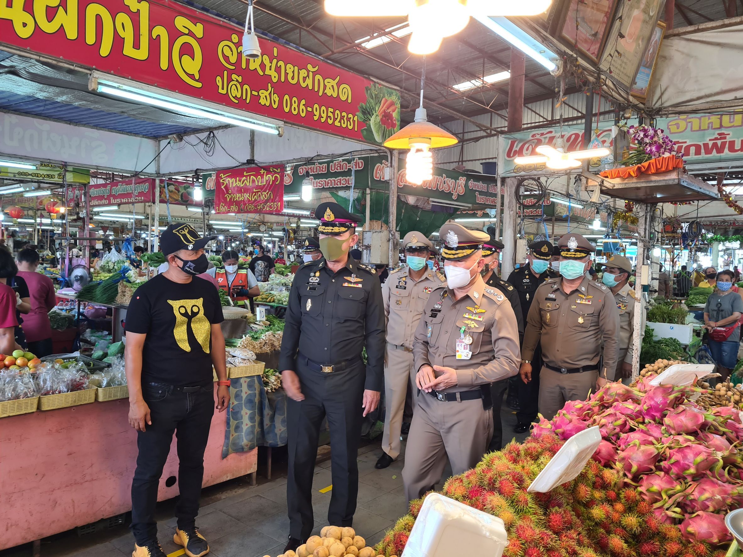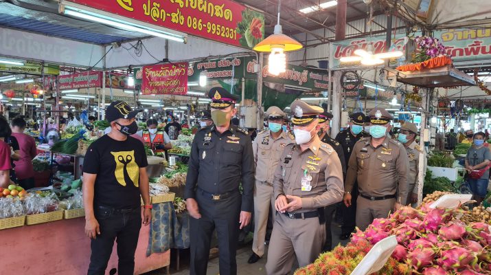 หลังจากนั้น พล.อ.สุพจน์ มาลานิยม รองเสนาธิการทหาร (รองเสนาธิการ ศปม.) พร้อมคณะทั้งหมด เดินทางไปตรวจเยี่ยมชมตลาดฐานเพชรปทุม ต.บ้านใหม่ อ.เมือง จ.ปทุมธานี โดยมีนายจันทวัฒน์ หัสกิจ กรรมการผู้บริหารตลาดฐานเพชรปทุม ให้การต้อนรับพร้อมนำพาบริเวณภายในตลาดที่มีการคัดกรองและตรวจวัดอุณหภูมิพ่อค้าแม่ค้าก่อนเข้ามาทำการขายภายในตลาด รวมทั้งมี จนท.คอยตรวจวัดอุณหภูมิกับประชาชนที่เดินทางมาจับจ่ายใช้สอย โดยทุกร้านพ่อค้าแม่ค้าต้องสวมสวมหน้ากากผ้า หรือหน้ากากอนามัยไว้ตลอดเวลา เช่นเดียวกับลูกค้าก็ต้องสวมหน้ากากอนามัยเช่นกัน และจะต้องยืนซื้อสินค้าให้ห่างตามระยะที่กำหนด โดย รองเสนาธิการ ศปม.ได้กล่าวชื่นชมมาตรการที่ทางตลาดและสนามกอล์ฟทั้งสองแห่ง จัดเตรียมไว้ได้ดีเป็นแบบอย่าง พร้อมจะเสนอต่อที่ประชุมว่า จะให้ทาง ตร.ภาค 1 เป็นโมเดลต้นแบบในการดำเนินการมาตรการป้องกันการแพร่ระบาดเชื้อโควิด-19 ได้ดีแบบนี้และเป็นแบบอย่างที่ดี จากนั้นจึงเดินทางกลับทันที