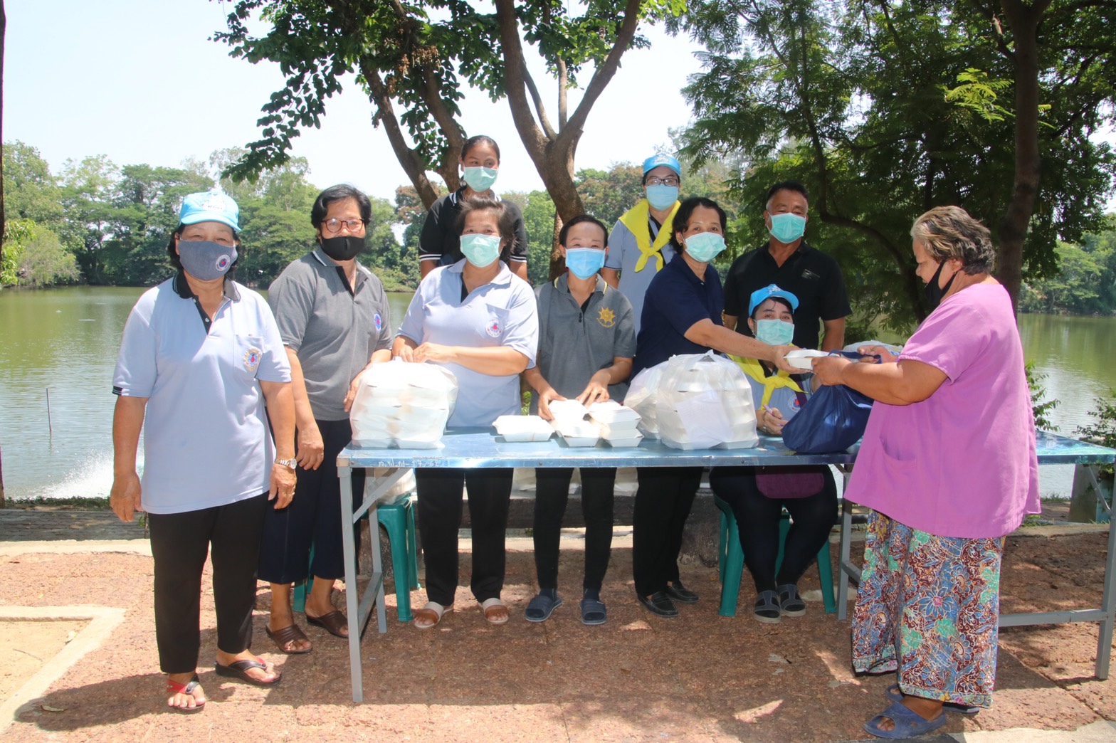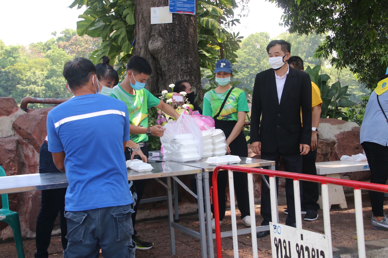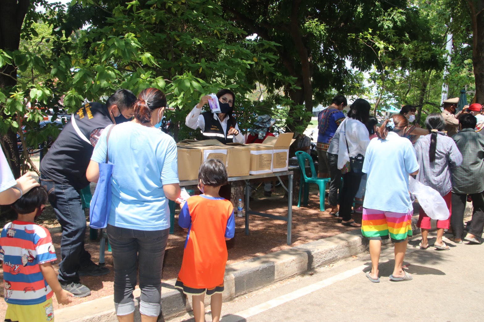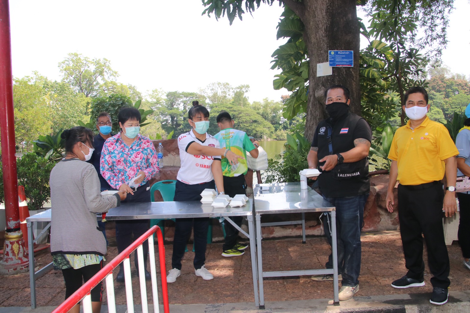 โดยมีนายรณภพ เวียงสิมมา นายอำเภอบ้านโป่ง นายคเชนท์ พูลจันทร์ ผู้จัดการส่วนสัมพันธ์ SCG โรงงานบ้านโป่ง นายนิสันต์ ง่วนสำอางค์ (กำนันฉุย) กำนันตำบลท่าผา ตัวแทนบริษัทราชาชูรส ตัวแทน บริษัท ยูทิลิตี้ ร.ต.ท. สุชาติ สุขแป้น หัวหน้าสายตรวจตำบลท่าผา หัวหน้าส่วนราชการเทศบาลเมืองท่าผา, ผู้ใหญ่บ้าน,สารวัตรกำนัน,แพทย์ ,ผู้ช่วย ร่วมแจกข้าวและหน้ากาก , แอลกอฮอล์เจล, และเจ้าหน้าที่ ป้องกัน ,อสม. รวมด้วยช่วยกันตรวจคัดกรองจัดระยะห่างเพื่อไม่ให้เกิดการแพร่กระจายเชื้อ ครั้งที่ 1 ที่สระน้ำโกสินารายณ์ หมู่ที่ 19 ตำบลท่าผา อำเภอบ้านโป่ง จังหวัดราชบุรี