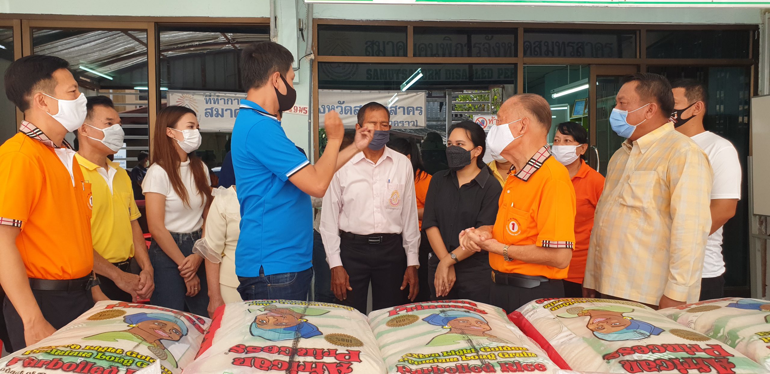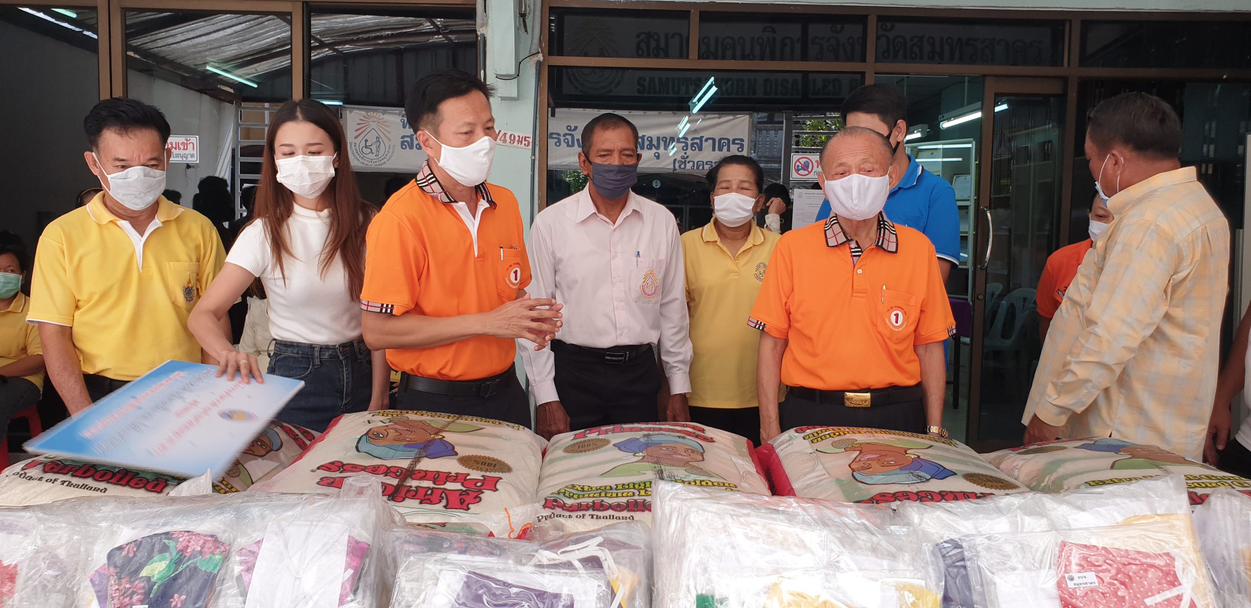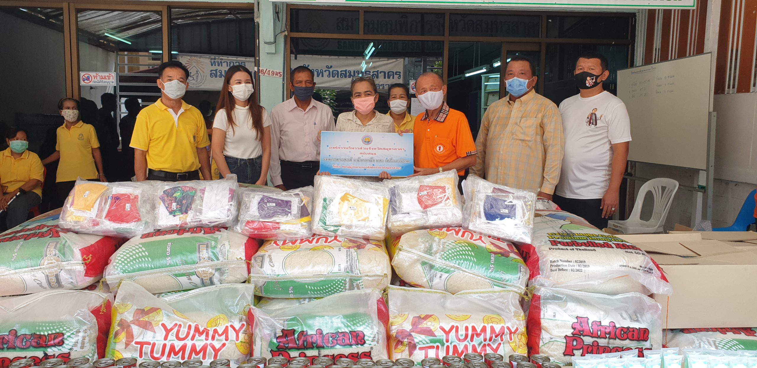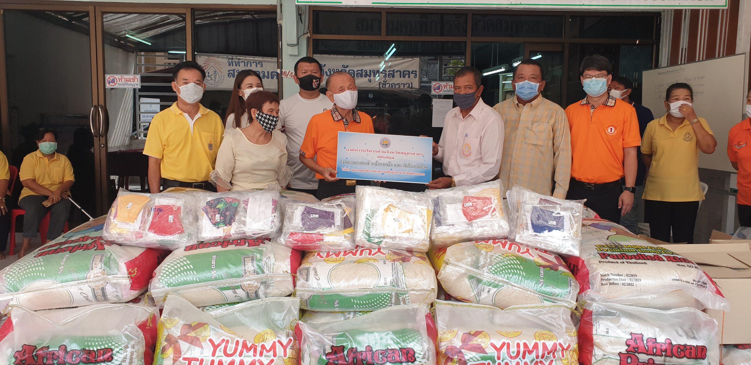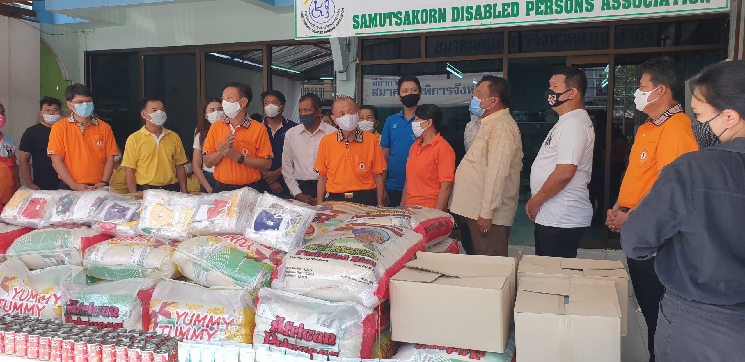 เมื่อเวลา 09.30 น. ของวันที่ 7 พฤษภาคม 2563 นายมณฑล ไกรวัตนุสสรณ์ นายก อบจ.สมุทรสาคร พร้อมด้วย นายจอม หงษ์เวียงจันทร์ ปลัด อบจ.สมุทรสาคร,นายอุดม ไกรวัตนุสสรณ์ ผู้ประสานงาน อบจ.สมุทรสาคร,นายอภิชาต โพธิ์ถนอม รองนายก อบจ.สมุทรสาคร, ด.ต.พงษ์ศักดิ์ เติมสายทอง ส.อบจ.สมุทรสาคร, คณะที่ปรึกษา และเจ้าหน้าที่ขององค์การบริหารส่วนจังหวัดสมุทรสาคร ได้ร่วมกันนำข้าวสารอาหารแห้งไปมอบให้แก่สมาคมคนพิการจังหวัดสมุทรสาคร ในหมู่บ้านพัธนชัย ต.คลองมะเดื่อ อ.กระทุ่มแบน จ.สมุทรสาคร โดยมีนายเกษม จันทร์คง นายกสมาคมคนพิการจังหวัดสมุทรสาคร และผู้แทนสมาคม/ชมรมคนพิการ 6 ประเภท ได้แก่สมาคมคนพิการทางการเคลื่อนไหวจังหวัดสมุทรสาคร,สมาคมคนตาบอดจังหวัดสมุทรสาคร,ชมรมเพื่อนช่วยเพื่อนสมุทรสาคร,ชมรมคนหูหนวกจังหวัดสมุทรสาคร ,ชมรมผู้ปกครองคนพิการทางสติปัญญาจังหวัดสมุทรสาคร และ ชมรมผู้ปกครองออทิสติกจังหวัดสมุทรสาคร เข้าร่วม