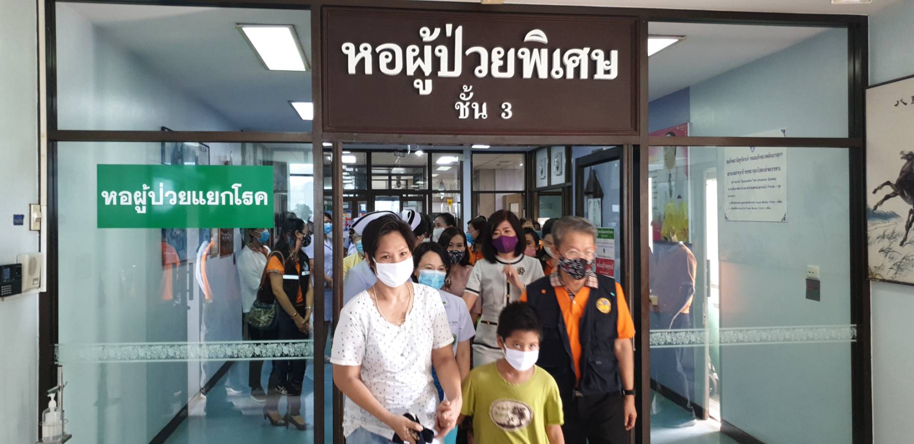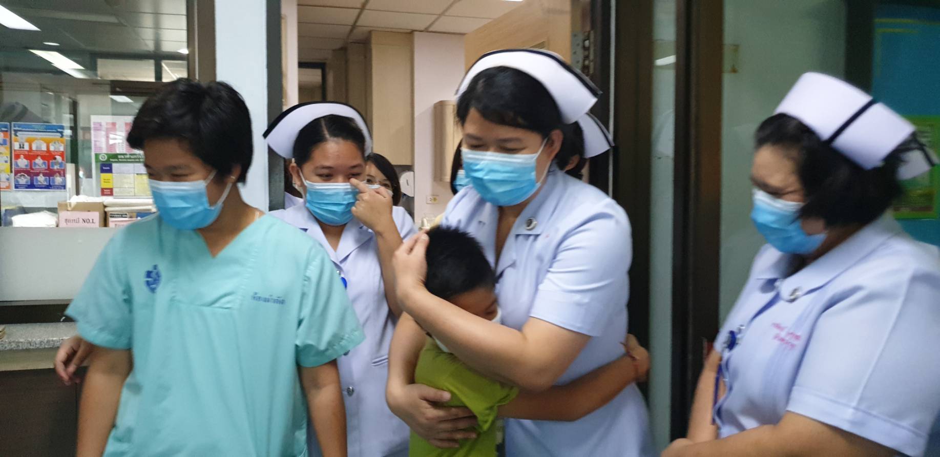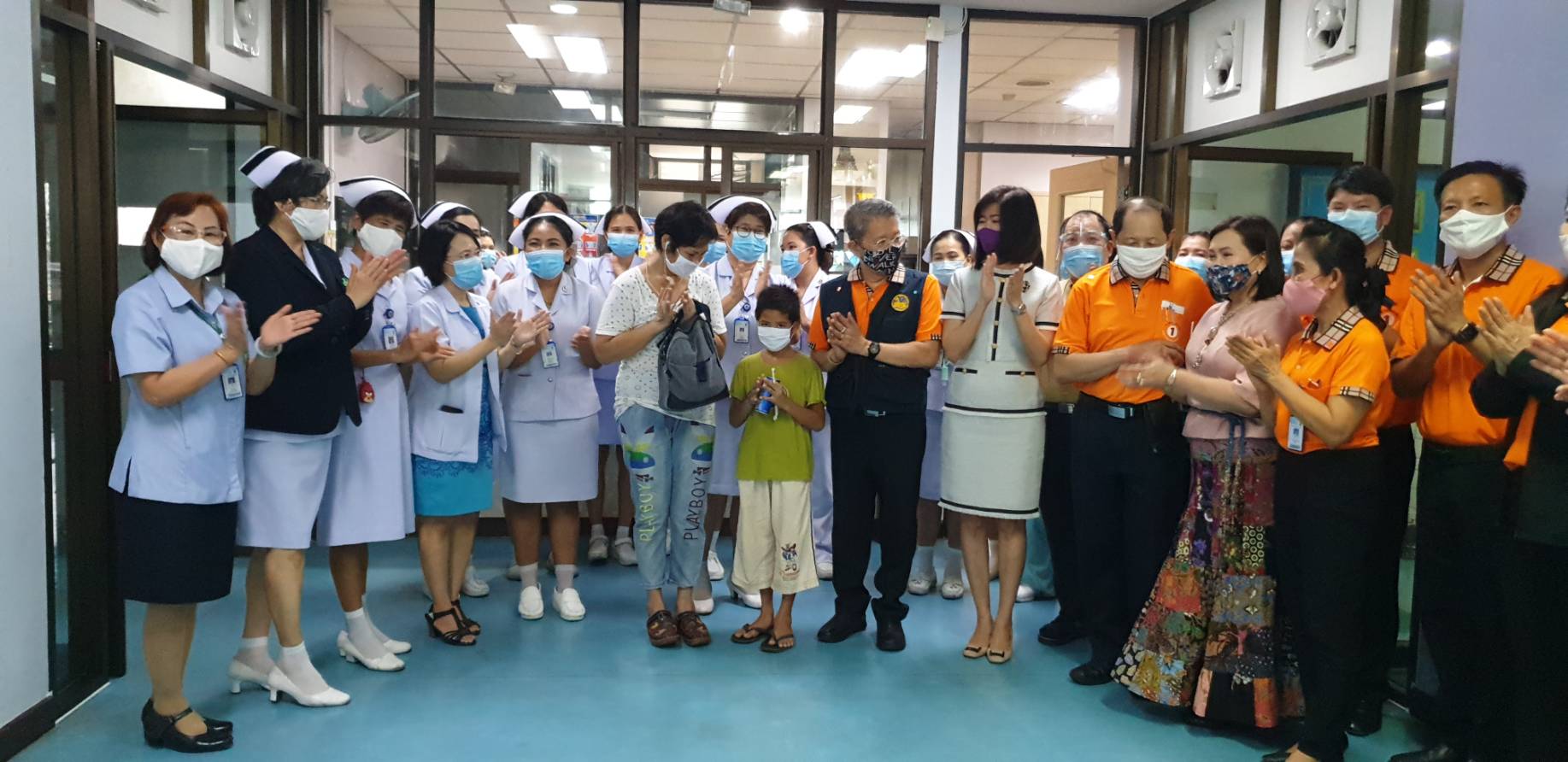 โดยก่อนที่สองแม่ลูกจะจากทีมแพทย์ พยาบาลและบุคลากรที่ดูแลกันมาอย่างยาวนานเกือบ 1 เดือนนั้น นอกจากนางบัว ผู้ติดเชื้อโควิด-19 จะกล่าวขอบคุณที่ทุกคนให้การดูแลรักษาอย่างดีจนหายเป็นปกติไม่มีเชื้อโควิดแล้ว ทางด้านของน้องบาสลูกชายวัย 10 ปี ก็ยังได้เดินกอดพี่หมอและพี่พยาบาลทุกคน ที่อยู่เป็นเพื่อนน้องบาส คอยดูแลน้องบาสแทนแม่ยามที่แม่ป่วยรักษาตัวอยู่ที่โรงพยาบาลกระทุ่มแบน แม้น้องบาสจะโชคดีไม่ได้ติดเชื้อโควิดฯ จากแม่ แต่ก็ต้องมานอนแยกห้องที่โรงพยาบาลด้วยฯ เพราะประการแรกน้องบาสต้องถูกกักตัว 14 วัน เฝ้าสังเกตอาการเนื่องจากอยู่ใกล้ชิดและสัมผัสกับผู้ติดเชื้อ และ ประการที่สองคือ น้องบาสมีเพียงแม่คนเดียวเท่านั้น จึงอยู่ด้วยกัน 2 คนมาตลอด ไม่มีเคยแยกจากกันและไม่มีญาติพี่น้องที่ไหน ดังนั้นเมื่อแม่เข้ารับการรักษาตัวตั้งแต่วันที่ 11 เมษายน ทางโรงพยาบาลจึงต้องรับน้องบาสมาเฝ้าดูอาการด้วย และแม้น้องบาสจะผ่านพ้น 14 วันปลอดภัยดีแล้ว แต่น้องบาสก็ยังคงต้องอยู่ที่โรงพยาบาลต่อไปจนกว่าแม่จะหายดีไม่พบเชื้ออีก น้องบาสจึงกลายเป็นที่รักของพี่หมอและพี่พยาบาลทุกคน จนกระทั่งวันที่รอคอยก็มาถึงคือวันนี้ วันที่ผลตรวจของแม่บัวออกมากลายเป็นลบ
