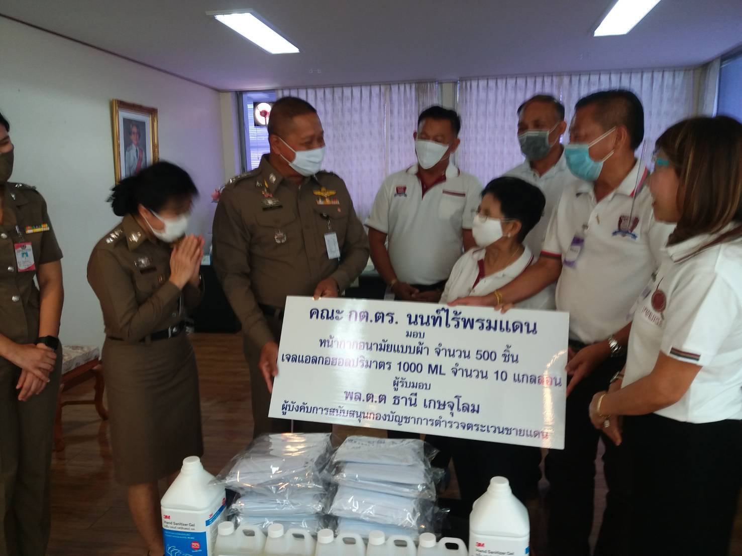 นางกฤษณา ศิริพัฒน์ ประธาน คณะ กต.ตร.นนท์ไร้พรมแดน ดร.สิทธิศักดิ์ เจียวพงษ์พิพัฒน์ รองประธาน กต.ตร.นนท์ ไร้พรมแดน ได้นำคณะ กต.ตร. นนท์ ไร้พรมแดนเข้ามอบสิ่งของให้กับท่านพลตำรวจตรีธานี เกษจุโลม ผู้บังคับการสนับสนุน กองบัญชาการตำรวจตระเวนชายแดน เพื่อให้ท่านนำไปมอบให้กับเจ้าหน้าที่ตำรวจตระเวนชายแดนที่อยู่ตามชายแดนแต่ละจังหวัดเพื่อป้องกันการแพร่ระบาดของเชื้อโรคโคโรน่า 2019 โควิด-19 และยังเป็นขวัญและกำลังใจให้กับเจ้าหน้าที่ตำรวจตระเวนชายแดนที่ปฏิบัติหน้าที่ตามแนวชายแดนซึ่งเป็นรั้วของประเทศชาติและสร้างความอุ่นใจให้กับเจ้าหน้าที่ตำรวจตระเวนชายแดนในครั้งนี้ซึ่งทาง คณะ กต.ตร.นนทไร้พรมแดน ได้มามอบสิ่งของอาทิเช่น 1.หน้ากากอนามัยชนิดผ้า สามารถซักได้จำนวน 500 ชิ้น 2.เจลแอลกอฮอล์ ปริมาณ 1,000 ซีซี จำนวน 10 แกลลอน เพื่อให้ท่านนำไปมอบให้เจ้าหน้าที่ตำรวจตระเวนชายแดนที่ปฏิบัติหน้าที่ต่อไป