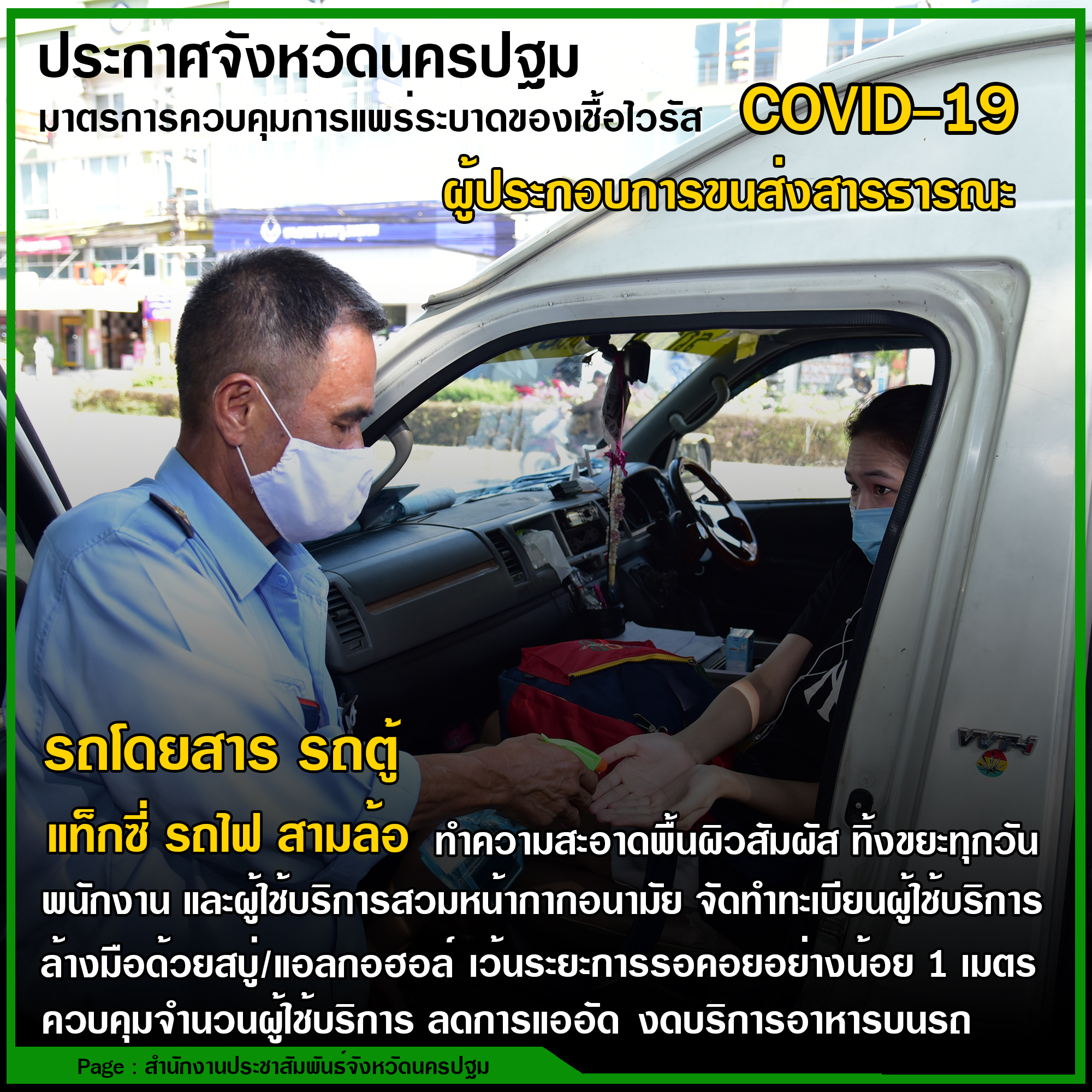 จังหวัดนครปฐม ประกาศมาตรการควบคุมการแพร่ระบาดของโรคติดเชื้อไวรัส COVID-19 สำหรับผู้ประกอบการขนส่งด้วยรถโดยสารสาธารณะ และรถยนต์สาธารณะ