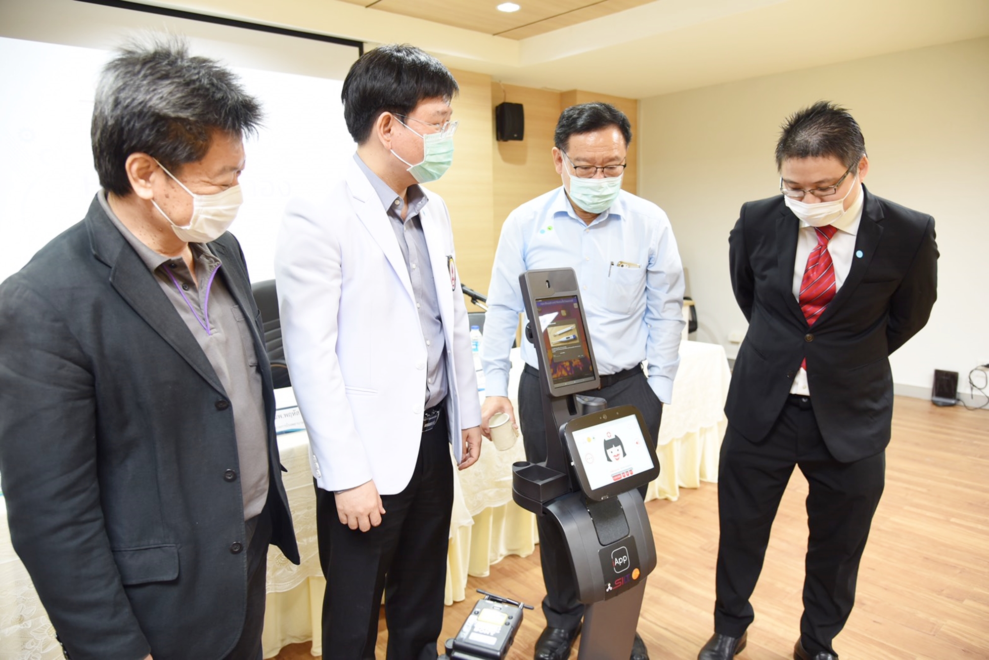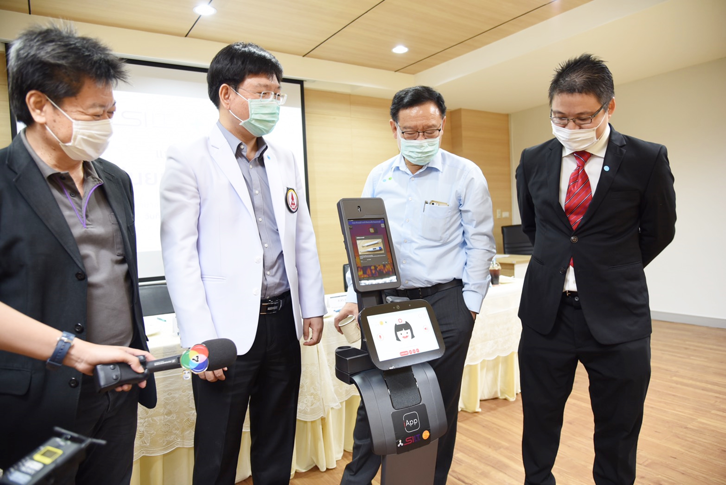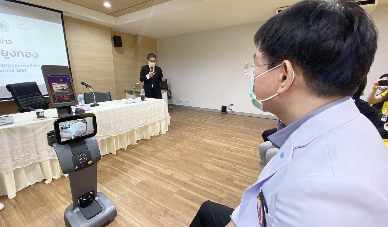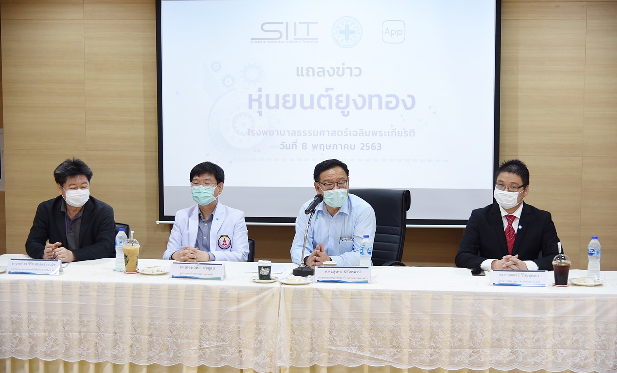 อาจารย์ ดร.วิรัช ศรเลิศล้าวาณิช สถาบันเทคโนโลยีนานาชาติสิรินธร มหาวิทยาลัยธรรมศาสตร์ และ ดร.กอบกฤตย์ วิริยะยุทธกร ผู้บริหาร iApp Technology Co.,Ltd ได้ร่วมกันแถลงข่าวเปิดตัวหุ่นยนต์ยูงทอง ที่ใช้แทนบุคลากรทางการแพทย์ ในการรักษาคนไข้ เพื่อลดความเสียงต่อการติดเชื้อโรคต่างๆ