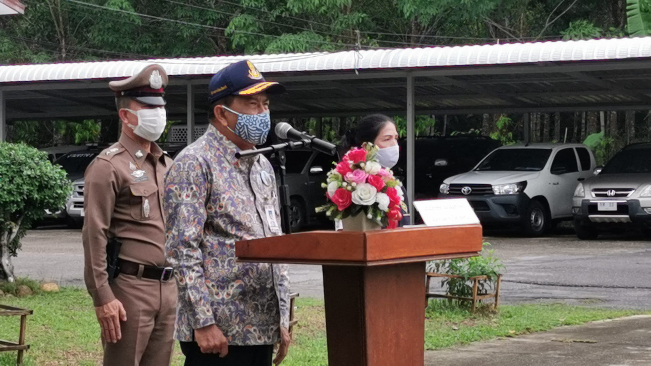 ทางด้าน พล.ต.ต.ถาวร แสงฤทธิ์ ผู้บังคับการตำรวจภูธรจังหวัดตรัง ได้กล่าวว่า ขอบคุณผู้ว่าราชการจังหวัดตรังที่ได้ให้เกียรติเยี่ยมและให้กำลังใจการปฏิบัติงานของข้าราชการตำรวจ พร้อมให้โอวาทแก่ข้าราชการตำรวจ ซึ่งสืบเนื่องจากที่ปฏิบัติภารกิจร่วมกัน ซึ่งที่ผ่านมาจากการนำของผู้ว่าราชการจังหวัด ได้ส่งผลให้ผลการปฏิบัติเป็นที่น่าพึงพอใจ แต่อย่างไรก็ตามภารกิจก็ยังไม่เสร็จสิ้น ในช่วงที่ผ่อนคลายมาตรการเราก็ต้องมีหน้าที่ที่จะต้องดำเนินการในเรื่องสายตรวจร่วม สายตรวจร่วมมีหน้าที่ไปเตือน ไปแนะนำ ไปบอกกล่าวให้ผู้ประกอบการก็ดี ผู้ที่จะต้องถูกกักตัวก็ดีจะต้องปฏิบัติตามมาตรการของเจ้าพนักงานควบคุมโรคที่ให้คำแนะนำไว้ สุดท้ายก็เชื่อว่าการระบาดของเชื้อไวรัสโคโรนา 2019 จะหมดสิ้นไปในอนาคต