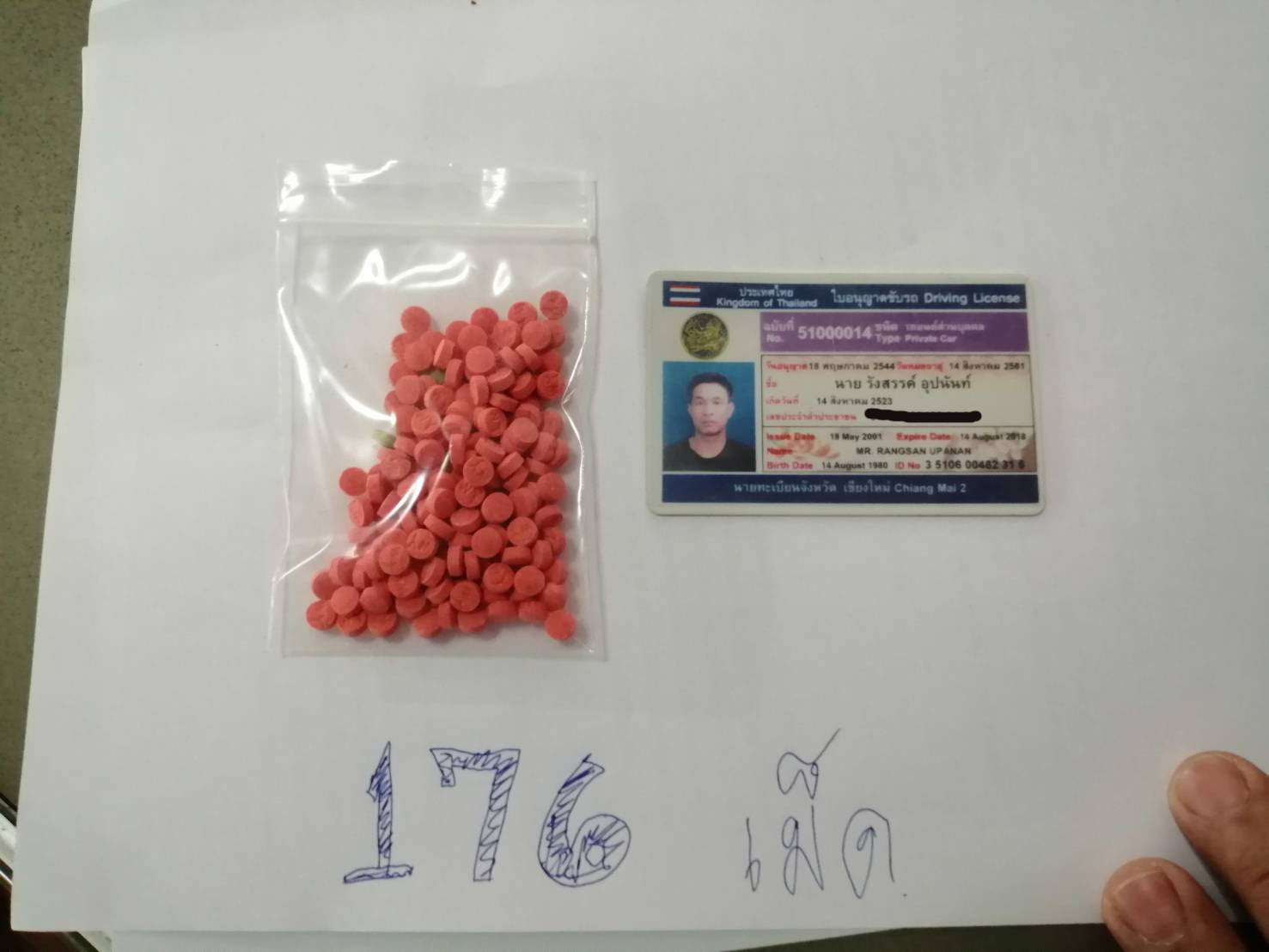 โดยใช้รถยนต์ ยี่ห้อ อีซูซุ สีดำ หมายเลขทะเบียน 2ฒศ 632 กรุงเทพมหานคร เป็นพาหนะเมื่อถึงเวลาดังกล่าวเจ้าหน้าที่ชุดจับกุมพบรถยนต์ ยี่ห้อ อีซูซุ สีดำ หมายเลขทะเบียน 2ฒศ 632 กรุงเทพมหานคร ขับขี่มาจาก อ.เชียงดาว มุ่งหน้าไปทาง อ.แม่ริม ซึ่งมี นาย ทศพล ขุนคำ (ทราบชื่อภายหลัง) เป็นผู้ขับขี่รถคันดังกล่าว ซึ่งตรงกับที่ได้รับแจ้งจากสายลับและแสดงท่าทีมีพิรุธ เจ้าหน้าที่ชุดจับกุมจึงได้ตรวจค้นรถยนต์คันดังกล่าว ผลการตรวจค้นพบ ของกลางลำดับที่ 1 บรรจุอยู่ในถุงพลาสติกขาวขุ่นห่อหุ้ม ซุกซ่อนอยู่ในถุงหุ้มคันโยกเกียร์ สีฟ้าประทับตราโดเรม่อน อยู่ใต้คอนโซนหน้าคนขับจำนวน 176 เม็ด รับสารภาพยาบ้าเป็นของตนเองเจ้าหน้าที่นำตัวส่งพนักงานสอบสวนเพื่อดำเนินคดีตามกฏหมายแล้ว