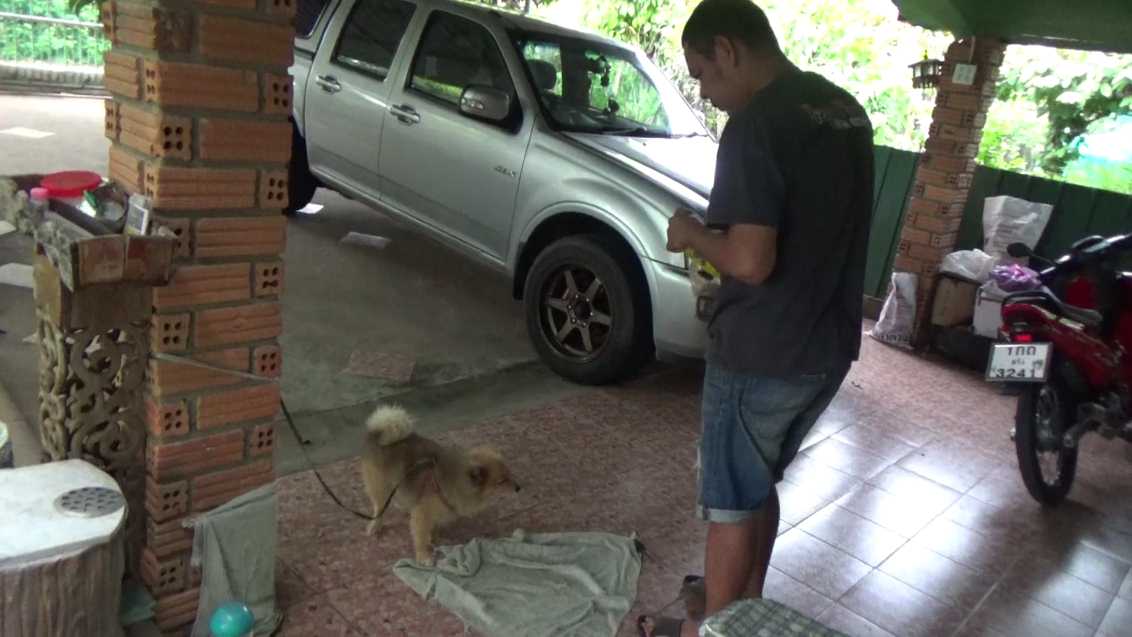 ส่วนอีกตัวเป็นสุนัขพันธุ์ปอม เพศผู้อายุประมาณ 10 ปีชื่อเจ้าน้ำแข็ง ตัวนี้ยกมือไหว้ขออาหารกับทุกคนที่เดินเข้ามาในบ้าน แม้กระทั่งคนแปลกหน้าขอให้มีขนมถืออยู่ในมือ เจ้าน้ำแข็งยกมือไหว้หมด และยกมือไหว้ทุกครั้งที่ขออาหาร ซึ่งทั้งแมวและสุนัขที่บ้านหลังนี้ ได้สร้างรอยยิ้มให้กับเจ้าของและผู้พบเห็นได้เป็นอย่างมาก โดยนายปกครอง พรอนุวงศ์ เจ้าของบ้านเล่าว่า เจ้าน้ำมันตอนพบเป็นลูกแมวอายุประมาณ 1 เดือนคาดหนีสุนัขไล่กัดจึงเข้าไปหลบอยู่ใต้ฝากระโปรงรถของตน จนรุ่งขึ้นอีกวันจึงพบและตั้งชื่อว่าเจ้าน้ำมันหรือขี้มัน ซึ่งได้บอกเขาว่าเป็นแมวหากินเองไม่ได้ ก็ต้องช่วยทำงาน ช่วยบีบนวดแลกอาหารนะ เจ้าน้ำมันก็ยอมทำตาม ซึ่งเมื่อได้บีบนวดให้ก็พอใจแล้ว