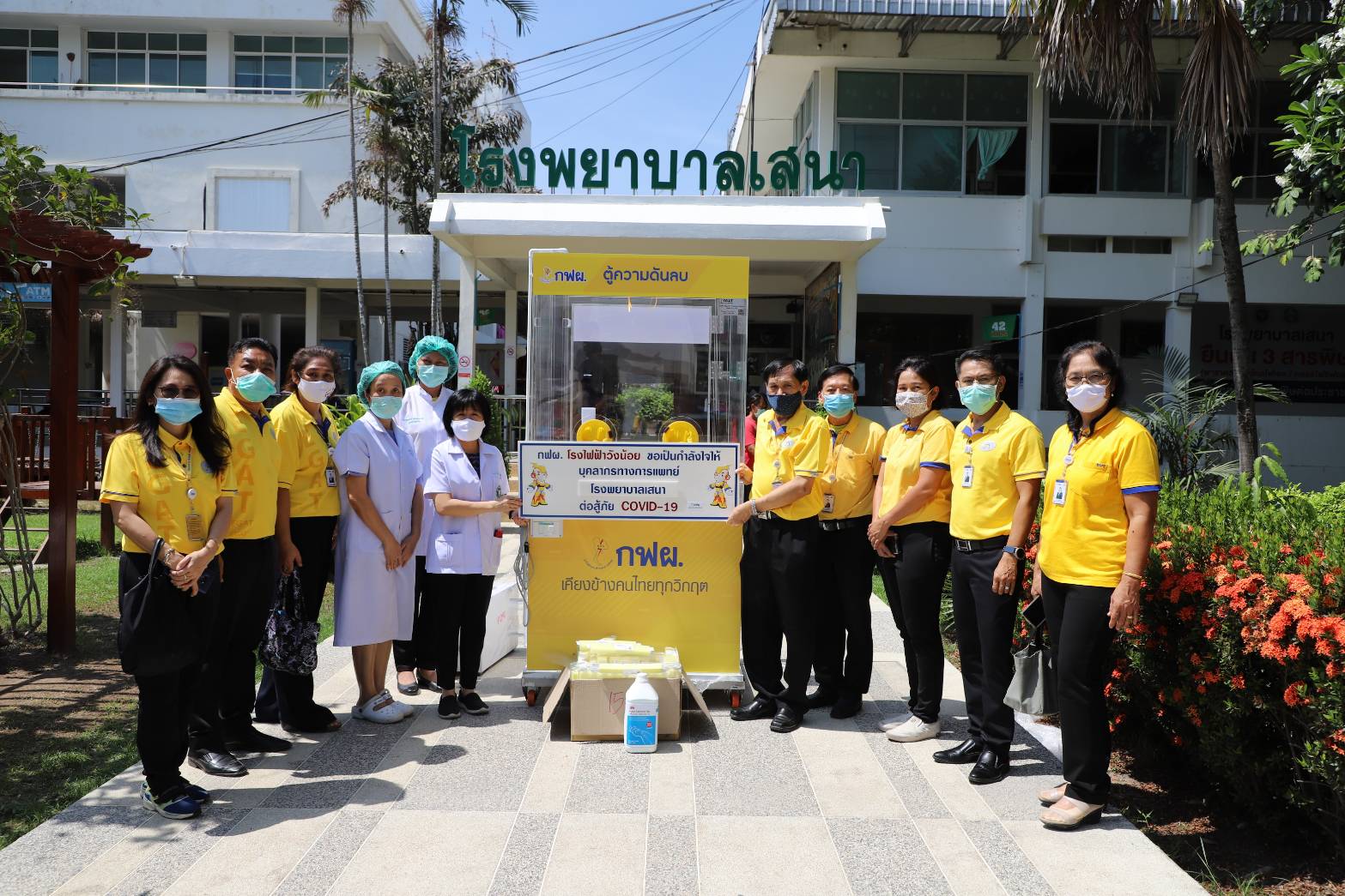 เมื่อวันที่ 12 พฤษภาคม 2563 การไฟฟ้าฝ่ายผลิตแห่งประเทศไทย (กฟผ.) โรงไฟฟ้าวังน้อย นำโดย นายสุรัตน์ วิชชุลดา วิศวกรระดับ 11 โรงไฟฟ้าวังน้อย พร้อมด้วยนายวันชัย ตรีสมบูรณ์สกุล หัวหน้าสำนักงานบางปะอิน ฝ่ายปฏิบัติการภาคกลาง รวมทั้งคณะผู้บริหาร และผู้ปฏิบัติงานโรงไฟฟ้าวังน้อย ได้มอบตู้เก็บสิ่งส่งตรวจระบบความดันลบ จำนวน 1 ตู้ Face Shield จำนวน 250 ชิ้น และเจลแอลกอฮอล์ ขนาด 3.5 ลิตร จำนวน 1 ขวด ให้แก่ โรงพยาบาลเสนา โดยมี แพทย์หญิงโสภา พิชัยณรงค์ รองผู้อำนวยการฝ่ายการแพทย์โรงพยาบาลเสนา เป็นผู้รับมอบ มอบตู้เก็บสิ่งส่งตรวจระบบความดันลบ จำนวน 1 ตู้ Face Shield จำนวน 100 ชิ้น และเจลแอลกอฮอล์ ขนาด 3.5 ลิตร จำนวน 1 ขวด