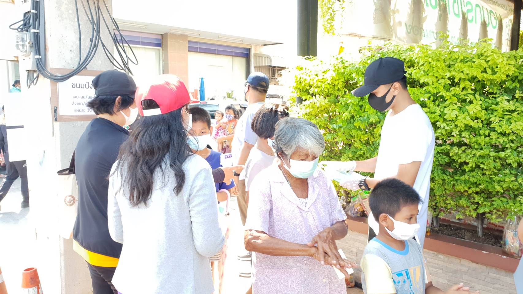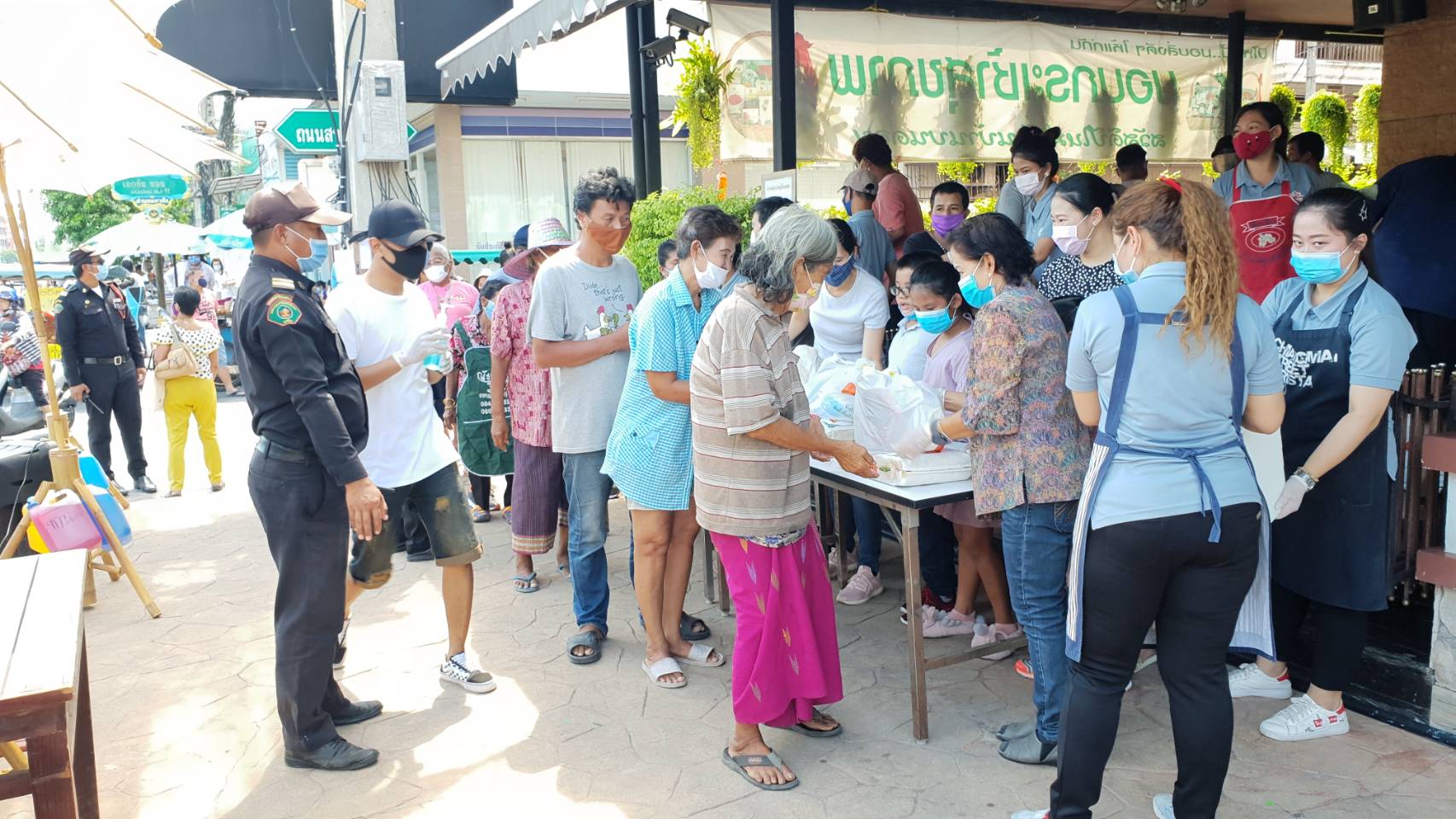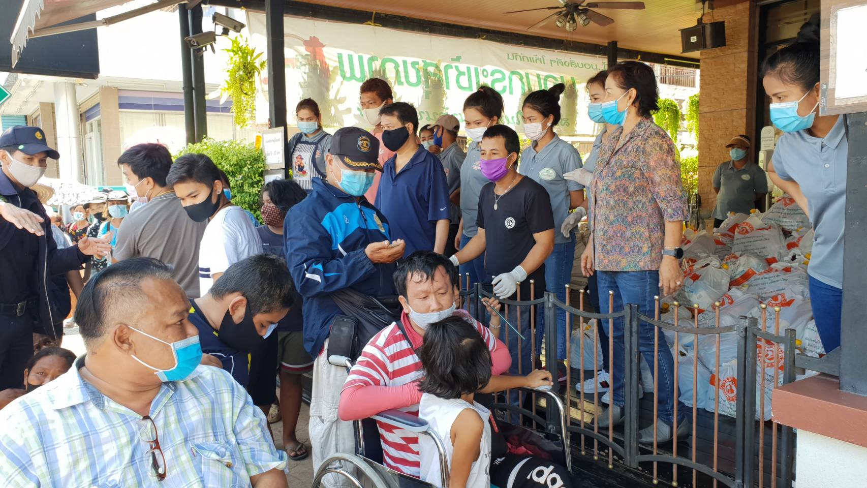 เพื่อไว้ช่วยเหลือผู้ได้รับผลกระทบจากการแพร่ระบาดของโรคติดเชื้อไวรัส โควิด-19 โดยประชาชนที่จะเข้ามารับการแจก จะต้องผ่านจุดคัดกรองจากเจ้าหน้าที่เทศบาลนครสมุทรสาครเพื่อตรวจวัดอุณหภูมิในร่างกาย จากนั้นใช้เจลล้างมือ และเข้าแถวตามระยะห่างที่สมควร ก่อนจะมารับถุงยังชีพและข้าวสารต่อไป../