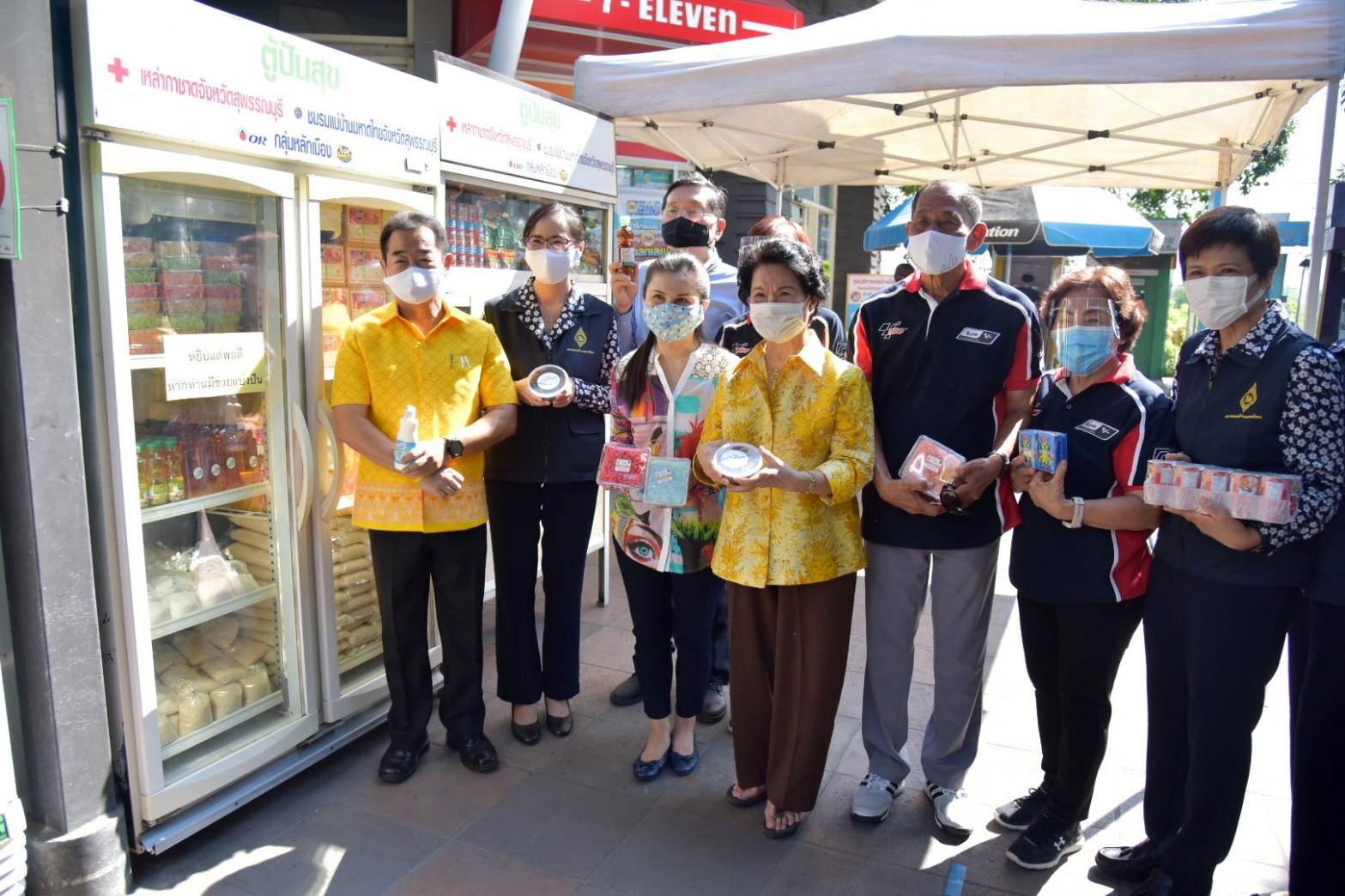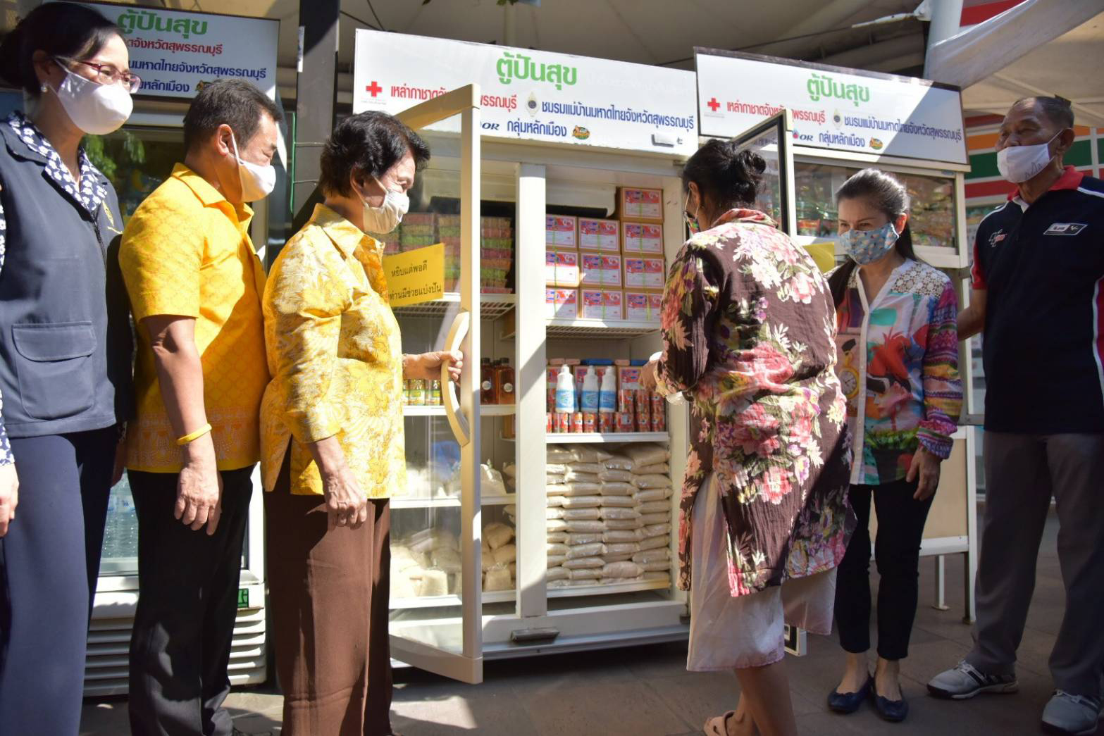 ที่บริเวณปั้ม ปตท.เลี่ยงเมือง ตำบลท่าระหัด อำเภอเมืองสุพรรณบุรี คุณหญิงแจ่มใส ศิลปอาชา ภริยานายบรรหาร ศิลปอาชา นายกรัฐมนตรีคนที่ 21 พร้อมด้วย นางสาวกัญจนา ศิลปอาชา หัวหน้าพรรคชาติไทยพัฒนา ร่วมกับ นายสมชาย สุจิตต์ ประธานกลุ่มบริษัท หลักเมืองถาวรพาณิชย์ จำกัด นางรัชนี สุจิตต์ นายนิมิต วันไชยธนวงศ์ ผู้ว่าราชการจังหวัดสุพรรณบุรี นางจุฬารัตน์ วันไชยธนวงศ์ นายกเหล่ากาชาดจังหวัดสุพรรณบุรี ปลัดจังหวัดสุพรรณบุรี ชมรมแม่บ้านมหาดไทยจังหวัดสุพรรณบุรี ร่วมกันนำสิ่งของยังชีพจำนวนมากมาใส่ตู้ปันสุขแบบไม่อั้น เพื่อช่วยเหลือผู้ยากไร้ จำนวน 3 ตู้ใหญ่ ที่บริเวณข้างร้านสะดวกซื้อภายในปั้มน้ำมัน มีชาวบ้านแห่กันมารอคิวหยิบของในร้านกันจำนวนมาก