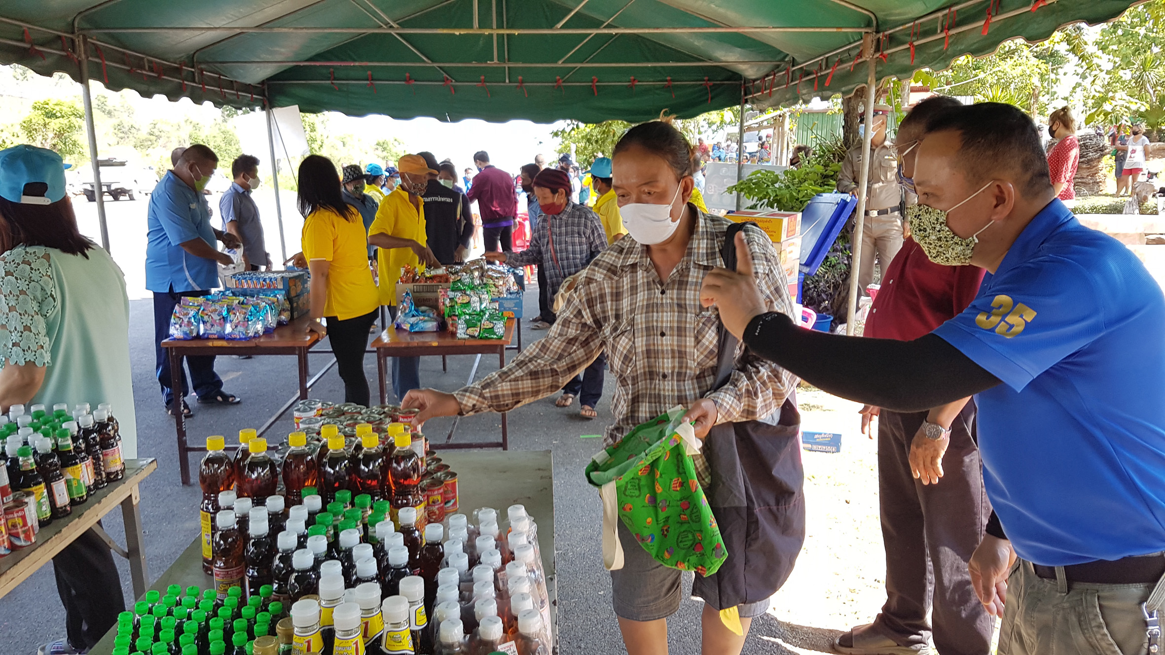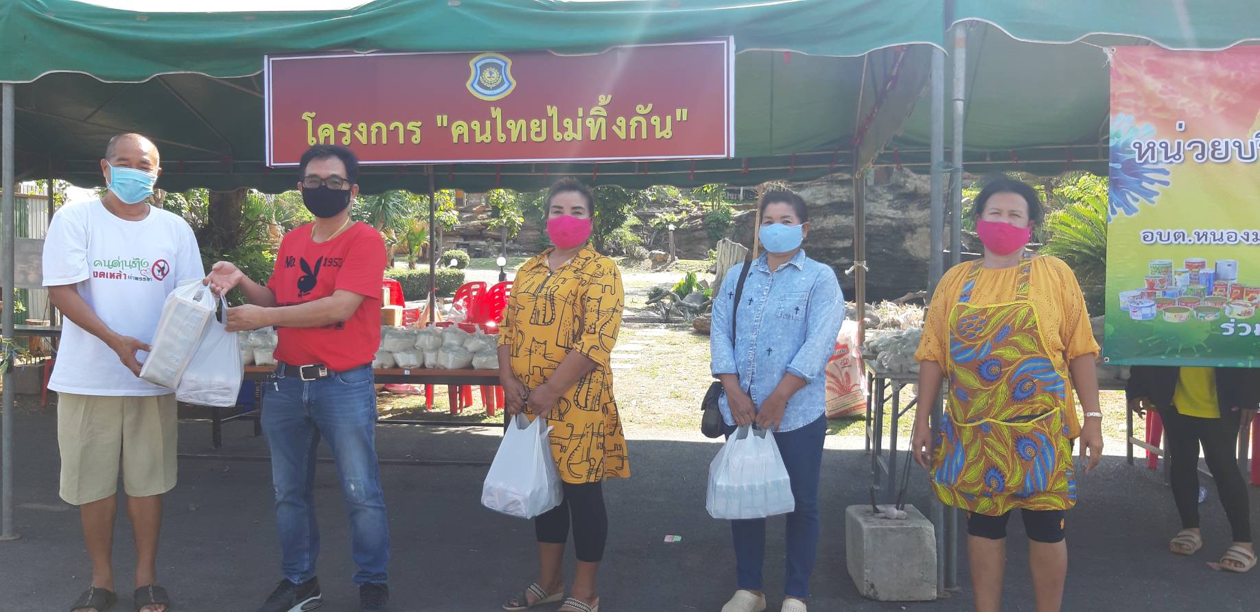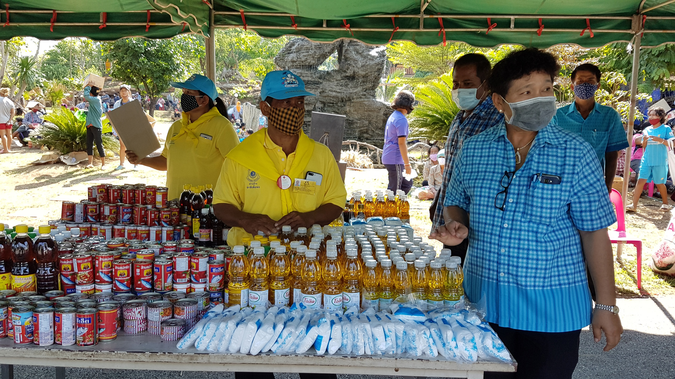 ส่วนการที่ใช้โต๊ะตั้งไว้ในเต๊นท์ไม่เหมือนที่อื่นๆนั้นก็เพราะว่าในพื้นที่มีคนจำนวนมากจึงไม่อยากให้มาอยู่ใกล้กันต้องการให้เว้นระยะห่างของคนเพื่อป้องกันการแพร่กระจายของเชื้อโควิด19 ส่วนสิ่งของที่นำมาไว้สำหรับให้ประชาชนนำกลับไปทานก็จะวางไว้บนโต๊ะให้เลือกแล้วแต่ว่าใครจะเลือกเอาอะไรเราไม่ได้จำกัดแต่ก็อยากให้แต่ละท่านได้รับความสุขเท่าๆกันบางท่านมีพืชผลทางการเกษตรเช่นผักผลไม้ต่างๆก็นำมาเติมได้