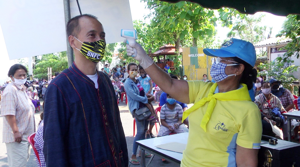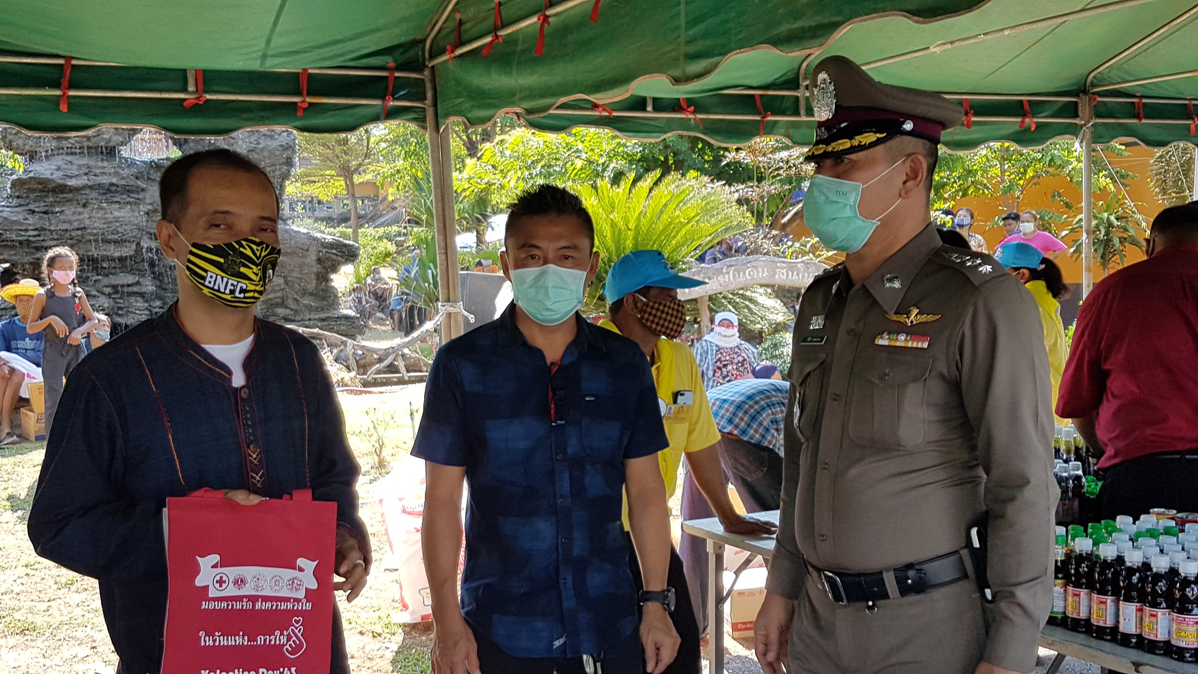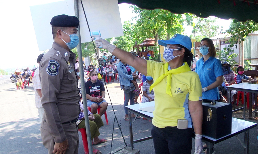 บรรยากาศการเข้าสิ่งของได้มีเจ้าหน้าที่ตำรวจ ทางหลวง เจ้าหน้าที่มูลนิธิเสมอกันกู้ภัยสุพรรณบุรี เจ้าหน้าที่ อบต.วังคัน มาอำนวยความสะดวกและจัดระเบียบเพื่อป้องกันการแพร่กระจายของเชื้อคิด 19และเจ้าหน้าที่ จาก รพ.สต.วังคัน และอสม. นำอุปกรณ์เครื่องมือมาตรวจวัดไข้พร้อมเจลล้างมือก่อนก่อนเข้ารับสิ่งของ