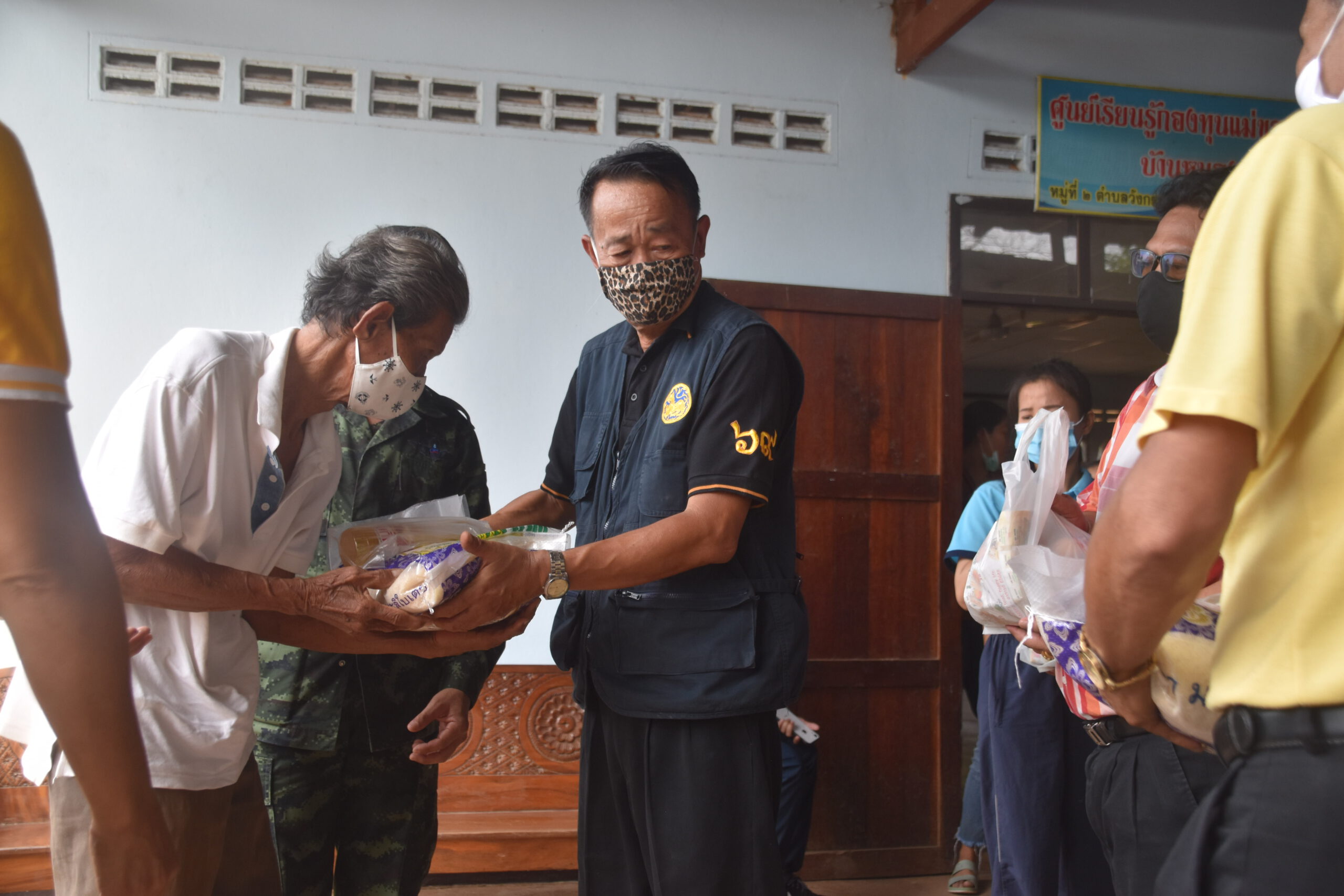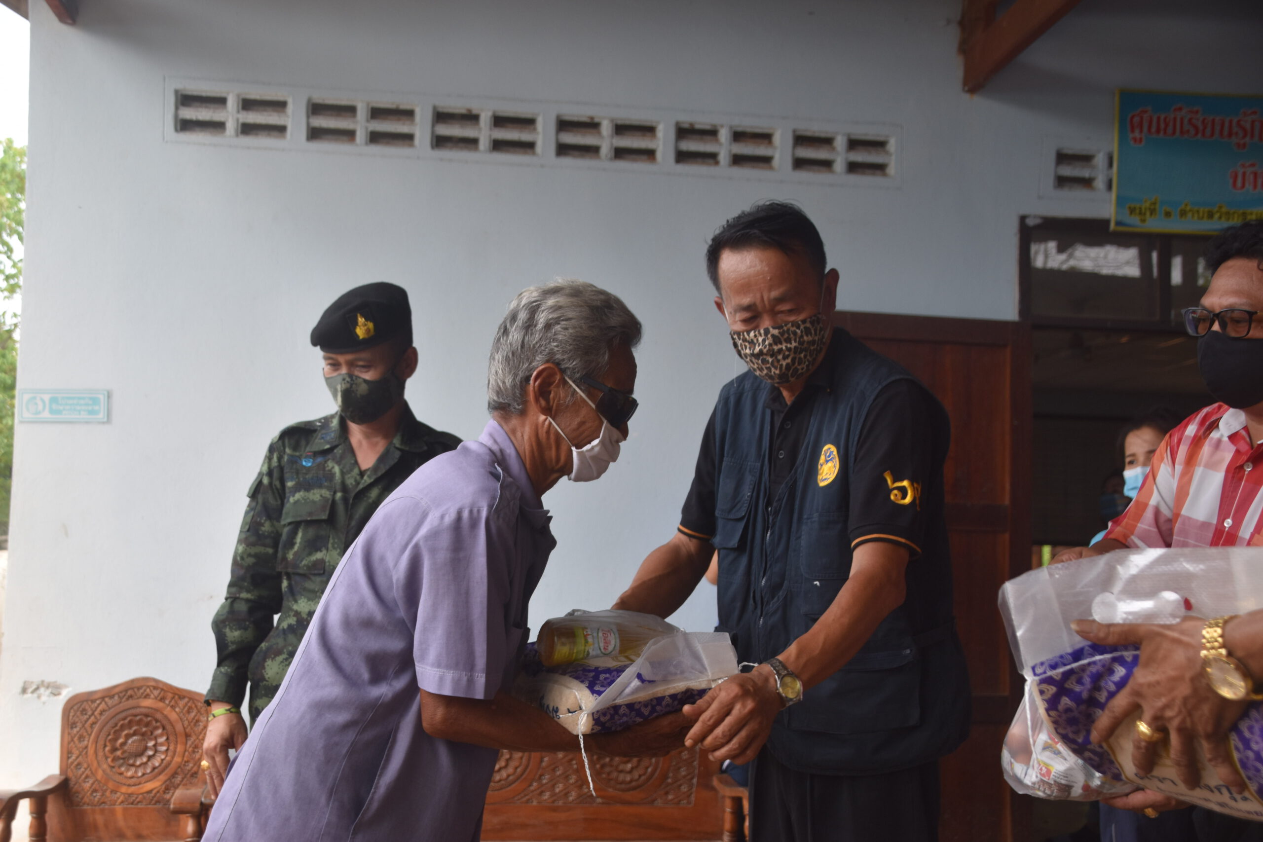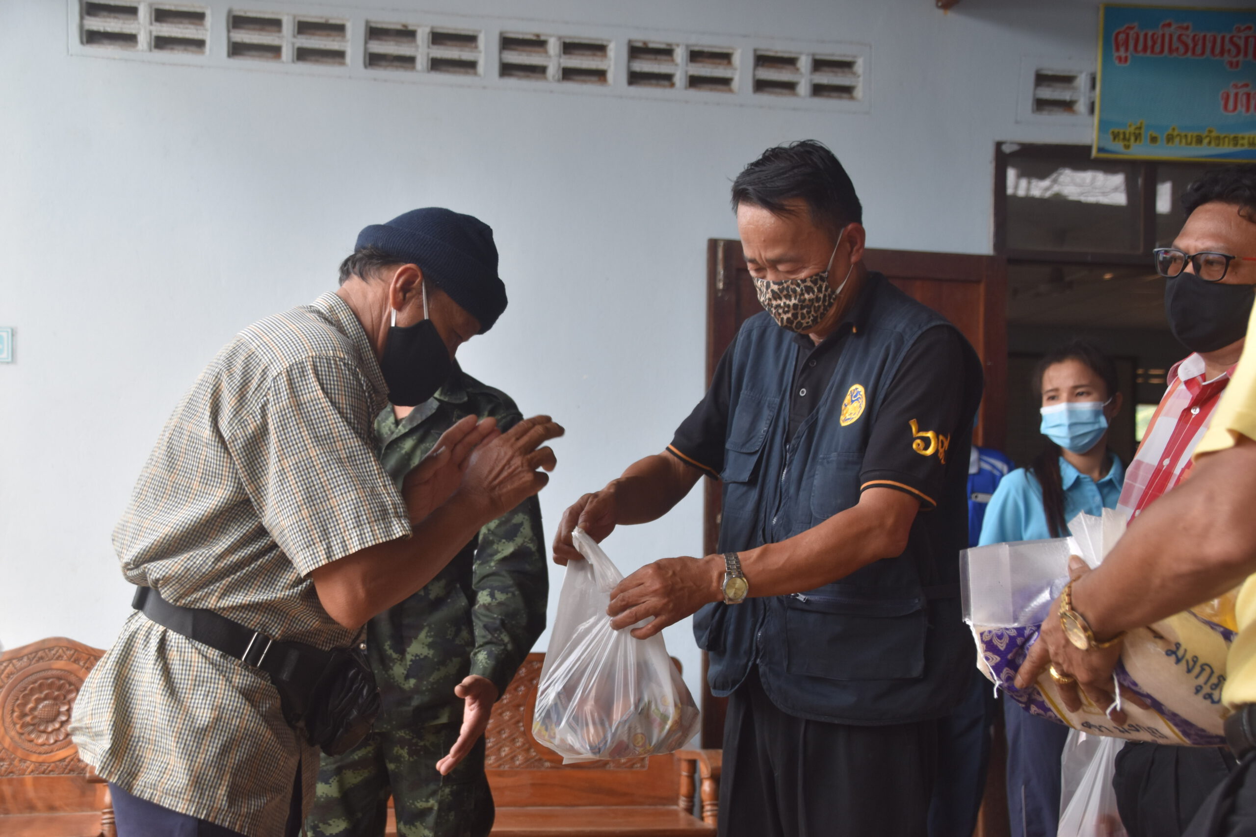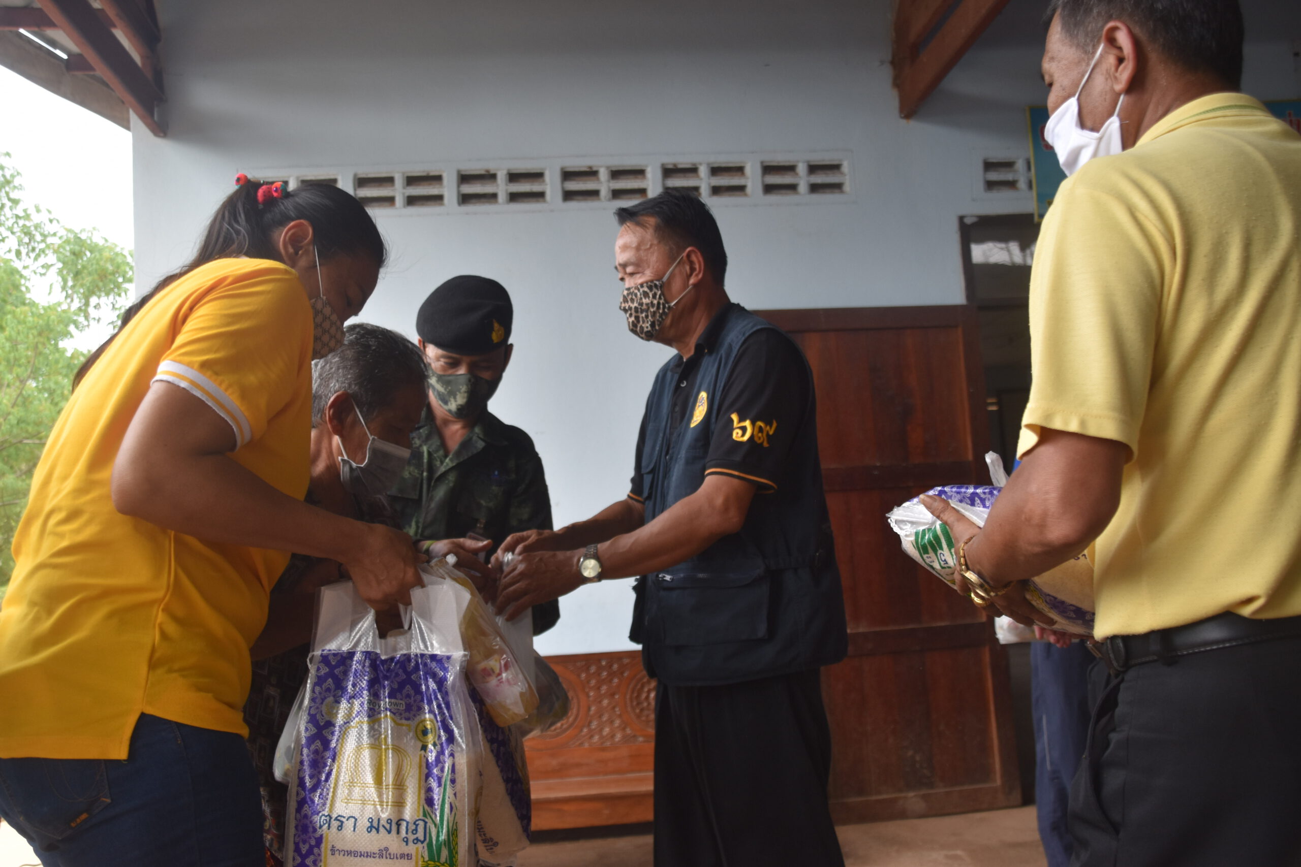 กาญจนบุรี นายอำเภอไทรโยค ร่วมกับคณะกรรมการน้ำปะปาหมู่บ้าน ร่วมแจกถุงยังชีพ ผู้ประสบภัยโควิด 19