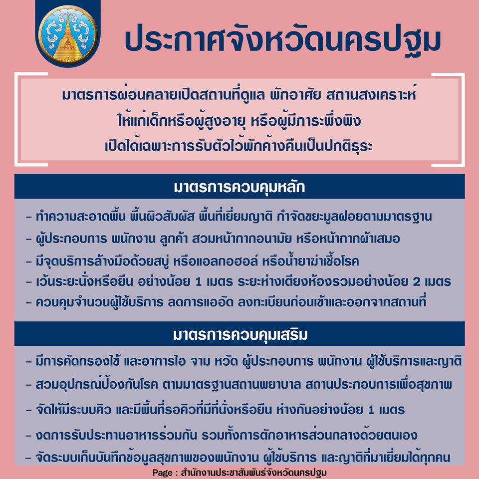 ประกาศจังหวัดนครปฐม ฉบับที่ 33 มาตรการผ่อนคลายให้เปิดสถานที่บริการดูแล สถานที่พำนักอาศัย หรือสถานสงเคราะห์อื่นที่จัดสวัสดิการให้แก่เด็กหรือผู้สูงอายุ หรือผู้มีภาระพึ่งพิง ให้เปิดดำเนินการได้เฉพาะที่มีการรับตัวไว้พักค้างคืนเป็นปกติธุระ ในท้องที่จังหวัดนครปฐม