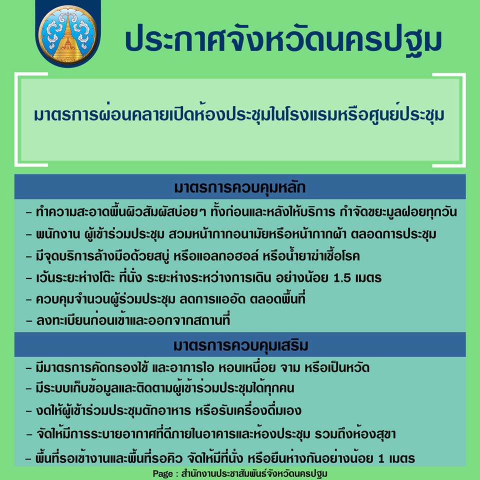 ประกาศจังหวัดนครปฐม ฉบับที่ 35 มาตรการผ่อนคลายการใช้ห้องประชุมในโรงแรม หรือศูนย์ประชุมในท้องที่จังหวัดนครปฐม