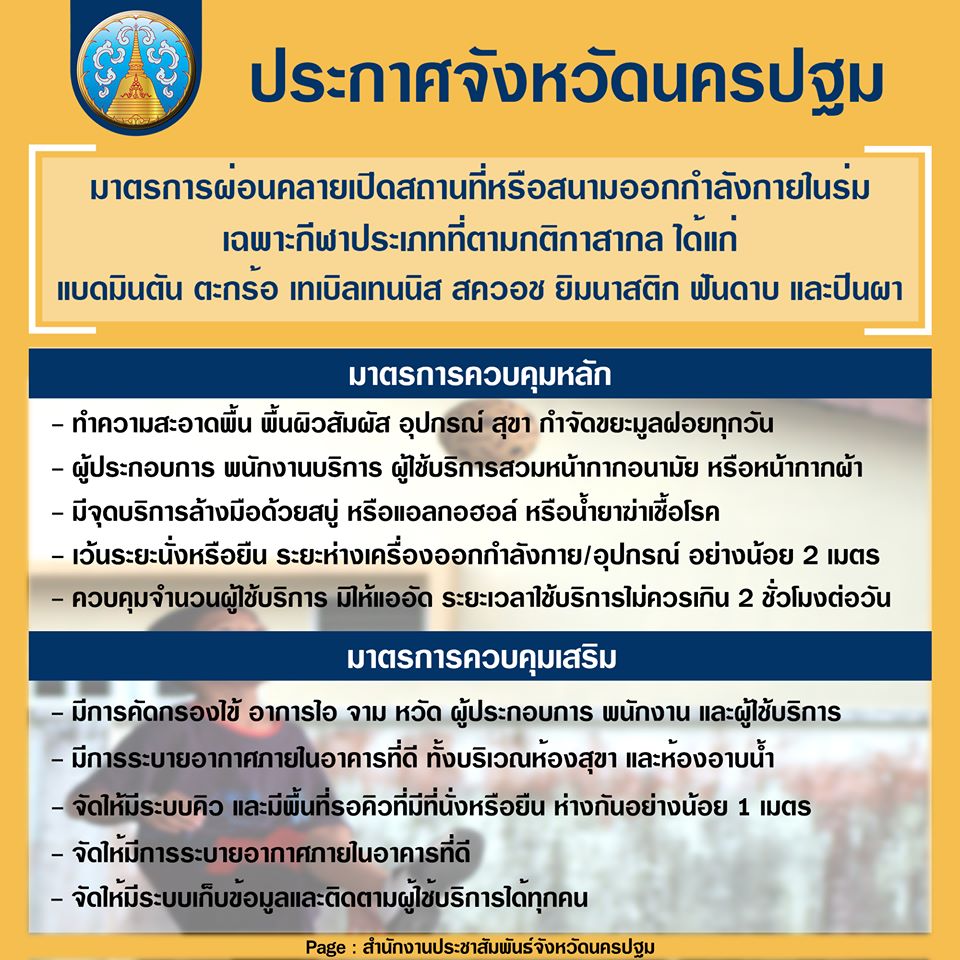 ประกาศจังหวัดนครปฐม ฉบับที่ 38 มาตรการผ่อนคลายให้เปิดสถานที่หรือสนามออกกำลังกายในร่ม เฉพาะกีฬาประเภทที่ตามกติกาสากล มิได้มีการปะทะกันระหว่างผู้เล่น และต้องไม่มีผู้ชมการแข่งขัน ในท้องที่จังหวัดนครปฐม