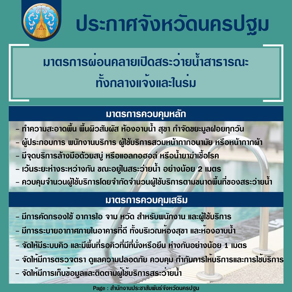 ประกาศจังหวัดนครปฐม ฉบับที่ 39 มาตรการผ่อนคลายสระว่ายน้ำสาธารณะทั้งกลางแจ้งและในร่ม ในท้องที่จังหวัดนครปฐม