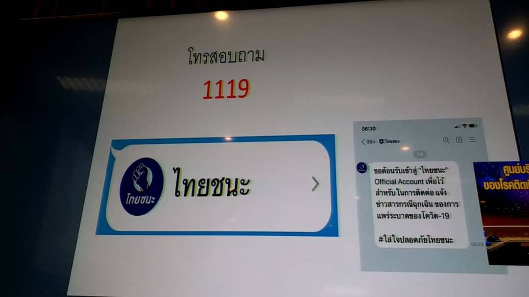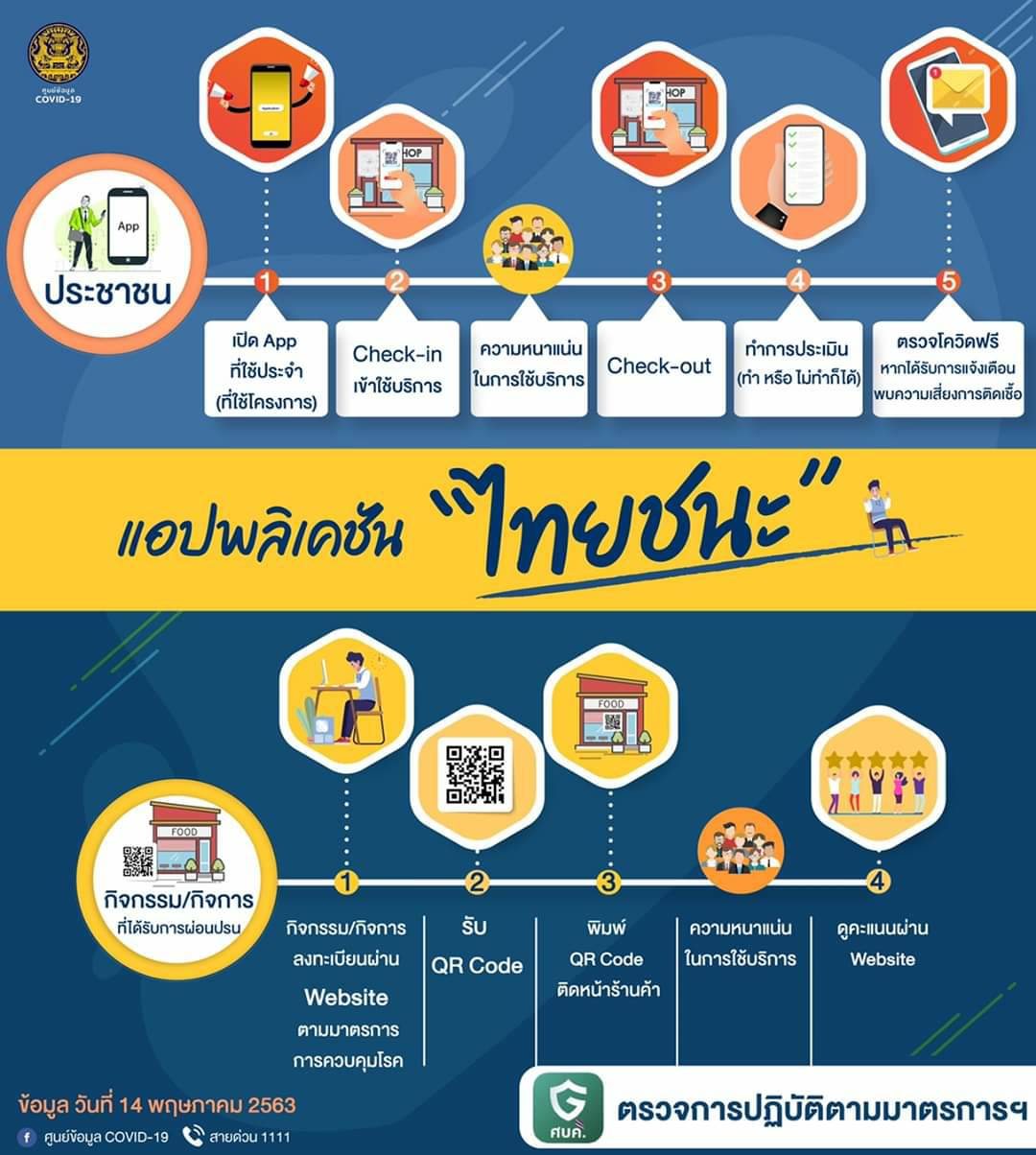 ส่วนผู้ใช้บริการสามารถสแกนคิวอาร์โค้ดจากผู้ประกอบการผ่านโทรศัพท์มือถือ ทั้งการเข้าและออกจากการรับบริการ แพลตฟอร์มจะทำหน้าที่ประมวลผลให้เอง สำหรับประโยชน์ของแพลตฟอร์มไทยชนะ จะช่วยคัดกรองคน ในกรณีที่มีคนติดเชื้อในสถานที่นั้นๆ ทั้งนี้ หากต้องการรับข้อมูลเพิ่มเติมสามารถติดต่อได้ที่เบอร์สายด่วน 1119