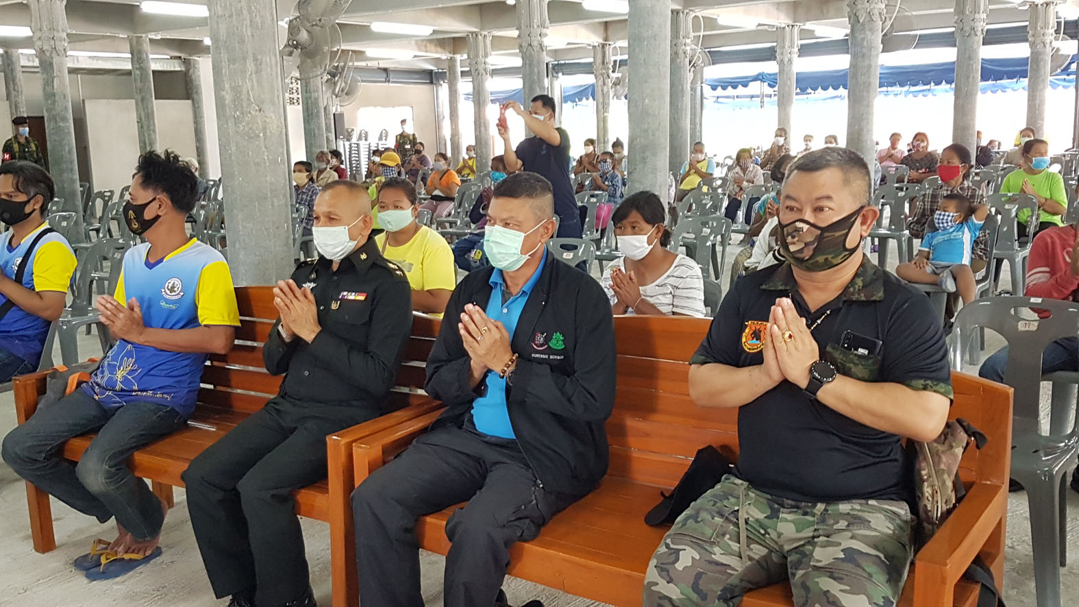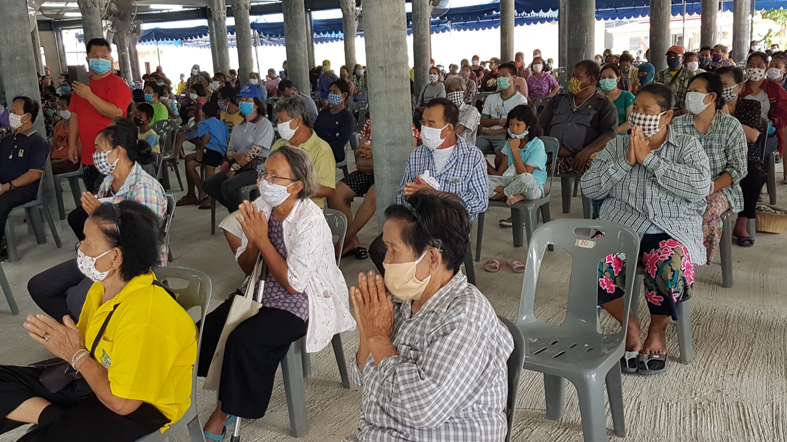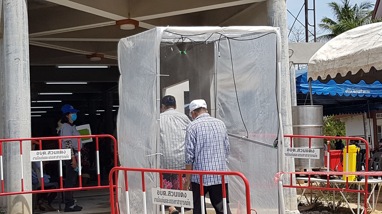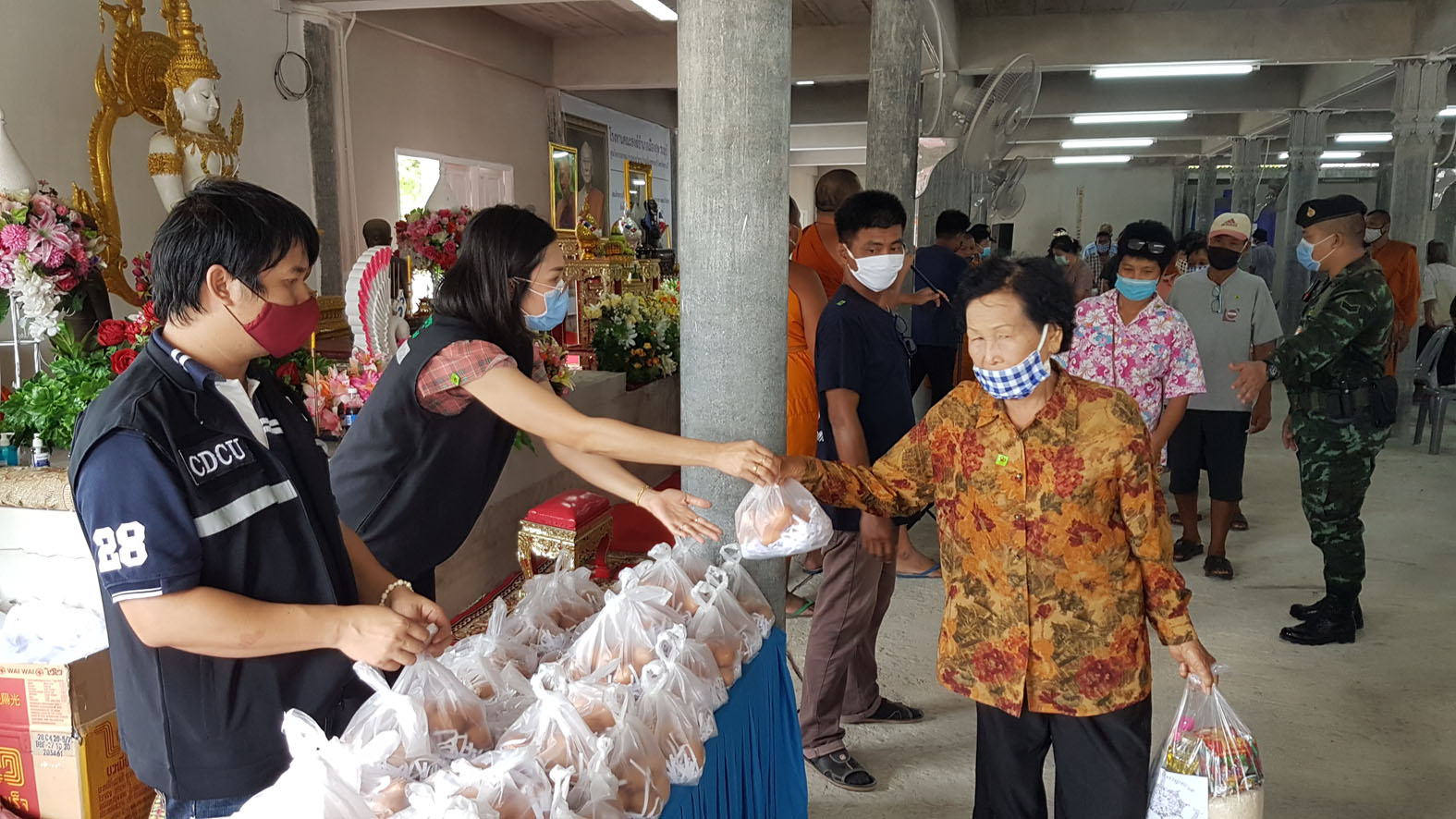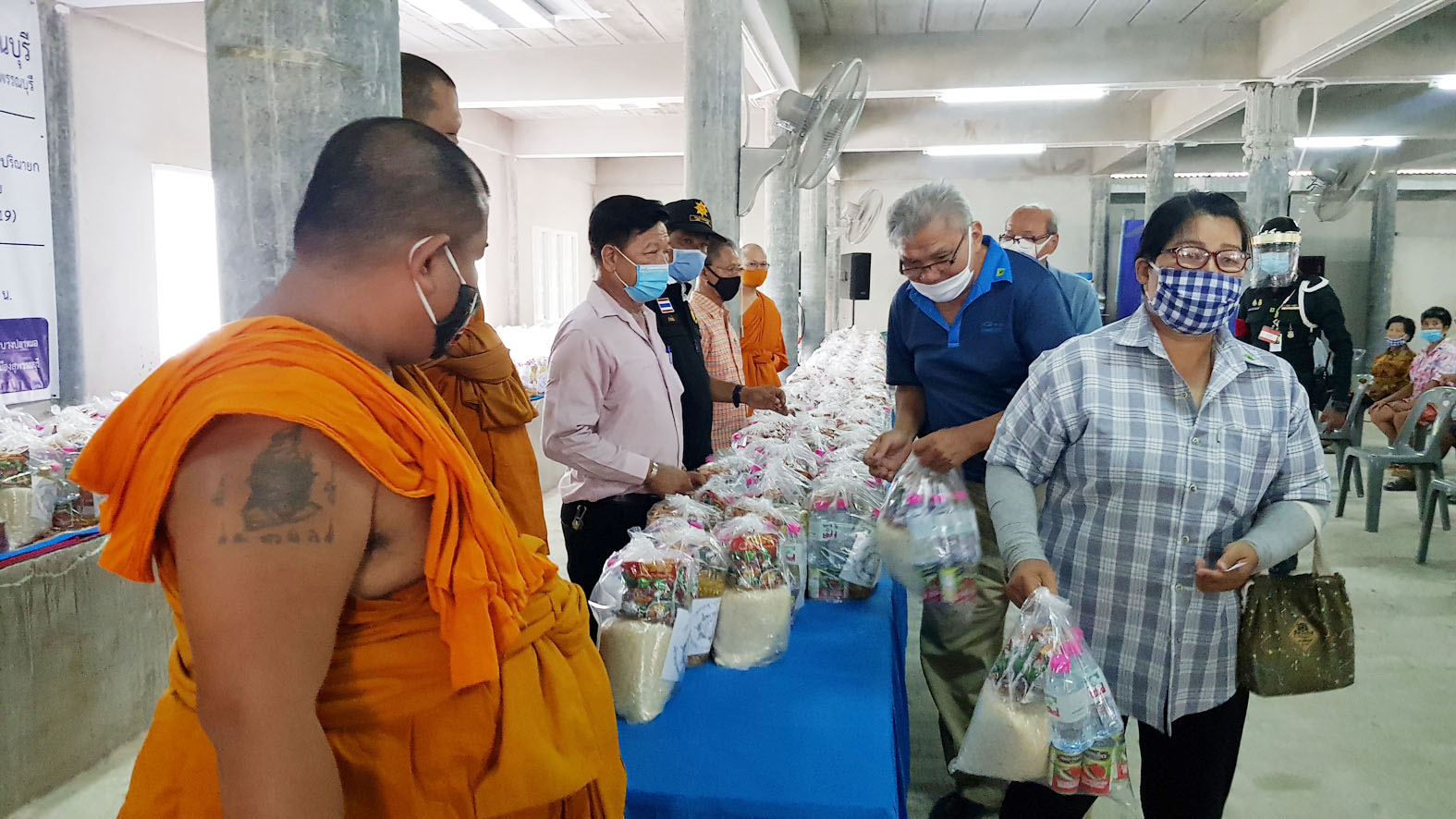 จัดแถวให้ประชาชนที่เข้ารับถุงยังชีพยืนตามจุดที่ในระยะห่างกำหนดของกระทรวงสาธารณสุข โดยการนำตู้พ่นน้ำยาฆ่าเชื้อมาตั้งให้ทุกคนเดินผ่านเพื่อฆ่าเชื้อก่อน จากนั้นจะมีเจ้าหน้าที่ตรวจวัดอุณหภูมิไข้แล้วจึงจะไปนั่งตามคิวโดยเว้นระยะห่างตามคำแนะนำของเจ้าหน้าที่อย่างเคร่งครัด