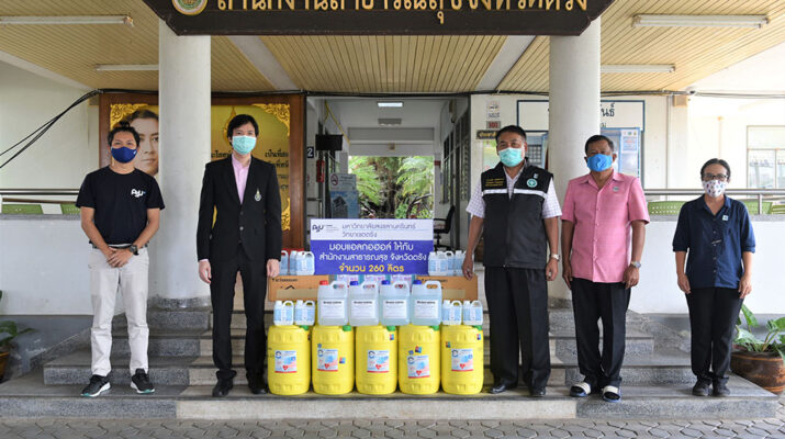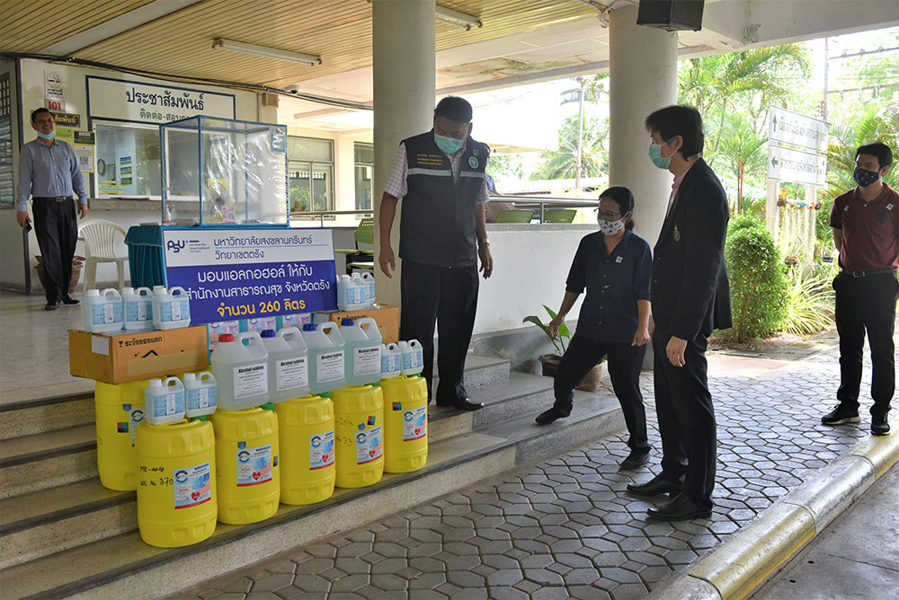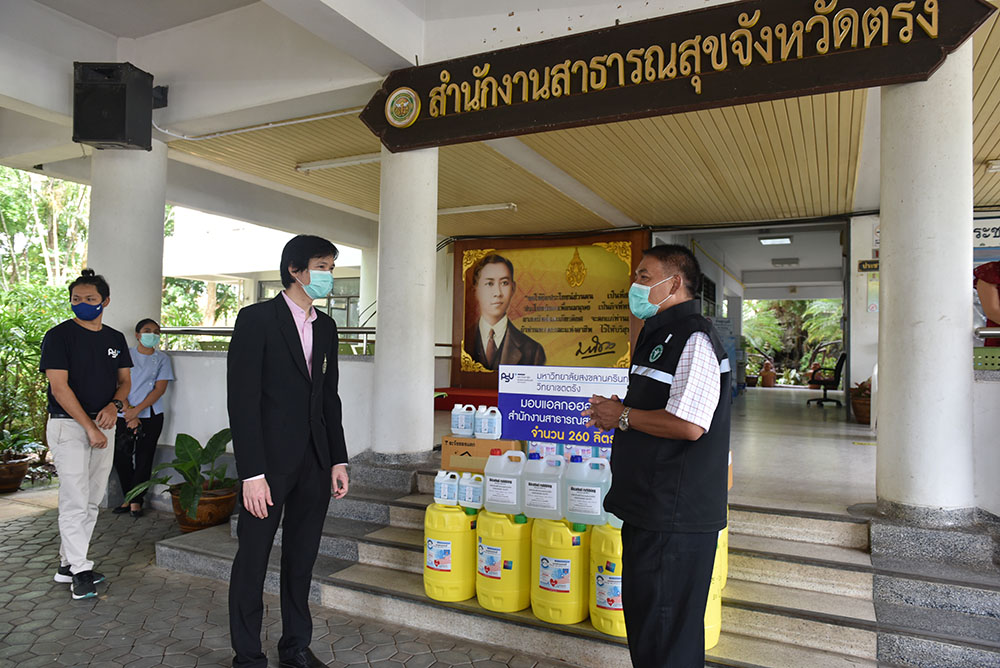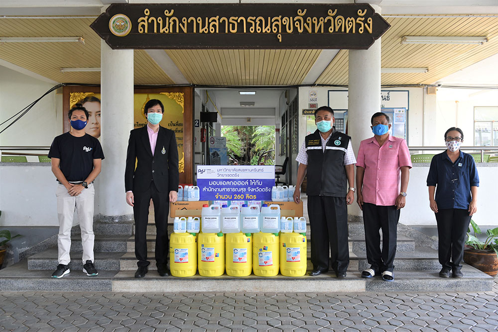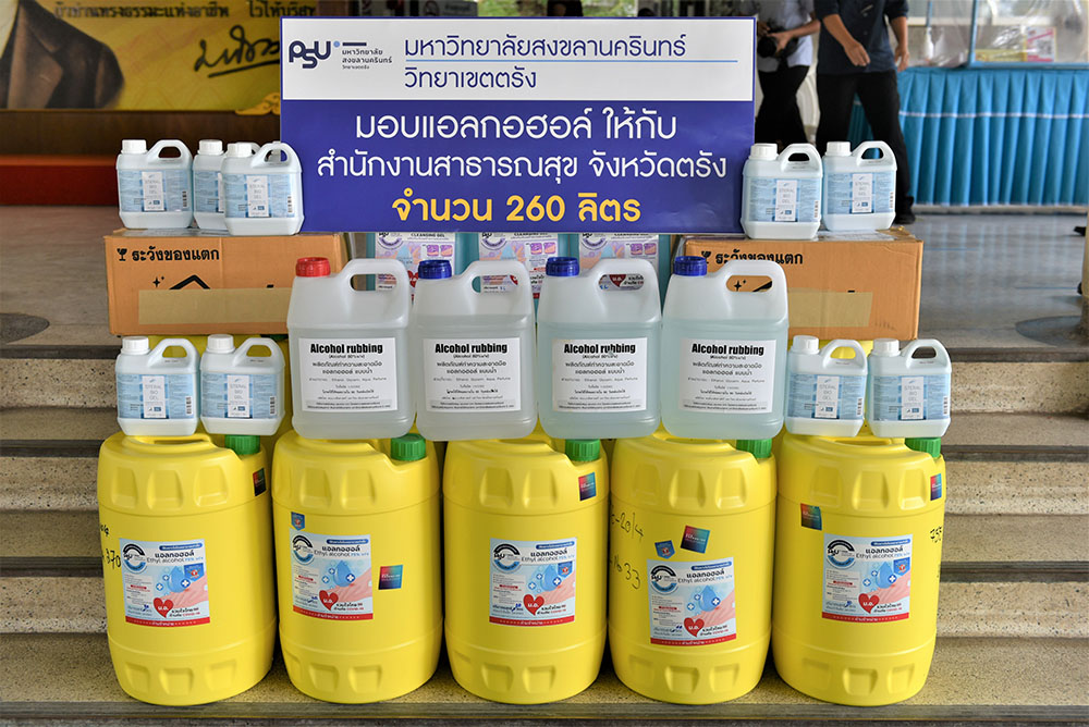 มหาวิทยาลัยสงขลานครินทร์ วิทยาเขตตรังมอบแอลกอฮอล์และเจลแอลกอฮอล์ล้างมือ ให้กับสำนักงานสาธารณสุขจังหวัดตรัง เพื่อส่งต่อไปยังโรงพยาบาลสุขภาพตำบลในจังหวัดตรัง รวม 260 ลิตร