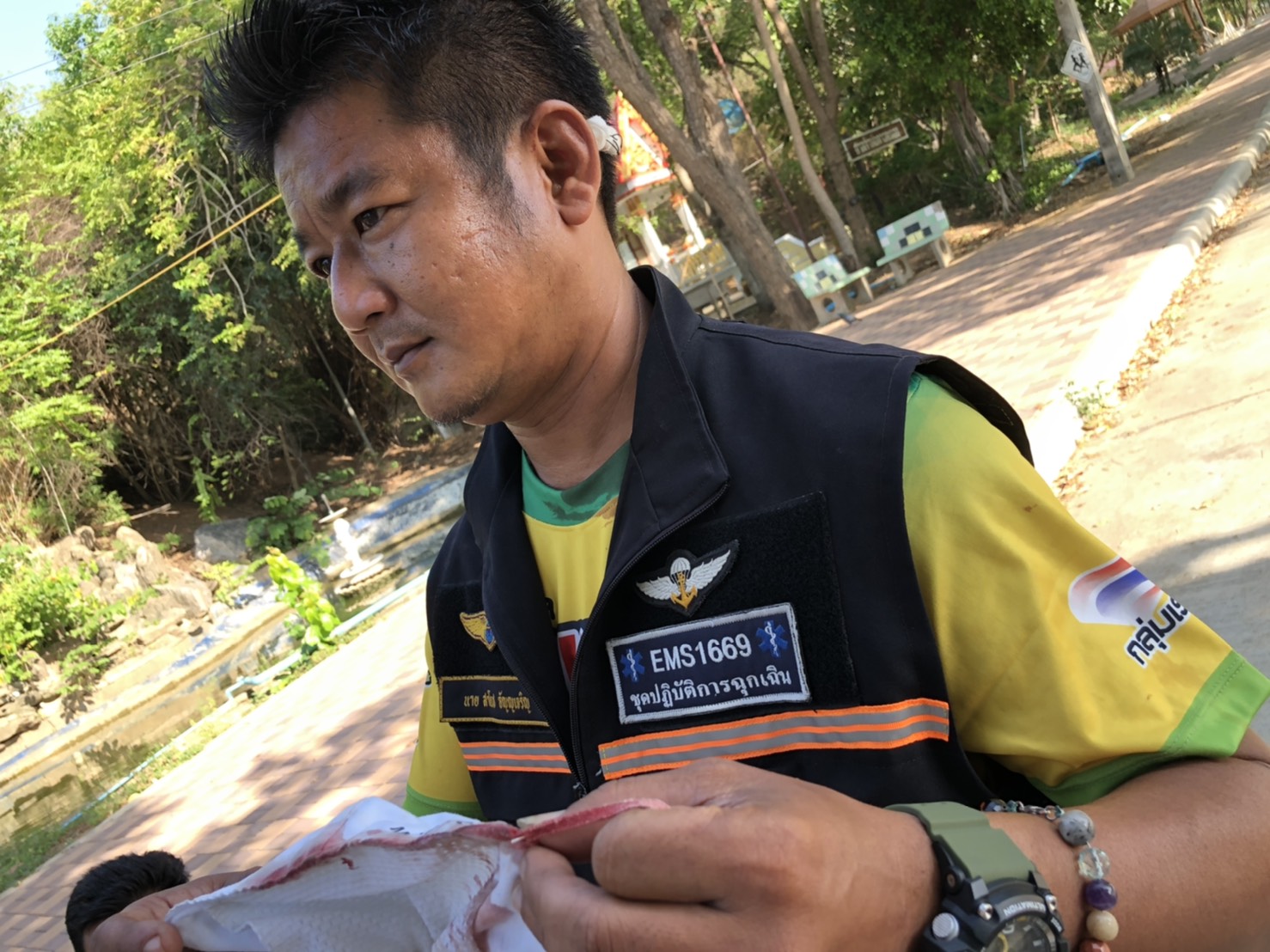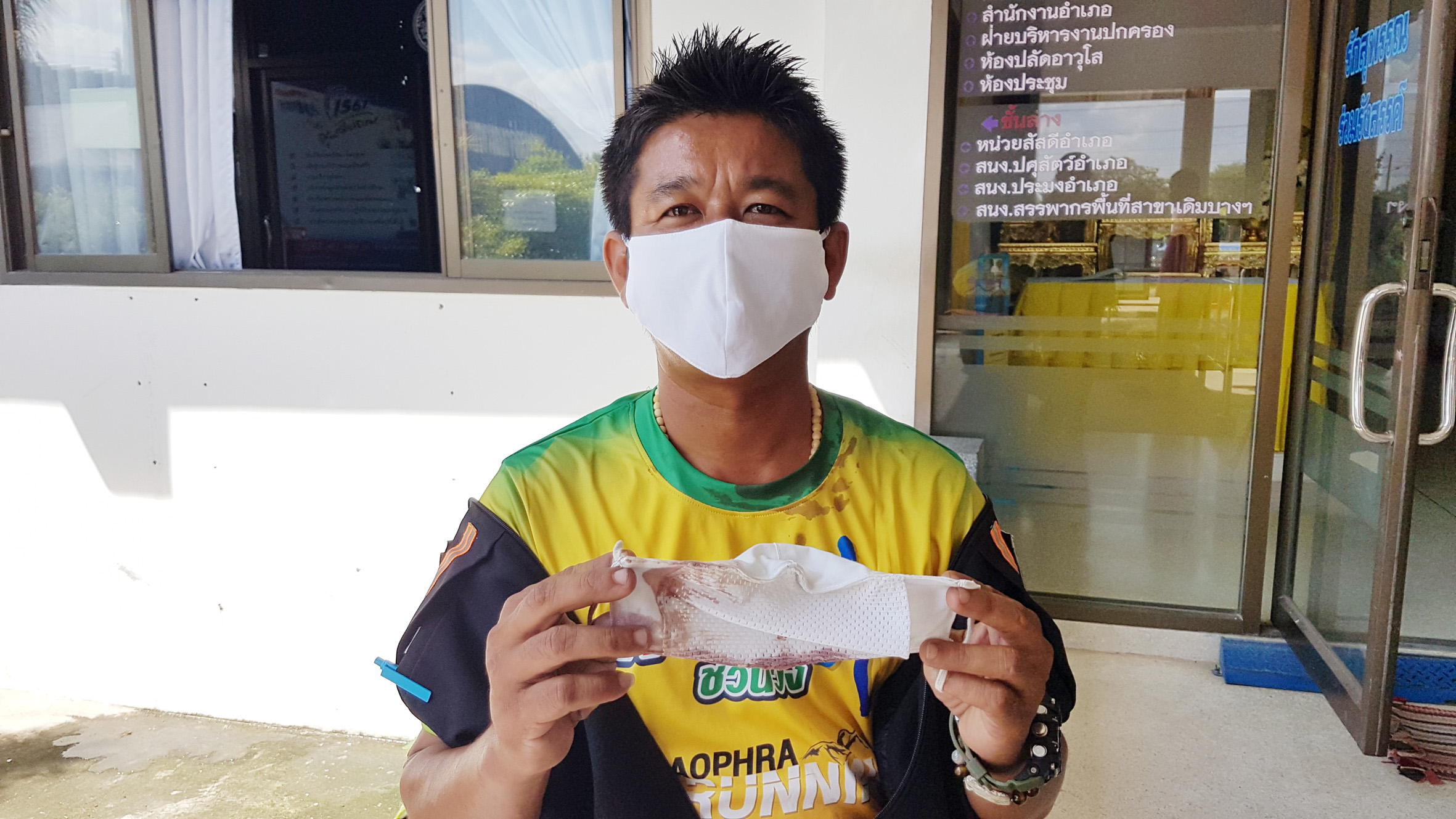 กระทั่งช่วงเช้าตนได้ออกปฏิบัติหน้าที่ตามปกติเนื่องจากช่วงนี้การ์ดเริ่มตกจึงต้องเข้มทั้งนี้เพื่อความปลอดภัยของพี่น้องทุกท่านที่ทำมาหากินที่ตลาดท่าช้างและตลาดดาวกระทั่งมาถึงหน้าร้านขายกาแฟพบนายเฉลย นุ่มผล อายุ 59 ปีอาชีพขายล็อตเตอรี่ ที่ถูกตนว่ากล่าวตักเตือนไปเมื่อวันก่อนนั่งดื่มกาแฟอยู่ในร้านเมื่อเห็นตนเดินผ่านนายเฉลย ได้ชี้มือมาที่ตน ตนจึงเดินเข้าไปหาแต่กลับถูกนายเฉลย ได้พูดกล่าวหาว่าตนบ้าอำนาจจะแจ้งตำรวจจับตนจึงพยามเดินเข้าไปใกล้เพื่ออธิบายเหตุผลของการว่ากล่าวตักเตือนให้ฟังว่าเพราะอะไรแต่นายเฉลย ได้ลุกเดินออกมาที่บนถนนถือแก้วกาแฟร้อนอยู่เต็มแก้วเมื่อตนเดินเข้าไปใกล้เพื่อจะชี้แจงกลับถูกนายเฉลยใช้มือค้ำคอไม่ยอมฟังเสียงจังหวะนั้นได้เงื้อมือที่ถือแก้วกาแฟร้อนๆตบเข้าที่ศีรษะด้านท้ายทอยจนตนหัวคะมำได้รับบาดเจ็บทรุดลงกับพื้นท่ามกลางความตกใจของพ่อค้าแม่ค้าที่เห็นเหตุการณ์ ที่ตนพยายามเตือนให้ใส่หน้ากากก็เพราะป้องกันการแพร่เชื้อโควิด ที่ผ่านมาได้รับความร่วมมือจากคนส่วนใหญ่แต่นายเฉลยกลับฝ่าฝืนโดยอ้างว่าลืมบ้างอะไรต่างๆนานา ตนจึงแจ้งความให้ดำเนินคดีตามกฎหมาย