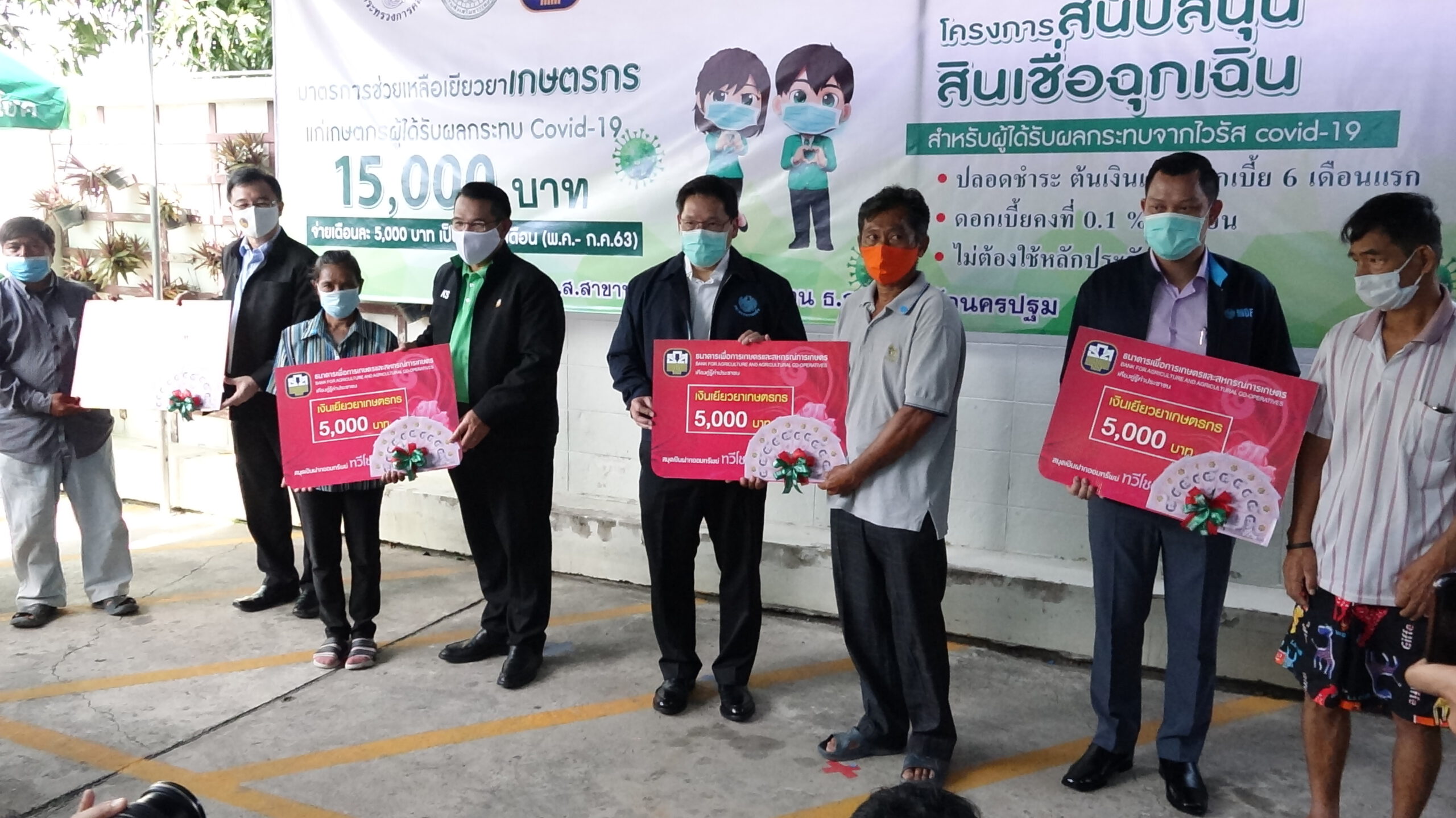 นายอุตตม สาวนายน รัฐมนตรีว่าการกระทรวงการคลัง ลงพื้นที่จังหวัดนครปฐมติดตามการดำเนินงานและพบปะให้กำลังใจเกษตรกร พร้อมมอบเงินเยียวยาเกษตรกร แก่เกษตรกรลูกค้า ธ.ก.ส. สาขานครชัยศรี จำนวน 200 ราย และตรวจเยี่ยมให้กำลังใจพนักงาน และผู้บริหาร พร้อมด้วย นายขจรเกียรติ รักพาณิชย์มณี รองผู้ว่าราชการจังหวัดนครปฐมนายกษาปณ์ เงินรวง รองผู้จัดการธนาคารเพื่อการเกษตรและสหกรณ์การเกษตร นายปฐมพงษ์ สูญจันทร์ สส.เขต4จังหวัดนครปฐม ร่วมด้วยผู้บริหาร ธ.ก.ส. ฝ่ายกิจการสาขาภาคตะวันตก โดยนายยุวพล วัตถุ ร่วมมอบเงินช่วยเหลือเกษตรกรที่ได้รับผลกระทบจากการระบาดของโรคติดเชื้อไวรัสโคโรนาโควิด-19 ใน2โครงการคือ 1.โครงการเยียวยาเกษตรกร 15,000 บาท 2.โครงการสนับสนุนสินเชื่อฉุกเฉินสำหรับผู้ได้รับผลกระทบจากไวรัสโควิด-19 รายละ 10,000 บาท