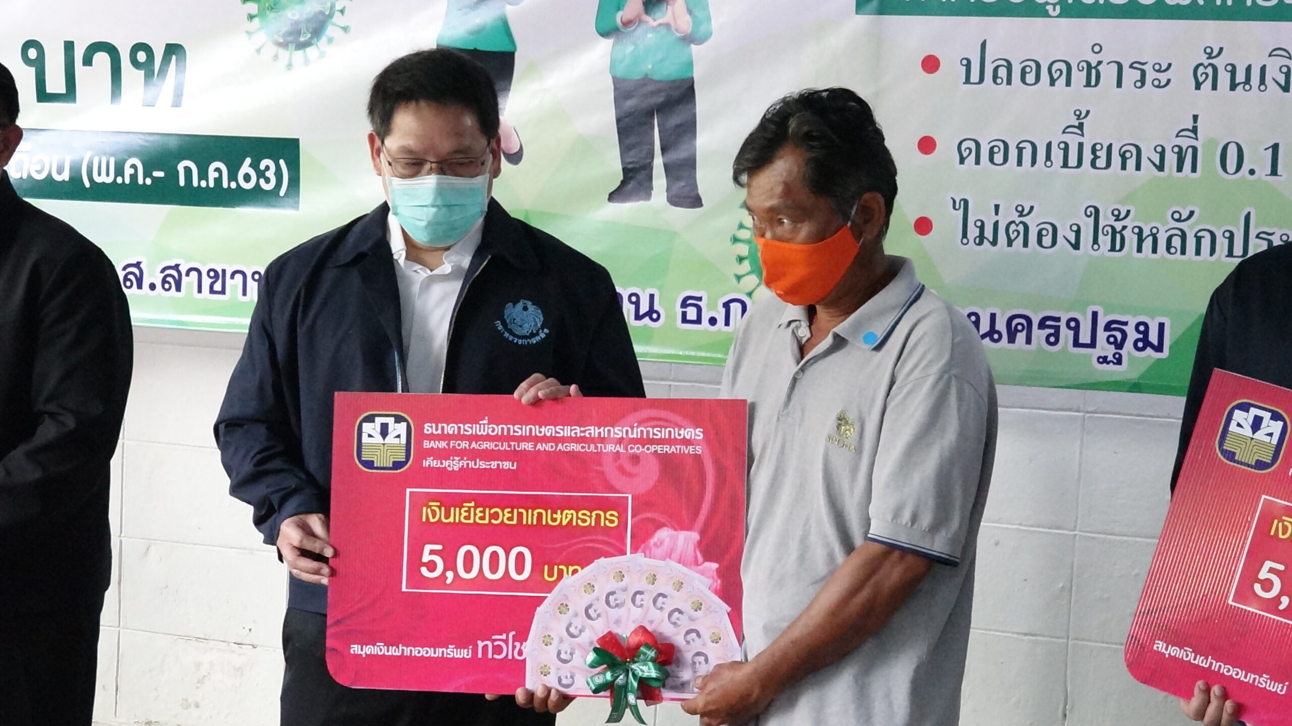 พร้อมกันนี้ นายอุตตม สาวนายน รัฐมนตรีว่าการกระทรวงการคลัง กล่าวว่า ธ.ก.ส. ได้ดำเนินการจ่ายเงินช่วยเหลือเยียวยาเกษตรกรที่ได้รับผลกระทบจากการแพร่ระบาดของเชื้อไวรัส COVID-19 ตามมติคณะรัฐมนตรี รายละ 15,000 บาท โดยจ่ายเดือนละ 5,000 บาท เป็นระยะเวลา 3 เดือน (พ.ค.–ก.ค. 63) จำนวน 10 ล้านราย วงเงินงบประมาณ 150,000 ล้านบาท เริ่มทยอยโอนเงินผ่าน ธ.ก.ส. ทุกสาขากว่า 1,200 สาขาทั่วประเทศ ตั้งแต่วันที่ 15 พฤษภาคมที่ผ่านมา วันละประมาณ 1 ล้านราย โดย ณ วันที่ 22 พฤษภาคม 2563 ได้ดำเนินการจ่ายเงินแก่เกษตรกรในกลุ่มแรก