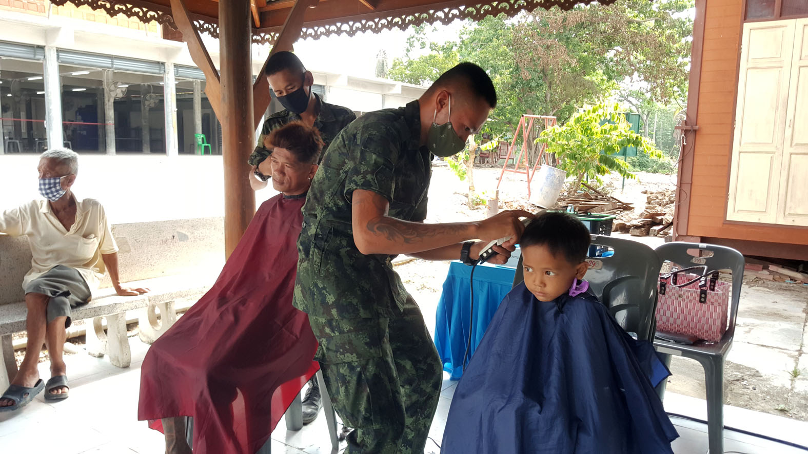 นอกจากนี้ยังได้จัดให้บริการตัดผมทั้งเด็กและผู้ใหญ่ฟรีอีกด้วยโดยก่อนที่พี่น้องประชาชนจะเข้าไปรับอาหารกล่อง เจ้าหน้าที่ทหาร นายก อบต.ดอนกำยาน ผู้ใหญ่บ้าน อสม.ได้เข้ามาช่วยกันจัดระเบียบให้อยู่ในระยะห่างอย่างน้อย 1เมตรตามมาตรการของกระทรวงสาธารณสุข พร้อมกับวัดอุณหภูมิร่างกายล้างมือด้วยเจลแอลกอฮอล์ เพื่อป้องกันการแพร่ระบาดของเชื้อไวรัส ระหว่างที่พี่น้องประชาชนกำลังเดินทางมารับอาหารกล่องได้มีฝนตกลงมาโปรยปรายทำให้พี่น้องประชาชนต้องเดินฝ่าสายฝนเข้ามารับของกันด้วยความลำบากซ้ำสอง