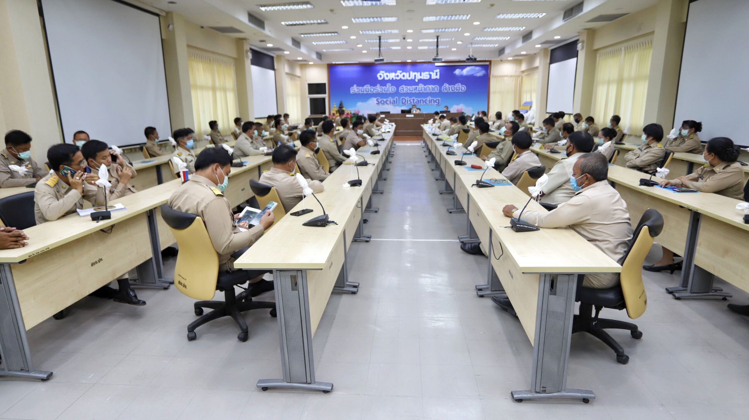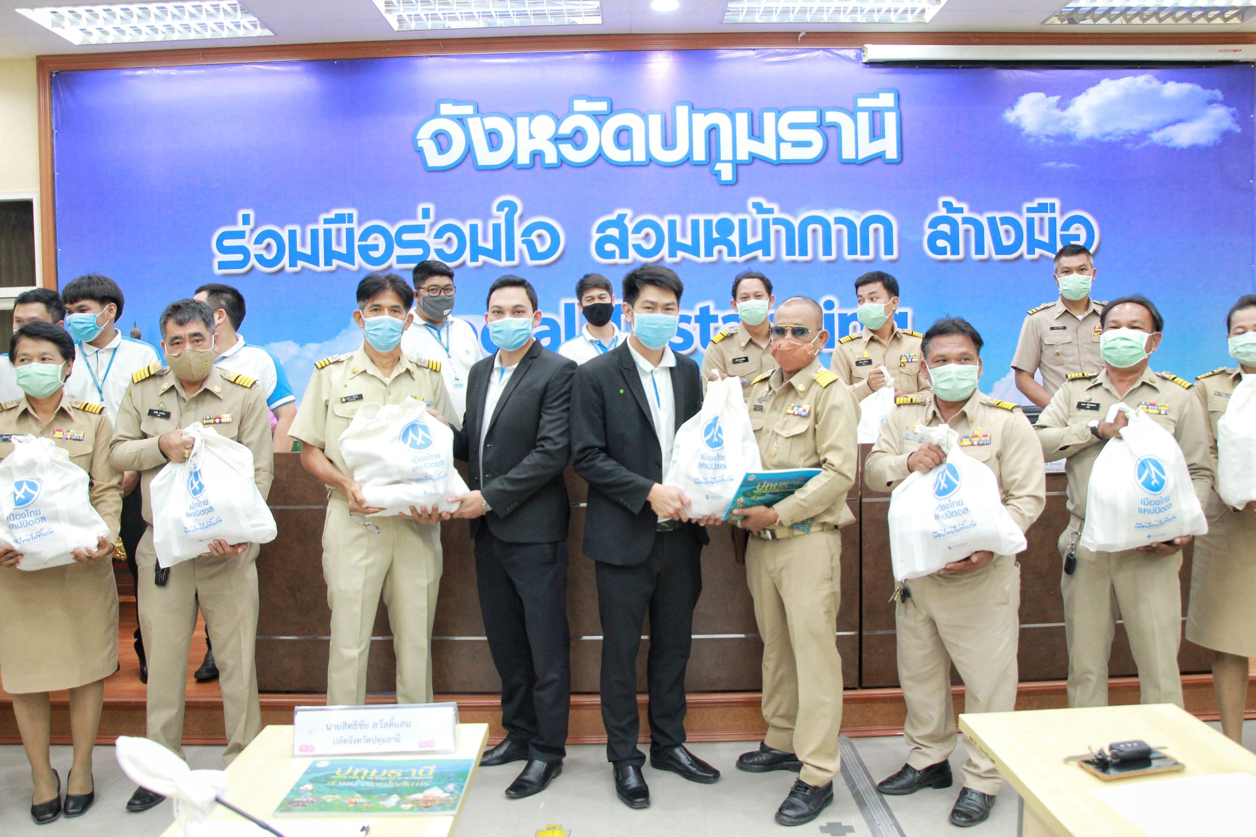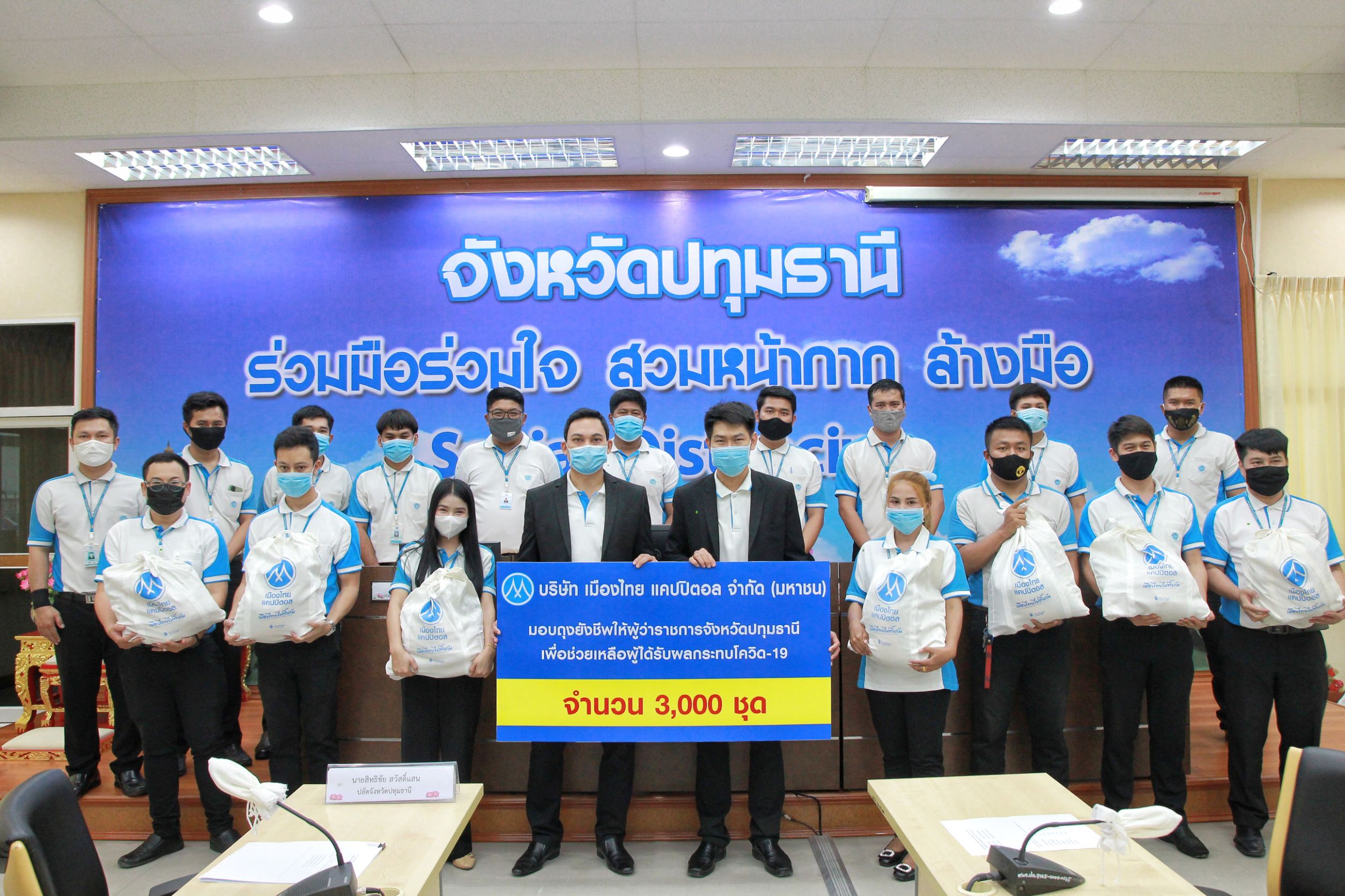 เมื่อเวลา 13.00 น. วันที่25 พ.ค.63 ที่ ห้องประชุมบัวหลวง ศาลากลางจังหวัดปทุมธานี ดร.พินิจ บุญเลิศ ผู้ว่าราชการจังหวัดปทุมธานี ประธานการประชุมมอบนโยบายและแนวทางการดำเนินงานตามมาตรการผ่อนปรนการป้องกันและควบคุมฯ โรคติดเชื้อไวรัสโคโรนา 2019 และพิธีรับมอบสิ่งของบริจาคเพื่อบรรเทาความเดือดร้อนของประชาชนผู้ ได้รับผลกระทบจากสถานการณ์การแพร่ระบาดของโรคติดเชื้อไวรัสโคโรนา 2019 (COVID -19)ในพื้นที่จังหวัดปทุมธานี จากบริษัท เมืองไทย แคปปิตอล จำกัด จำนวน 3,000 ถุง โดยจะส่งมอบถุงยังชีพ ให้กับกำนันทุกตำบลในพื้นที่จังหวัดปทุมธานี เพื่อนำไปช่วยเหลือประชาชนในพื้นที่ปทุมธานี โดยมี นายจรูญศักดิ์ สิงหเดช รองผู้ว่าราชการจังหวัดปทุมธานี นายสิทธิชัย สวัสดิ์แสน ปลัดจังหวัดปทุมธานี นางสาวธนียา นัยพินิจ หัวหน้าสำนักงานจังหวัดปทุมธานี นายอำเภอ หัวหน้าส่วนราชการ กำนันและหน่วยงานที่เกี่ยวข้องเข้าร่วมประชุม