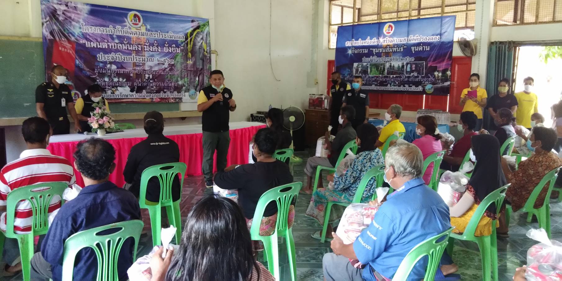 กองอำนวยการรักษาความมั่นคงภายในจังหวัดตรัง จัดกิจกรรมอบรมโครงการชุมชนสัมพันธ์และติดตามประเมินผลโครงการตามแผนมั่นคงมั่งคั่งยั่งยืน พร้อมทั้งให้ความรู้กับผู้ที่มาอบรมในการป้องกันการแพร่ระบาดโควิด -19 มอบถุงยังชีพช่วยเหลือประชาชน และมอบสิ่งของช่วยเหลือผู้ป่วยติดเตียง