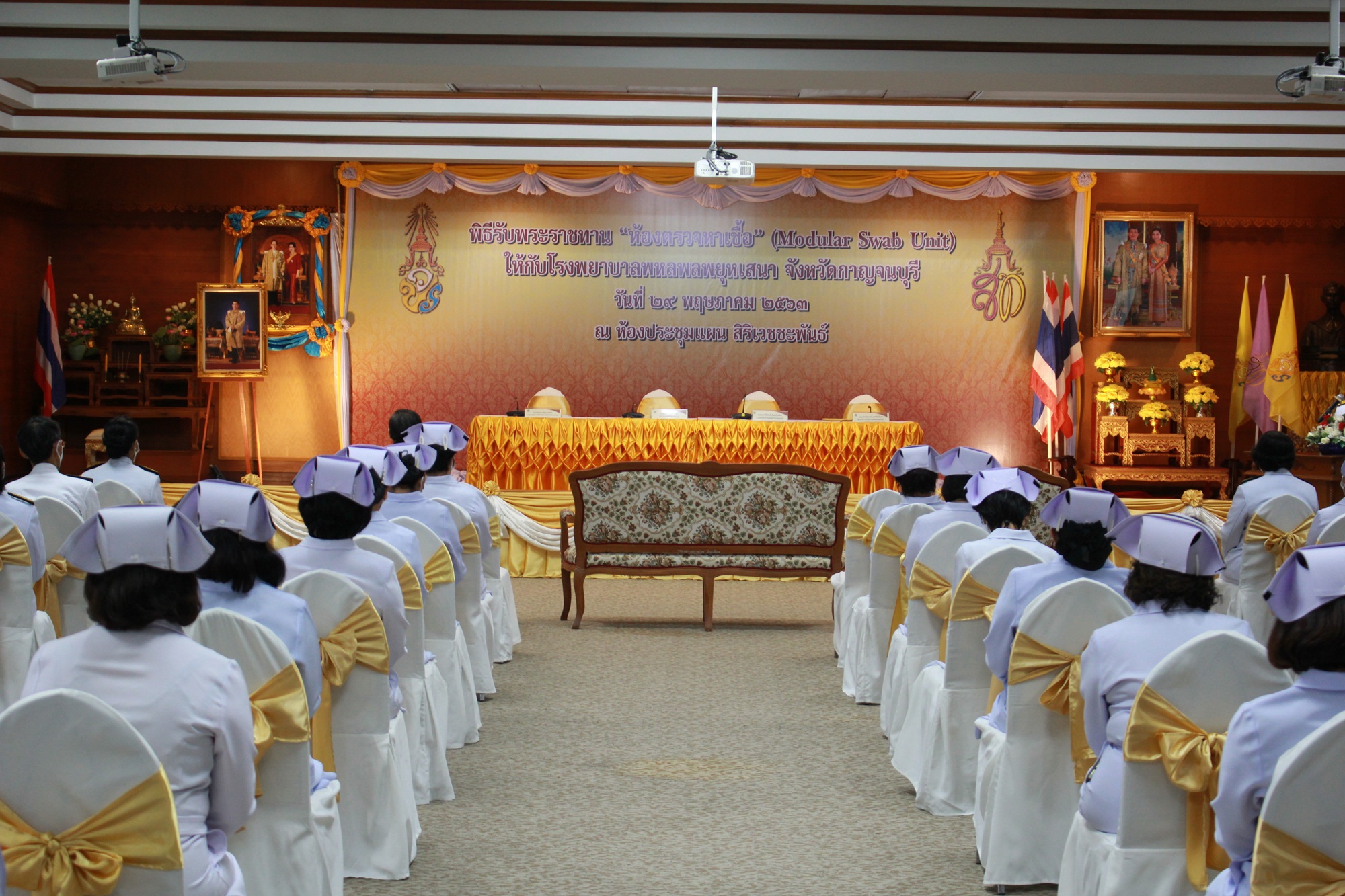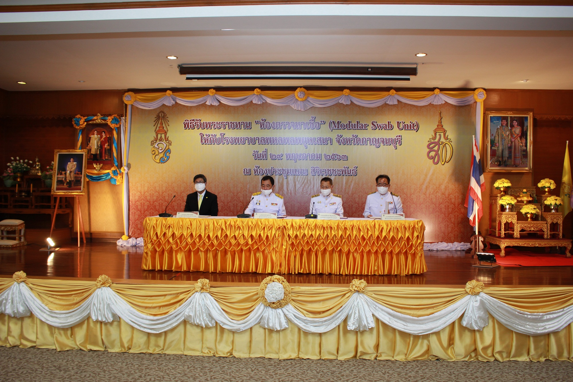 โดยมี นายจีระเกียรติ ภูมิสวัสดิ์ ผู้ว่าราชการจังหวัดกาญจนบุรี นายแพทย์นิพนธ์ พัฒนกิจเรือง นายแพทย์สาธารณสุขจังหวัดกาญจนบุรี นายแพทย์สมเจตน์ เหล่าลือเกียรติ ผู้อำนวยการโรงพยาบาลพหลพลพยุหเสนา นายประกอบ พิกุลกานตเลิศ กรรมการผู้จัดการ บริษัทไทยเคนเปเปอร์ จำกัด (มหาชน) ในเอสซีจี แพคเกจจิ้ง ร่วมพิธีรับพระราชทานห้องตรวจหาเชื้อดังกล่าว นายจีระเกียรติ ภูมิสวัสดิ์ ผู้ว่าราชการจังหวัดกาญจนบุรี กล่าวว่า “พระบาทสมเด็จพระเจ้าอยู่หัว และสมเด็จพระนางเจ้าฯ พระบรมราชินี ทรงมีพระเมตตาต่อบุคลากรทางการแพทย์ทุกคนของโรงพยาบาลพหลพลพยุหเสนา และพสกนิกรจังหวัดกาญจนบุรีอย่างหาที่สุดมิได้ ทรงพระกรุณาโปรดเกล้าฯ พระราชทาน “ห้องตรวจหาเชื้อ (Modular Swab Unit)” ซึ่งเป็นหนึ่งในโครงการเครื่องช่วยหายใจและเครื่องมือแพทย์พระราชทาน เพื่อรับสถานการณ์การแพร่ระบาดของเชื้อโควิด-19