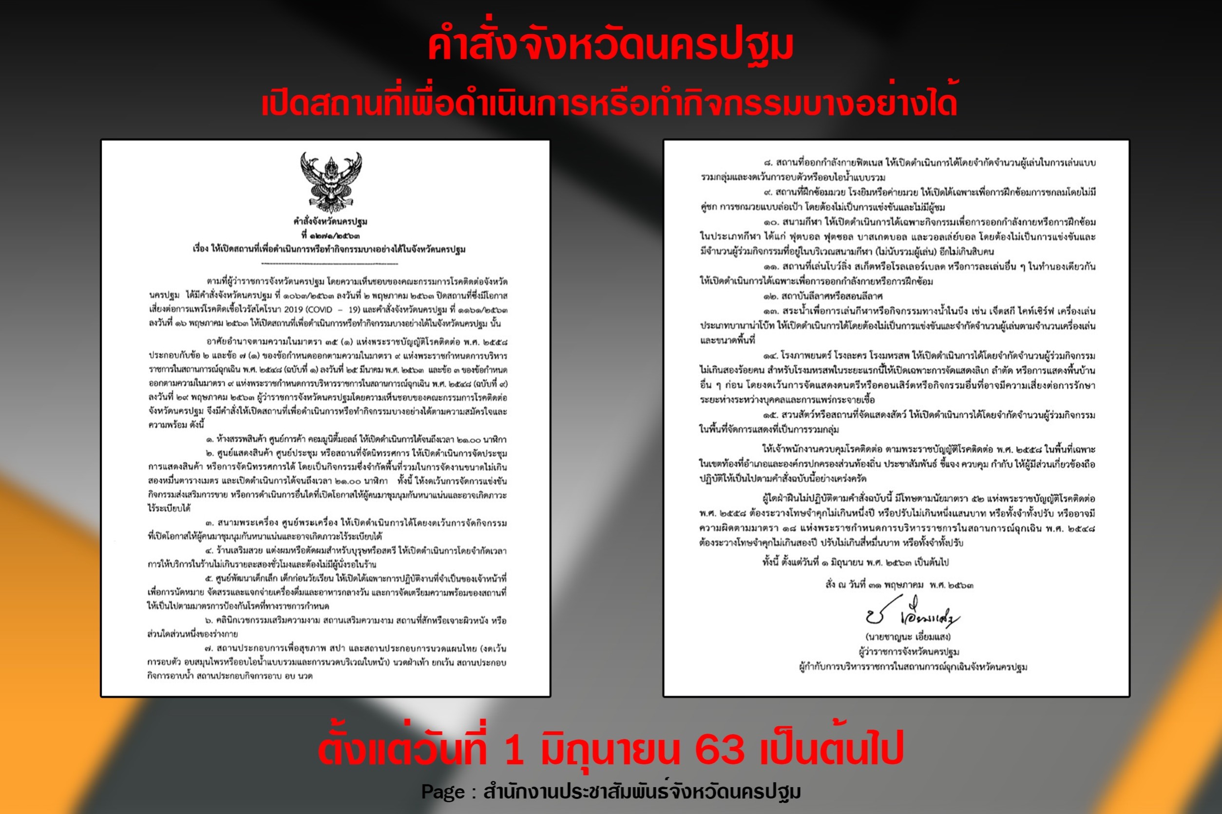 อาศัยอำนาจตามความในมาตรา 35 (1) แห่งพระราชบัญญัติโรคติดต่อ พ.ศ. 2558 ประกอบกับข้อ 2 และข้อ 7 (1) ของข้อกำหนดออกตามความในมาตรา 9 แห่งพระราชกำหนดการบริหารราชการในสถานการณ์ฉุกเฉิน พ.ศ. 2548 (ฉบับที่ 1) ลงวันที่ 25 มีนาคม พ.ศ. 2563 และข้อ 3 ของข้อกำหนดออกตามความในมาตรา 9 แห่งพระราชกำหนดการบริหารราชการในสถานการณ์ฉุกเฉิน พ.ศ. 2548 (ฉบับที่ 9)ลงวันที่ 29 พฤษภาคม 2563 ผู้ว่าราชการจังหวัดนครปฐมโดยความเห็นชอบของคณะกรรมการโรคติดต่อจังหวัดนครปฐม จึงมีคำสั่งให้เปิดสถานที่เพื่อดำเนินการหรือทำกิจกรรมบางอย่างได้ตามความสมัครใจและความพร้อม ดังนี้