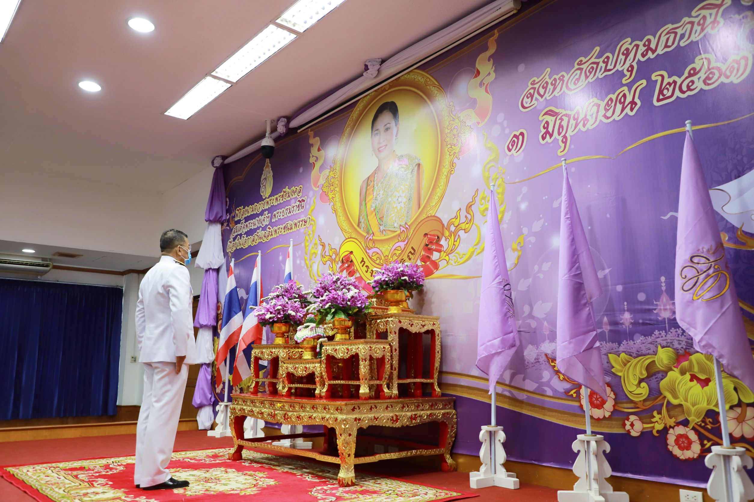 เมื่อเวลา 9.00 น.วันที่3 มิ.ย.2563 ที่ห้องประชุมศาลารักษ์ปทุม ศาลากลางจังหวัดปทุมธานี ดร.พินิจ บุญเลิศ ผู้ว่าราชการจังหวัดปทุมธานี เป็นประธานในพิธีเปิดกรวยกระทงดอกไม้ธูปเทียนแพ ถวายราชสักการะ เบื้องหน้าพระฉายาลักษณ์ สมเด็จพระนางเจ้าสุทิดา พัชรสุธาพิมลลักษณ พระบรมราชินี เนื่องในโอกาสวันเฉลิมพระชนมพรรษา 3 มิถุนายน 2563 กล่าวถวายพระพรชัยมงคล ดนตรีบรรเลงเพลงสรรเสริญพระบารมี จากนั้น ผู้ว่าราชการจังหวัดปทุมธานี ลงนามถวายพระพรชัยมงคลในสมุดลงนาม พร้อมด้วยผู้ร่วมพิธี ตามลำดับ เป็นอันเสร็จพิธี