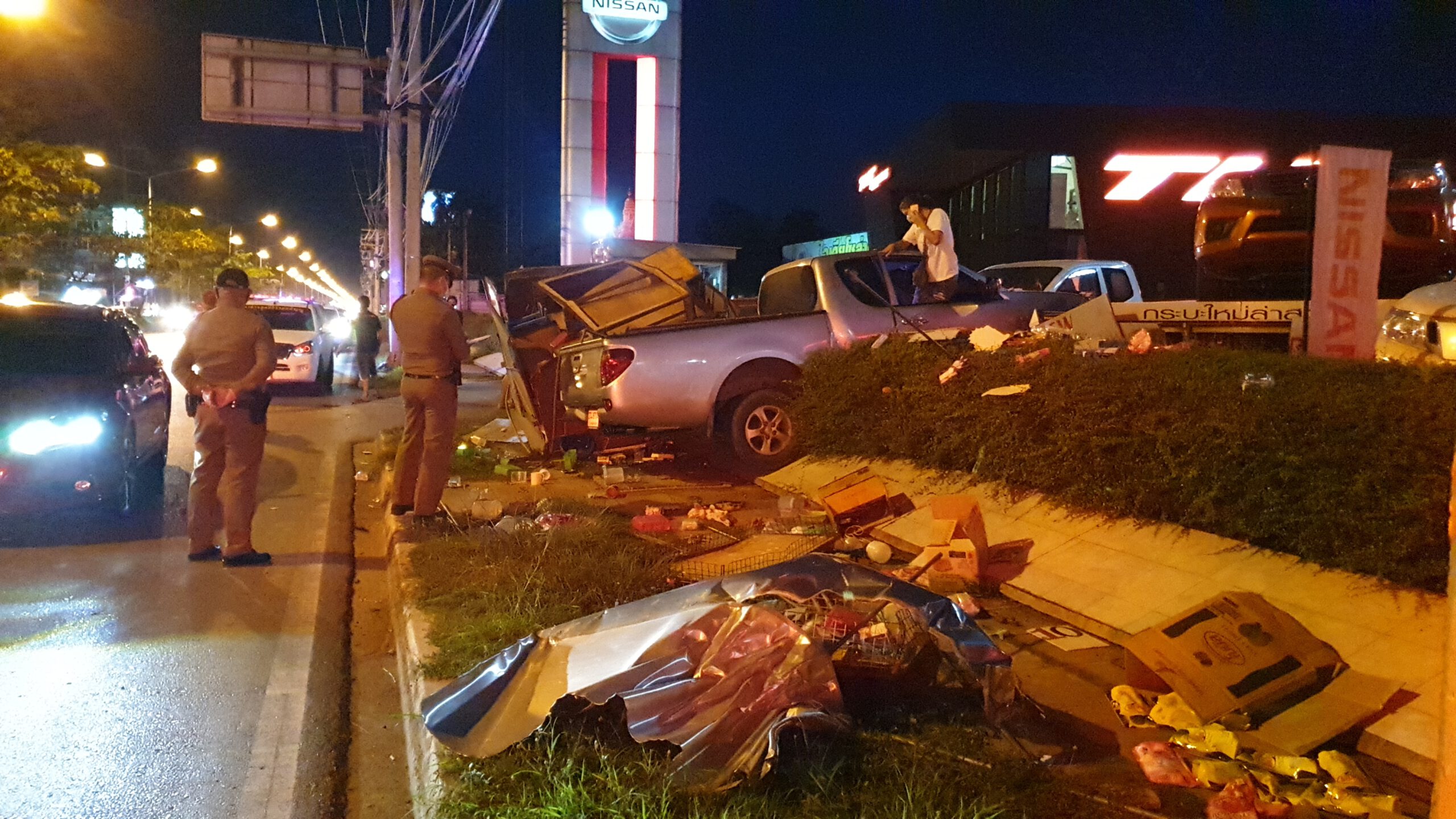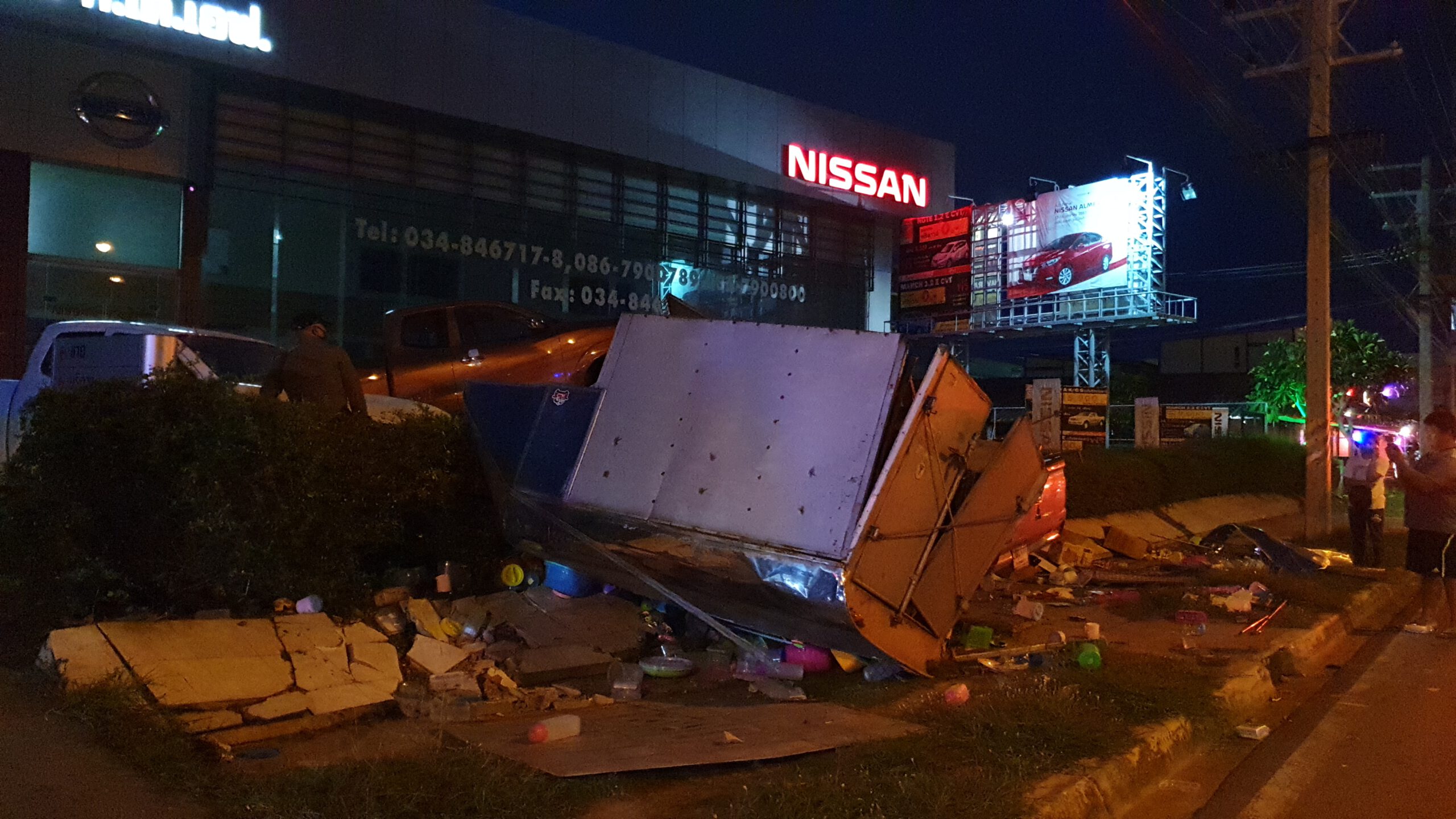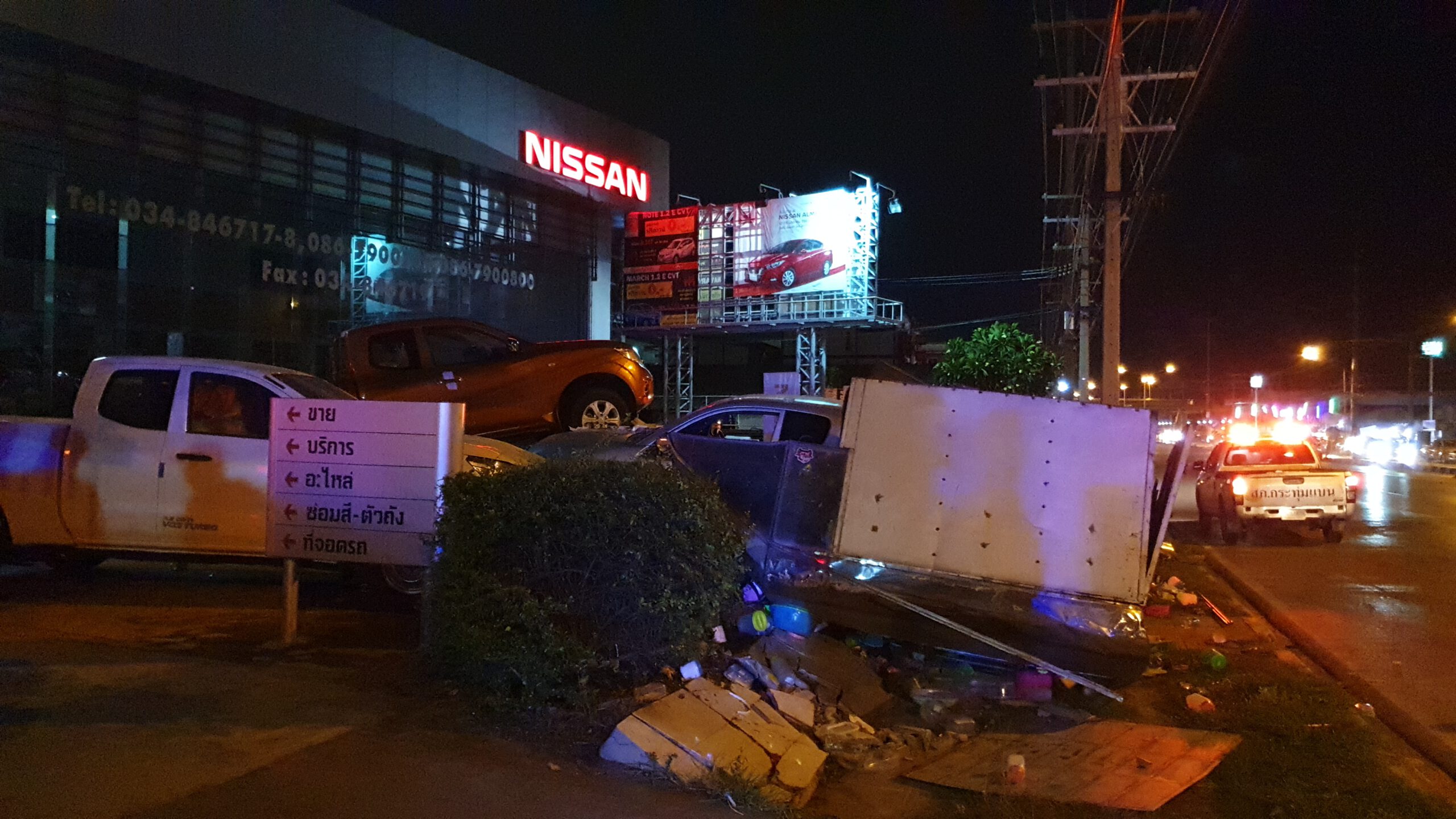 เบรกติดขัด รถพ่อค้าตลาดนัดเสียหลักพุ่งขึ้นหน้าโชว์รูมรถนิสสัน TKF