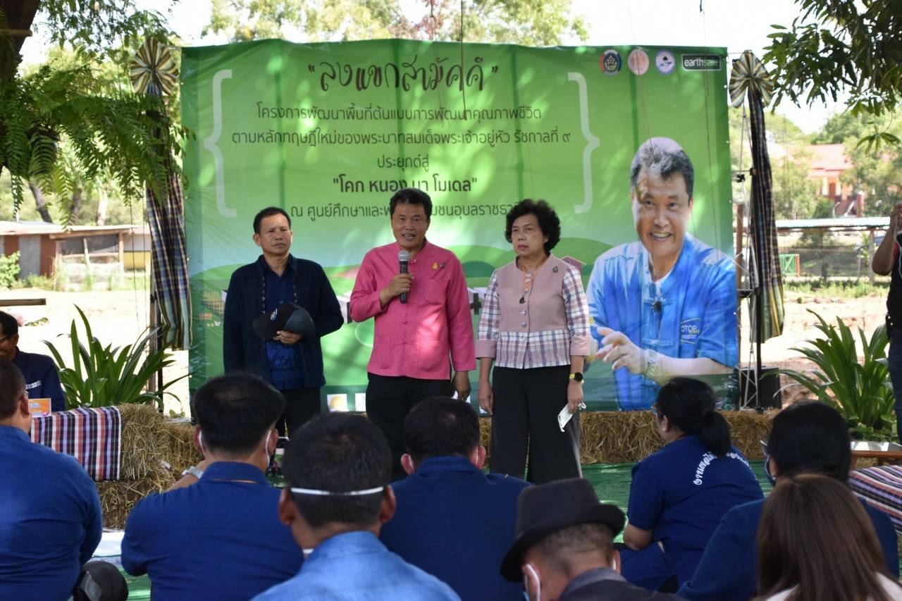เมื่อวันที่ 7 มิ.ย.ที่ศูนย์ศึกษาและพัฒนาชุมชน จ.อุบลราชธานี นายสุทธิพงษ์ จุลเจริญ อธิบดีกรมการพัฒนาชุมชน(พช.) กระทรวงมหาดไทย ดร.วันดี กุญชรยาคง จุลเจริญ ประธานสภาสตรีแห่งชาติ ในพระบรมราชินูปถัมภ์ เดินทางไปร่วมกิจกรรมเอามื้อสามัคคี บริเวณพื้นที่ต้นแบบ “โครงการพัฒนาพื้นที่ต้นแบบการพัฒนาคุณภาพชีวิต” ตามหลักทฤษฎีใหม่ของ พระบาทสมเด็จพระบรมชนกาธิเบศร มหาภูมิพลอดุลยเดชมหาราช บรมนาถบพิตร รัชกาลที่ 9 ประยุกต์สู่ “โคก หนอง นา โมเดล” โดยมี นายสฤษดิ์ วิฑูรย์ ผวจ.อุบลราชธานี พร้อมด้วย นายกเหล่ากาชาดอุบลราชธานี นายชูวิทย์ พิทักษ์พรพัลลภ ส.ส.อุบลราชธานี ประธานหอการค้าอุลราธานี เซฟอุบลราชธานี และ หน่วยงานภาคีเครือข่ายร่วมกิจกรรมจำนวนมาก