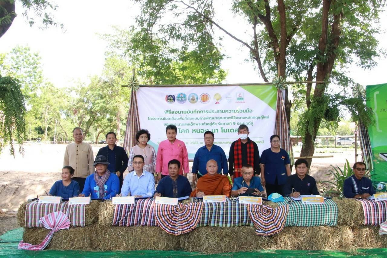 สำหรับ โครงการพัฒนาพื้นที่ต้นแบบการพัฒนาคุณภาพชีวิต” ตามหลักทฤษฎีใหม่ของพระบาทสมเด็จพระเจ้าอยู่หัว รัชกาลที่ 9 ประยุกต์สู่ “โคก หนอง นา โมเดล” จ.อุบลราชธานี บริหารจัดการแบ่งโมเดลพื้นที่เป็น 8 กลุ่มสำคัญ ที่มีความเชื่อมโยงกันในลักษณะโมเดลพอเพียง อาทิ การแบ่งพื้นที่ 30 ตร.วา สร้างบ้านพอเพียง ปลูกพืชผักที่สอดคล้องกับวิถีชีวิตตนเอง พื้นที่ 1 ไร่ทำสวนพอเพียง แบ่งสัดส่วนพื้นที่ตามปรัชญาเศรษฐกิจพอเพียงคือ 30:30:30:10 หมายถึง 30% ให้ขุดสระเก็บกักทำประมงขนาดย่อม 30% พื้นที่ทำนา 30% ปลูกพืชผักผลไม้ และ 10% เป็นที่อยู่อาศัย ซึ่งระบบนิเวศทั้งหมดจะเกื้อกูลกัน และต้นแบบ โคก หนอง นา โมเดล พื้นที่ 20 ไร่ ที่ศูนย์ศึกษาและพัฒนาชุมชน จ.อุบลราชธานี