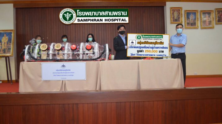 นายแพทย์ทินกร ชื่นชม รองนายแพทย์สาธารณสุขจังหวัดนครปฐม รักษาการผู้อำนวยการโรงพยาบาลสามพราน พร้อมคณะผู้บริหารและเจ้าหน้าที่ร่วมรับมอบแคปซูลเคลื่อนย้ายผู้ป่วยความดันลบ มูลค่า 250,000 บาทจากผู้แทนกลุ่มบริสำหรับเคลื่อนย้ายผู้ป่วยโควิด-19 อย่างปลอดภัย ด้วยแคปซูลเคลื่อนย้ายผู้ป่วยขนาดเล็ก เข้าเครื่อง CT Scan ได้