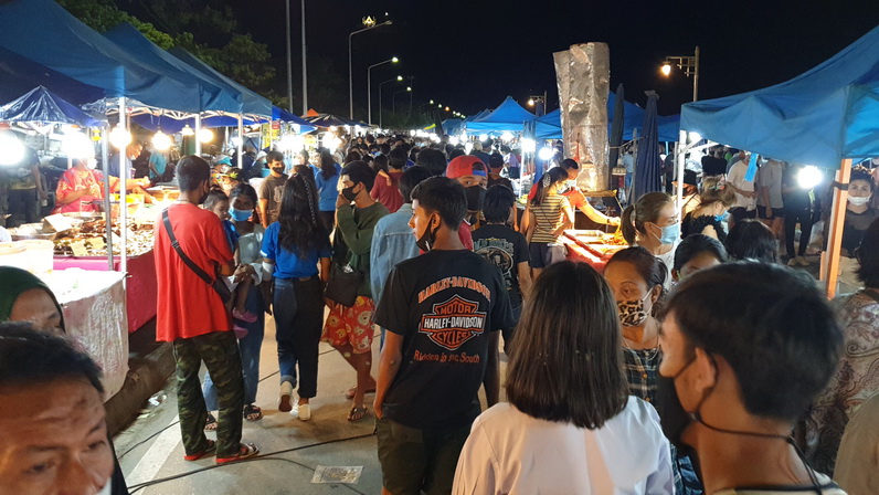 เมื่อเวลาประมาณ 19.00 น.วันที่12 มิ.ย.63 ผู้สื่อข่าวรายงานว่า ที่บริเวณตลาดนัดชุมชน ถนนคนเดินริมอ่าวประจวบ อำเภอเมือง จังหวัดประจวบคีรีขันธ์ ซึ่งเทศบาลเมืองประจวบคีรีขันธ์ โดยกองสวัสดิการสังคมเทศบาล ได้กำหนดจัดขึ้นเป็นสัปดาห์ที่ 2 หลังจากรัฐบาลได้เริ่มคลายล็อค ระยะที่ 2 โดยวันนี้มีประชาชนและนักท่องเที่ยวให้ความสนใจเดินเที่ยวตลาดจับจ่ายซื้อของกันอย่างคึกคัก เนื่องจากประชาชนรับทราบมากยิ่งขึ้นว่าได้มีการเปิดตลาดถนนคนเดินแล้ว ประกอบกับวันนี้ไม่มีฝนตกลงมาตลอดทั้งวัน ทำให้ผู้ประกอบการร้านค้ากล้าที่จะมาตั้งร้านจำหน่ายสินค้ากันมากยิ่งขึ้น โดยที่บริเวณทางเข้าตลาดเทศบาลได้จัดให้เจ้าหน้าที่เทศกิจ และเจ้าหน้าที่อปพร.คุมเข้มมาตรการป้องกันการแพร่ระบาดเชื้อไวรัส covid-19 โดยมีการติดป้ายประชาสัมพันธ์ให้กับประชาชนและนักท่องเที่ยวทุกคนที่มาเดินตลาดได้รับทราบและปฏิบัติตาม หากไม่สวมหน้ากากอนามัย ห้ามเข้าตลาด!