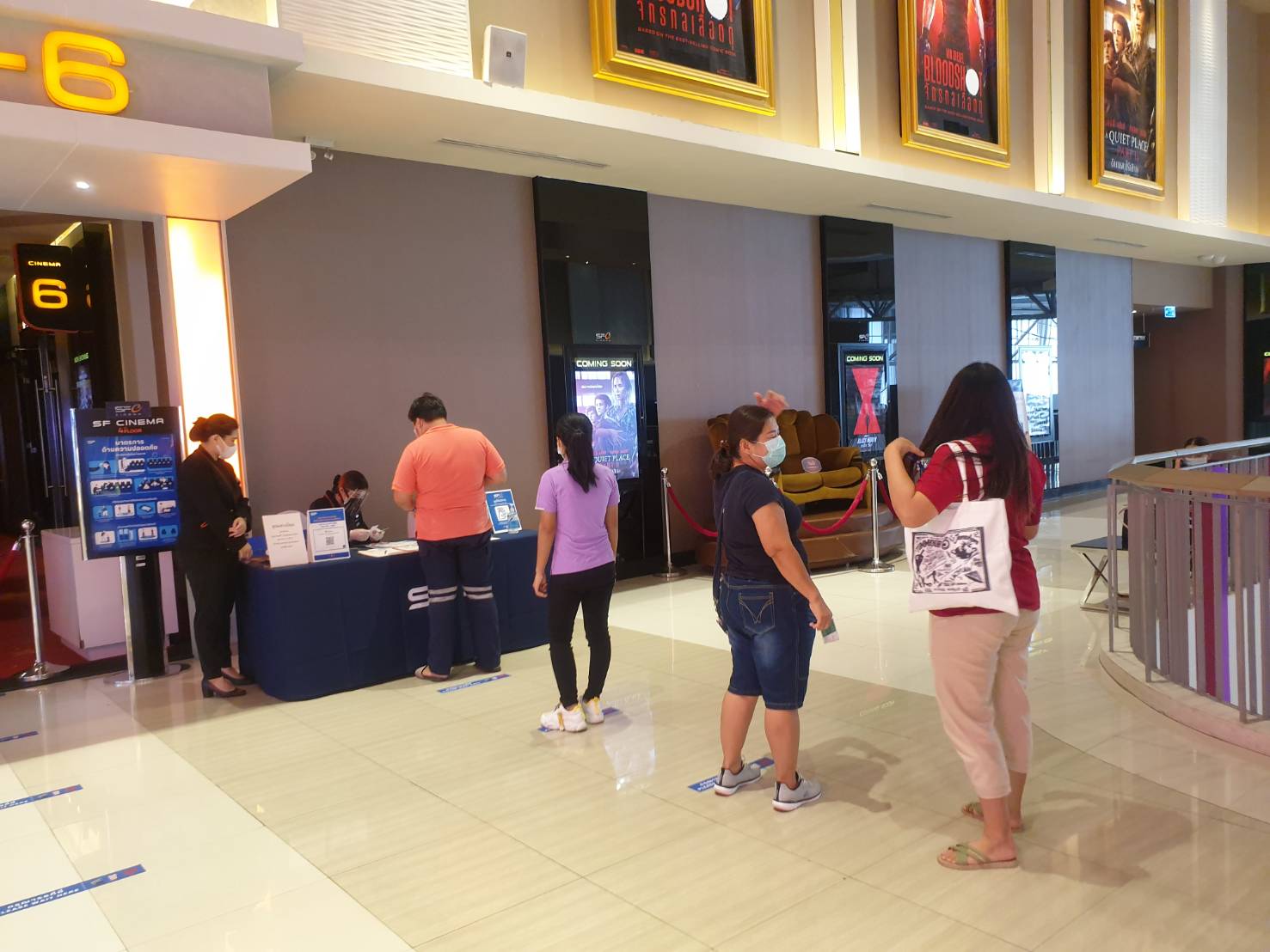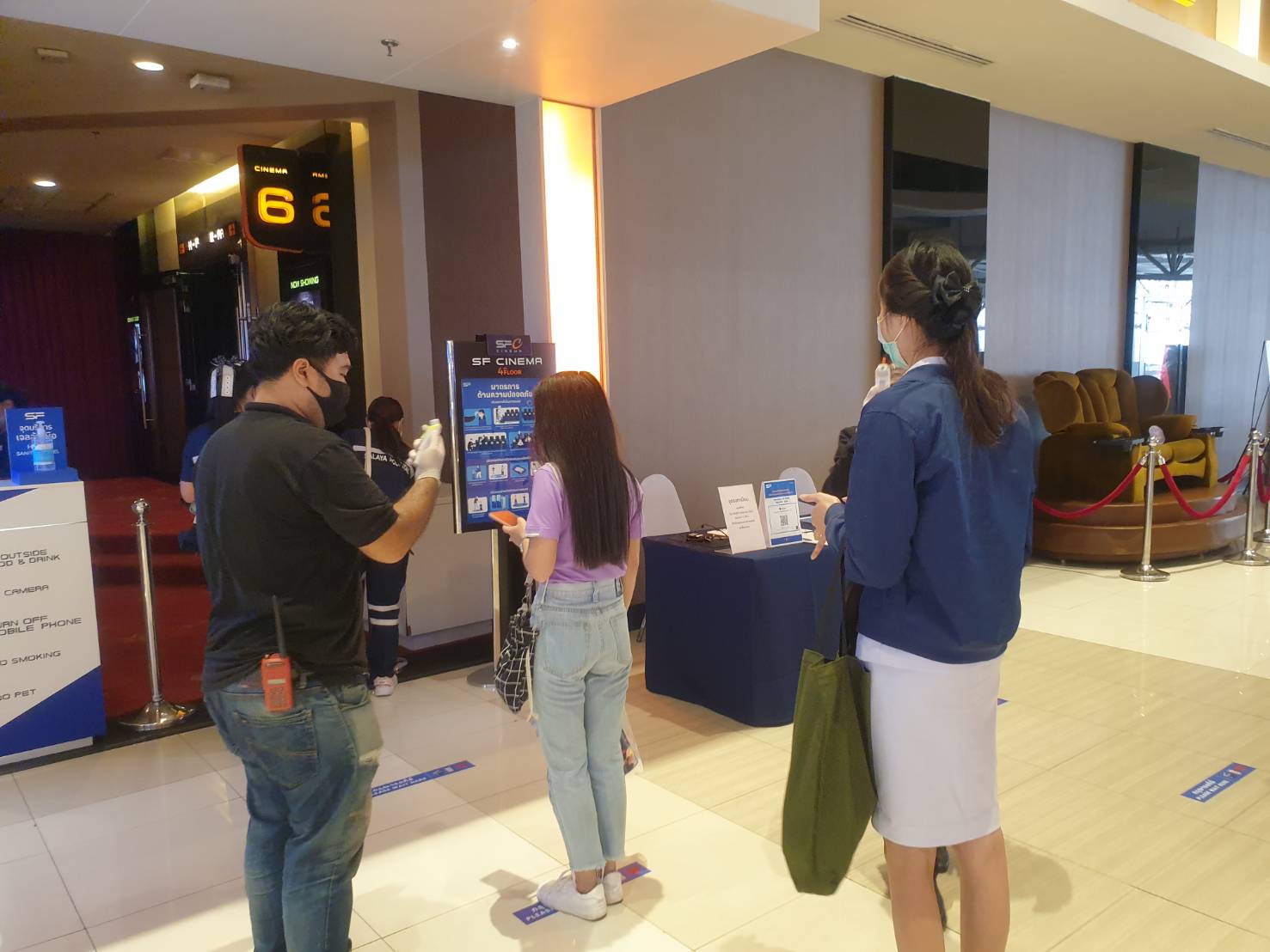 - การดูแลความสะอาดและความปลอดภัย บริเวณโรงภาพยนตร์ – ผู้ใช้บริการทุกคนต้องสวมใส่หน้ากากอนามัย หรือหน้ากากผ้าตลอดเวลา – ลงทะเบียนเมื่อใช้บริการผ่านระบบไทยชนะ หรือลงชื่อและข้อมูลติดต่อทุกครั้ง – กำหนดจุดยืนรอคิว และจุดนั่งรอชมภาพยนตร์ เพื่อรักษาระยะห่างระหว่างบุคคล – มีการจัดเตรียมเจลแอลกอฮอล์ให้บริการทุกจุดอย่างทั่วถึง – พนักงานทำความสะอาดทุกจุดสัมผัสด้วยน้ำยาฆ่าเชื้อทุก 30 นาที
