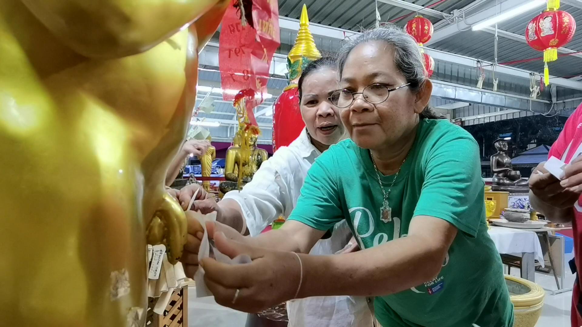 ขณะที่ นักแสวงโชครายหนึ่ง เป็นแม่ค้าขายของตามตลาดนัด ชาวสมุทรสงคราม กล่าวว่า ตนได้เคยเดินทางเข้ามาที่ศาลาอาตี๋สำเภาทอง และ ไอ้ไข่ เด็กวัดเจดีย์ แห่งนี้เป็นประจำ เพราะมาขอให้ค้าขายดี และก็ได้สมดังใจ ในวิกฤตินี้ลงทุนมามาก และก็ต้องการให้ขายไม่ขาดทุน ตนทราบว่าที่นี่มี อาตี๋สำเภาทอง และ ไอ้ไข่ เด็กวัดเจดีย์ จึงได้เดินทางมากรายไหว้ขอพร และก็สมหวัง จะซื้อพวงมาลัยมาถวายทุกวัน และเข้ามาขอเลขเด็ดในอ่างน้ำมนต์ โดยได้นำเลขที่เห็นไปซื้อสลากกินแบ่งรัฐบาลงวดที่ผ่านมา ตนและคนในครอบครัวได้ถูกรางวัลรับเงินไปนับแสนบาท และค้าขายดีขึ้น จึงนำประทัด น้ำแดง ป๋องแป๋ง พวงมาลัย ธูป เทียน มากราบไหว้เพื่อแก้บนและขอพรจาก อาตี๋สำเภาทอง และ ไอ้ไข่ เด็กวัดเจดีย์ ในวันนี้ ตนมีความรักและศรัทธา อาตี๋สำเภาทอง และ ไอ้ไข่ เด็กวัดเจดีย์ และสิ่งศักดิ์สิทธิ์ ภายในวัดแห่งนี้เป็นอย่างมาก การที่ตนเข้ามามักจะถูกรางวัลทุกครั้ง และขายของดีขายได้กำไร เชื่อว่า อาตี๋สำเภาทองและไอ้ไข่ เด็กวัดเจดีย์ ให้โชคและช่วยเหลือคนที่เดือดร้อนได้จริงๆ