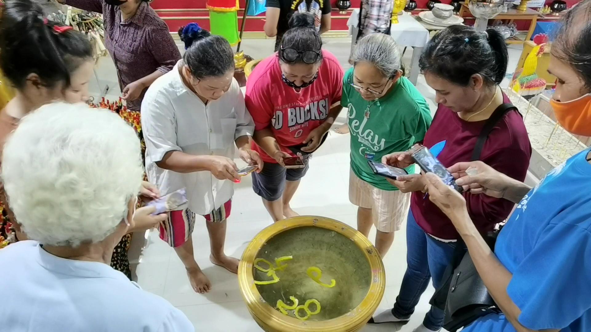 แต่จุดที่ได้รับความสนจากนักแสดงโชคคือ การส่องดูตัวเลขที่ลอยเหนือผิวน้ำภายในอ่างน้ำมนต์ ที่ตั้งอยู่ด้านหน้า อาตี๋สำเภาทอง และ ไอ้ไข่เด็กวัดเจดีย์ ซึ่งปรากฏเป็นตัวเลขลอยอยู่เหนือน้ำ ซึ่งตัวเลขจะลอยวนเวียนไปเรื่อยไม่อยู่กับที่ตลอดเวลา ทั้งหมดมีเลข 6 ตัว คือ 0, 2, 4, 7, 8, 9 หรือ 6 ส่วนใหญ่จะลอยตัวจับเป็น เลข 2 ตัว 3 ตัว คือ 407 และ 28 ส่วนเลข 9 หรือ 6 จะลอย แยกออกจากกัน โดยตัวเลขจากน้ำตาเทียนสีเหลืองซึ่งเกิดจาก การทำพิธีจรดตัวเลขเรียกว่า เลขโสฬสสะระตะ เป็นพิธีกรรมโบราณที่สืบทอดกันมา ซึ่งไม่พลาดที่บรรดานักแสวงโชคจะนำโทรศัพท์มือถือขึ้นมาถ่ายภาพเก็บไว้และไปหาซื้อสลากรางวัล
