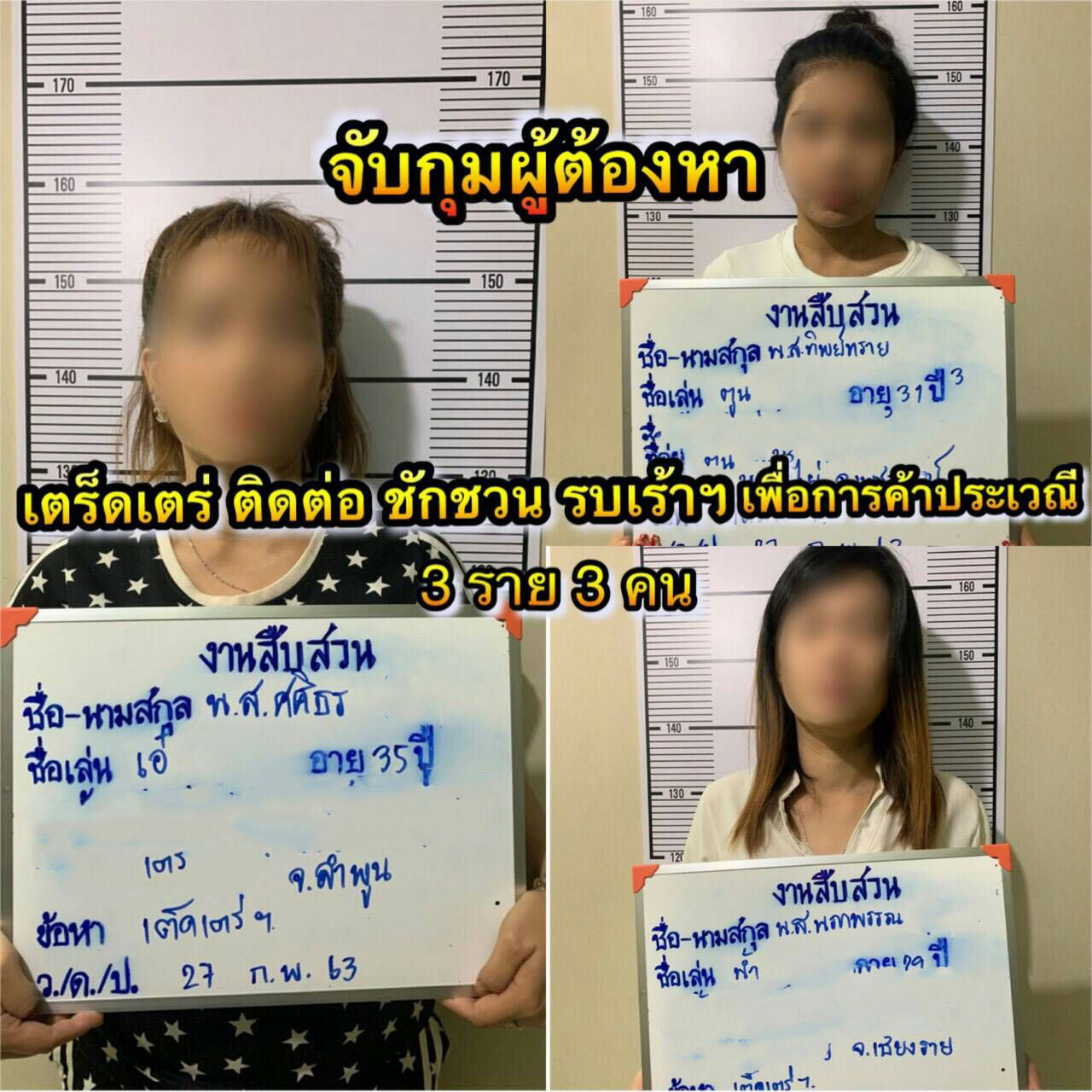 วันที่ 3 ม.ค. 63 จับกุมจำนวน 2 ราย วันที่ 18 ก.พ. 63 จับกุมจำนวน 2 ราย วันที่ 24 ก.พ. 63 จับกุมจำนวน 1 ราย วันที่ 27 ก.พ.63 จับกุมจำนวน 3 ราย
