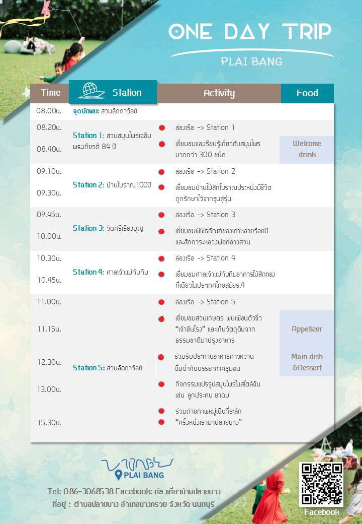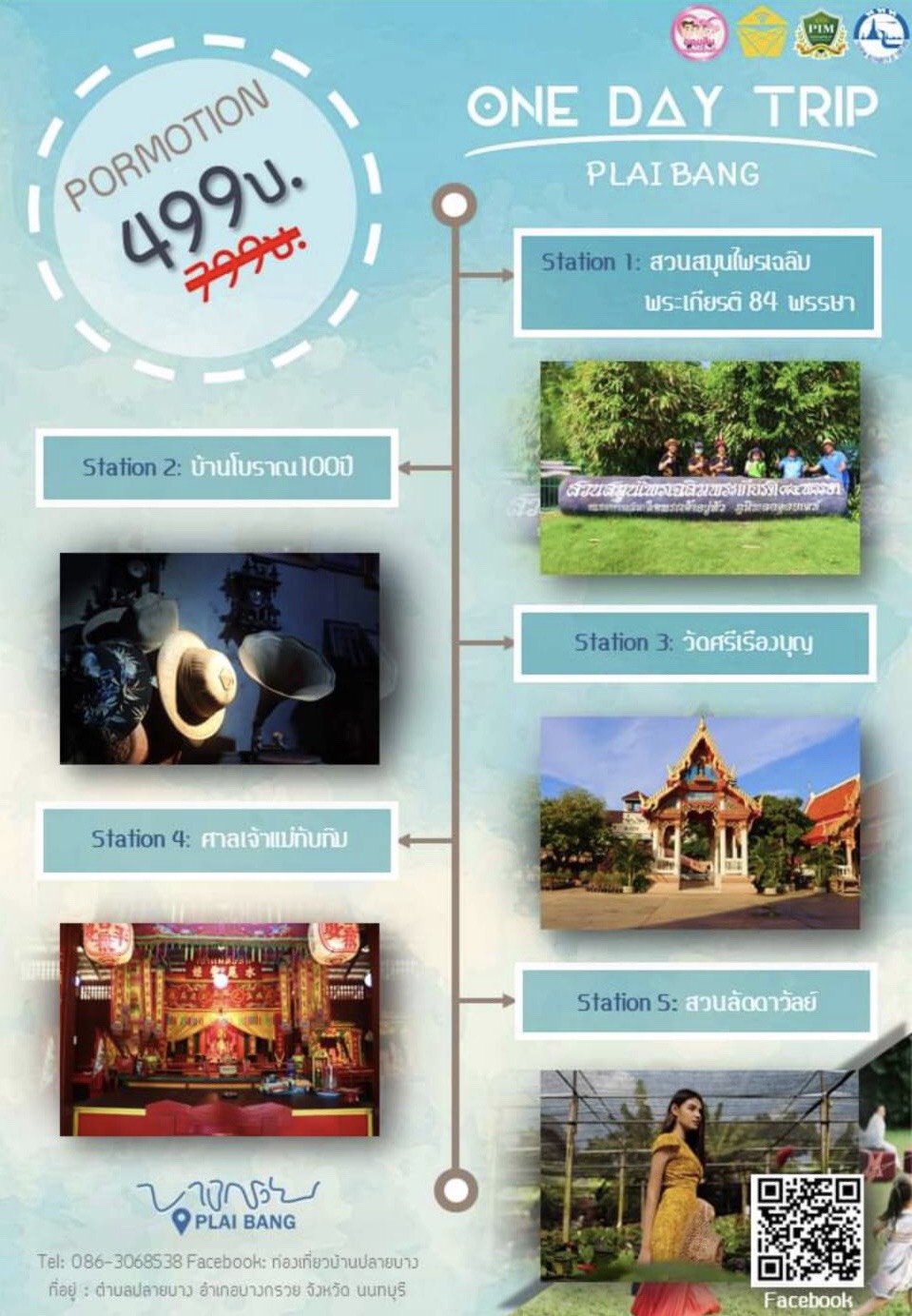 ทั้งนี้ นักท่องเที่ยวที่มีความสนใจเข้าร่วมกิจกรรม One Day Trp “ท่องเที่ยววิถีนนท์ วิดีใหม่ สไตล์คนปลายบาง”สามารถติดต่อสอบถามได้ที่ เบอร์โทร.086 306 8538 หรือ facebook fanpage ท่องเที่ยว เชิงนิเวศน์และวัฒนธรรม วิถีชุมชน คนปลายบาง