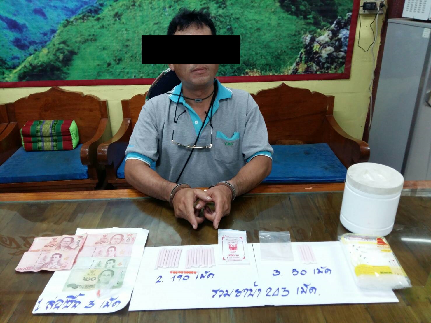 เจ้าหน้าที่ชุดจับกุม สภ.เชียงดาวฯพ.ต.ต.อภิชัย พันธุ์คงชื่น สว.สส.ฯ, ร.ต.อ.คมสัน เสนากิตต์, ร.ต.อ.ประเสริฐ กระทู้, ร.ต.อ.ภาคภูมิ มณีจักร์ ,ด.ต.สลิล พิมพิรัตน์ ,ด.ต.ศักดิ์ชัย เตอเก,ด.ต.สมชาย เชื้อตรง, ด.ต.วิเชียร พรมคำตัน, ด.ต.ยรรยง คำตื้อ, ด.ต.อุบล แก้วเป็ง ,ส.ต.อ.พลวัฒน์ สุวรรณคำมูล ,ส.ต.ท.ณภัทร อินกงลาด ร่วมจับนายแดนชัยหรือแดน นารายณ์ อายุ 42 ปี หมู่ 2 ต.แม่นะ อ.เชียงดาว จ.เชียงใหม่ จำหน่ายยาบ้า+เสพยาบ้า ของกลาง ยาบ้า 243 เม็ดเจ้าหน้าที่ตำรวจชุดจับกุมได้รับแจ้งจากสายลับว่า นายแดนหรือแดน นารายณ์ มีพฤติการณ์ลักลอบขายและเสพยาบ้า(เมทฯ)ที่บริเวณบ้านที่นายแดนชัยฯ อาศัยอยู่ และนายแดนชัยฯ พึ่งพ้นโทษออกจากเรือนจำออกมาได้ประมาณ 5-6 เดือนที่ผ่านมา