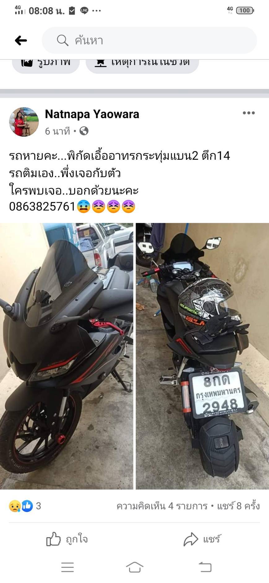 นางสาวนาฎนภา เยาวะระ ผู้เสียหายเล่าว่า รถจักรยานยนต์ของตนนั้น จอดไว้บริเวณที่จอดรถของอาคารซึ่งก็อยู่ติดกับด้านหลังห้องของตน โดยเมื่อเช้าวานนี้ตนเองกำลังจะออกไปทำงาน จึงพบว่ารถที่จอดไว้หายไปก็ได้แจ้งให้เจ้าหน้าที่ตำรวจมาตรวจสอบ พร้อมกับเปิดกล้องวงจรปิดดูทำให้เห็นว่าคนร้ายเป็นชายเข้ามาลักรถไปตอนเวลาประมาณตี 5 ครึ่งของวันที่ 18 นั่นเอง หลังจากนั้นจึงได้เข้าแจ้งความที่ สภ.กระทุ่มแบน ทั้งนี้ก็อยากจะให้เจ้าหน้าที่ตำรวจช่วยติดตามตัวคนร้ายแล้วเอารถกลับมาคืนให้ตนด้วย เพราะกว่าจะทำงานผ่อนรถหมดนั้น ทั้งเหนื่อยและลำบากมาก นี่ก็กำลังจะเป็นไทผ่อนงวดสุดท้ายแล้วแต่รถกลับมาหายเสียก่อน ในส่วนของโจรมิจฉาชีพที่ขโมยไปก็อยากจะวอนให้เห็นใจคนที่เขาทำมาหากินด้วยความสุจริต กว่าที่จะผ่อนรถได้มาแต่ละคันนั้น ก็เป็นไปด้วยความยากลำบาก